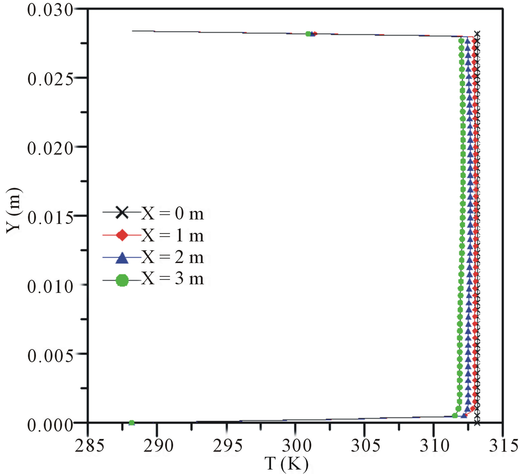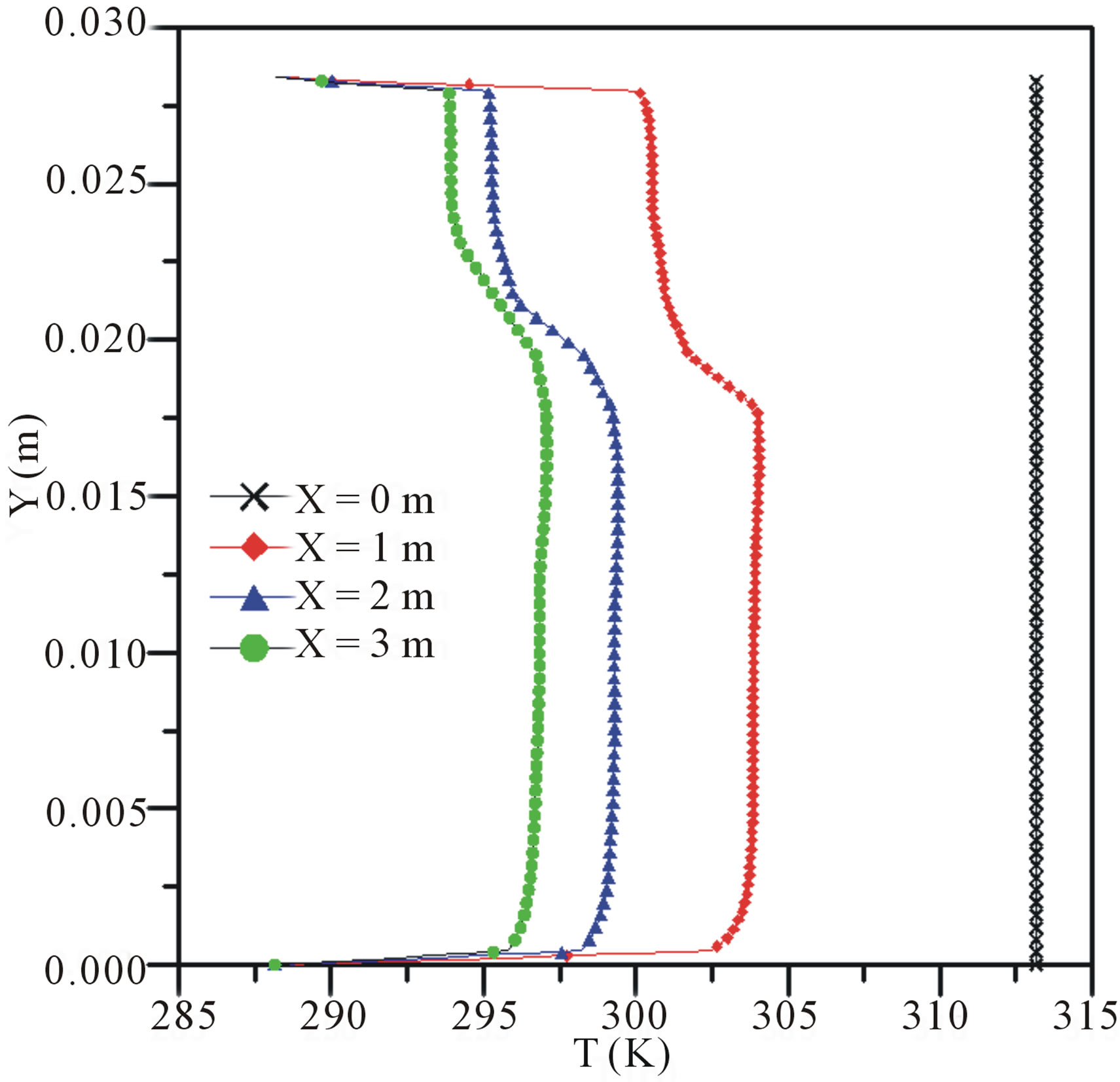 Figure 7. Water temperature profiles at four axial positions (X) along the pipe, at Z = 0 m (Case 04).