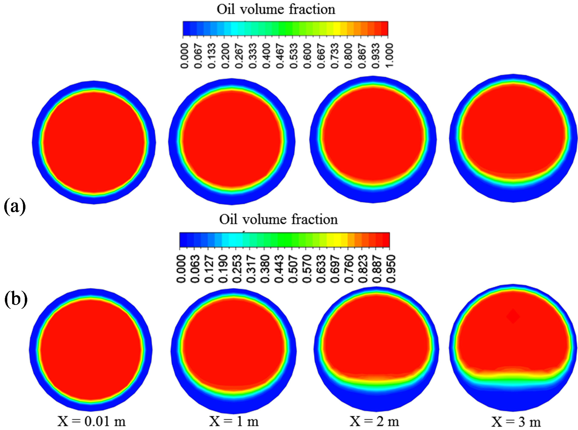 Figure 4. Oil volume fraction field in two-phase flow (a) and three-phase flow (b), at different YZ cross sections along the pipe.