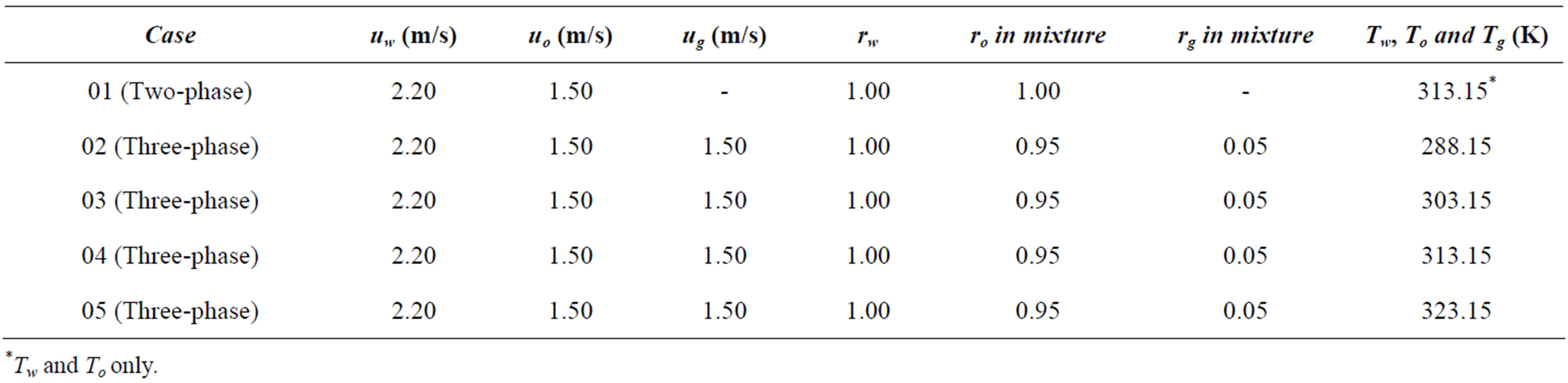 To study the three-phase flow within a horizontal pipe following conditions have been considered: