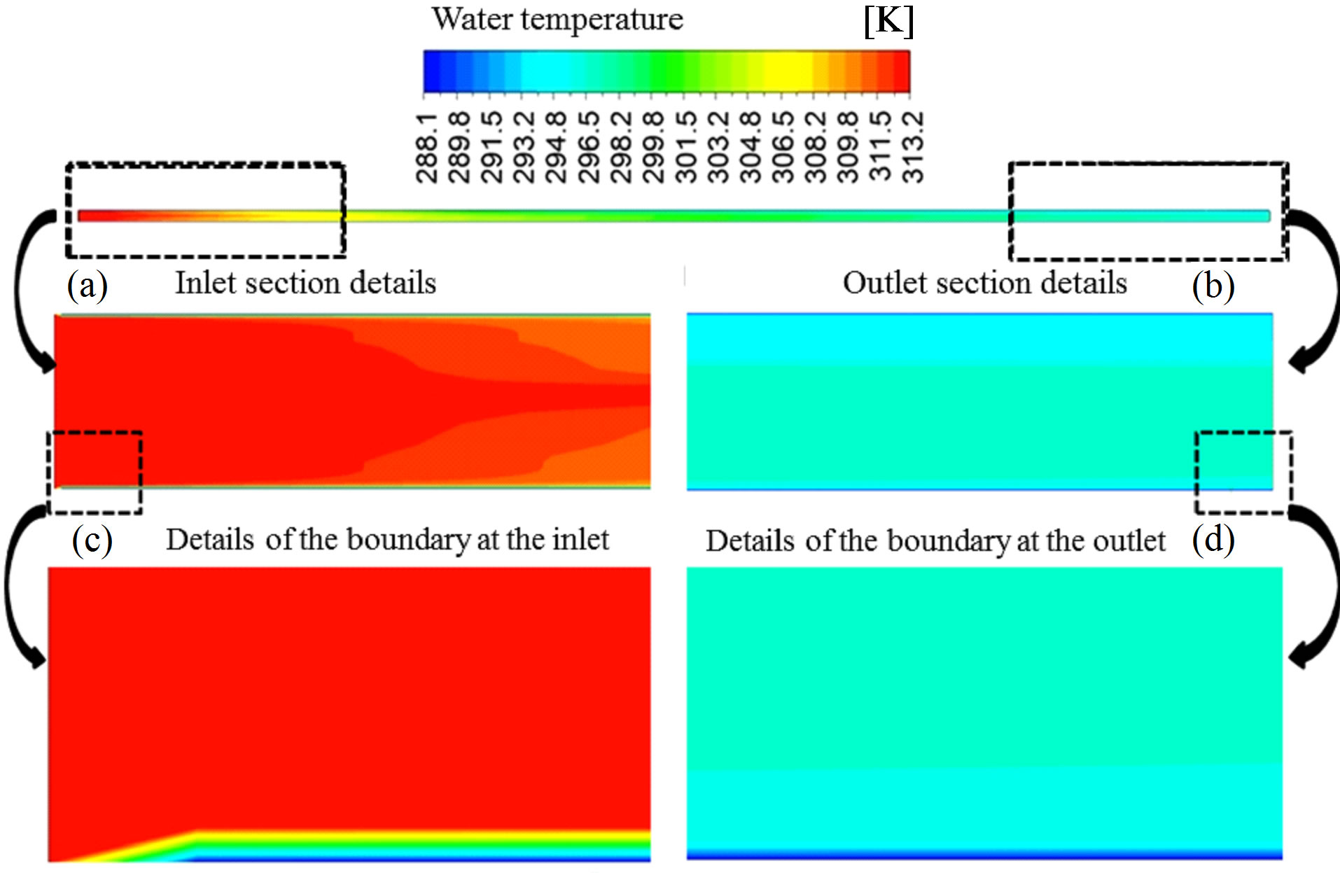 Figures 9 and 10 present the details of temperature fields of water and oil, at the inlet (Figure 9(a)) and at the outlet (Figure 9(b)) sections near the pipe wall, respectively. It is in this region where the main temperature changes occur. It is possible to visualize the formation of the thermal boundary layer, near the pipe entrance, (Figures 9(c) and (d)), which is due to the temperature difference between the wall and the adjacent fluid. Figures 9 and 10, therefore, corroborate that the temperature distributions in oil and water phases differ in the pipe and that water undergoes a higher decrease in its temperature.