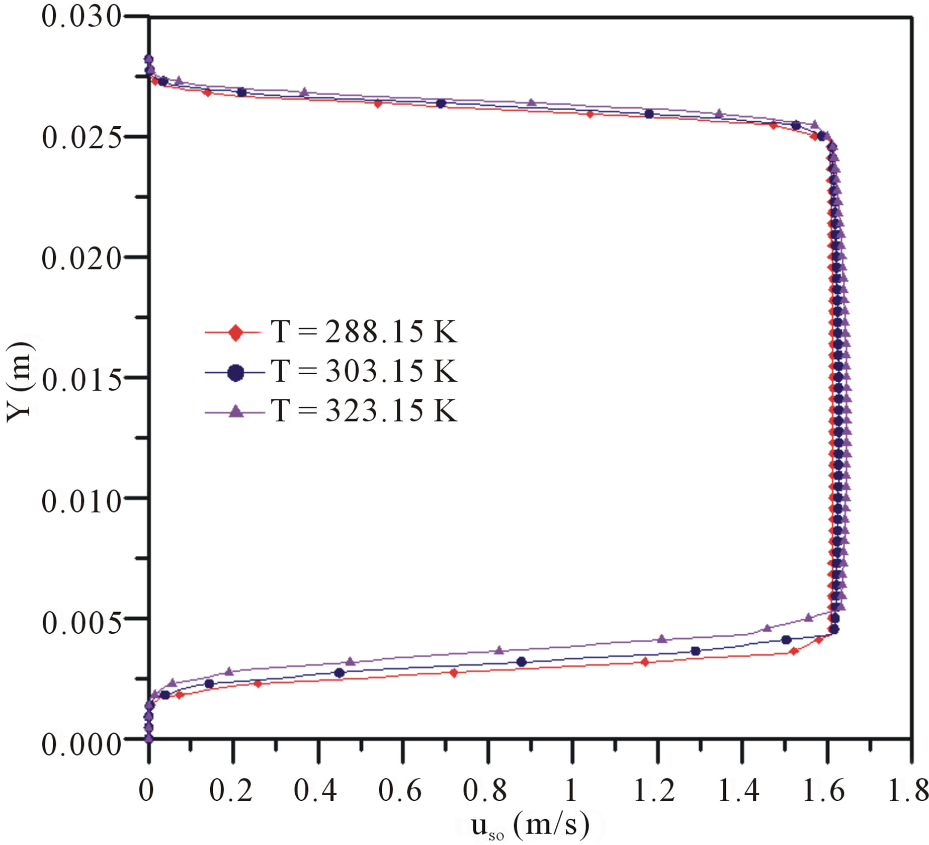 Figure 5. Superficial velocity profiles of the oil at different temperatures (X = 1 m and Z = 0 m).