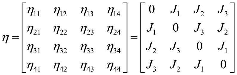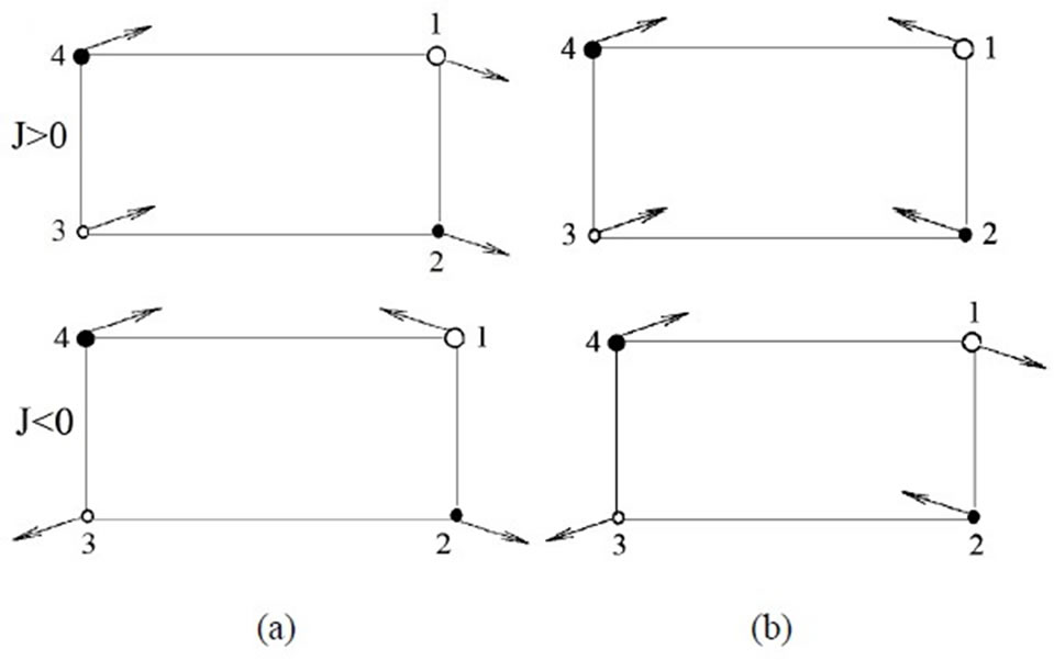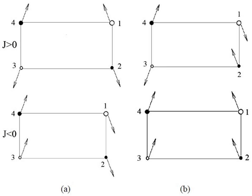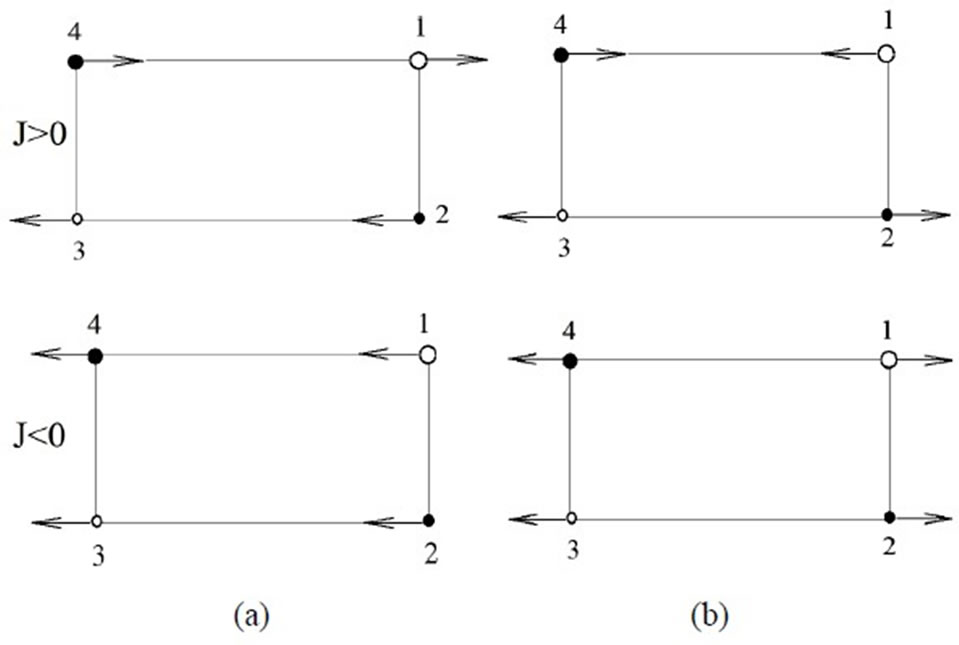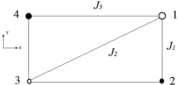 We consider the four magnetic ions (labeled as 1, 2, 3 and 4) localized rectangular lattice displayed in Figure 1 in which one shows also the corresponding exchange integrals. The ions occupy the positions: 1) x, y; 2) x, –y; 3) –x, –y; 4) –x, y. Our exchange integrals J1, J2 and J3 correspond to