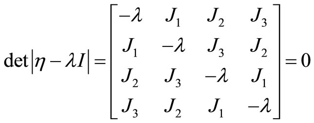 We have to find the eigenvectors and eigenvalues of the matrix in Equation (14). The solution to this homogenous equations system depends on the satisfaction of the following condition: