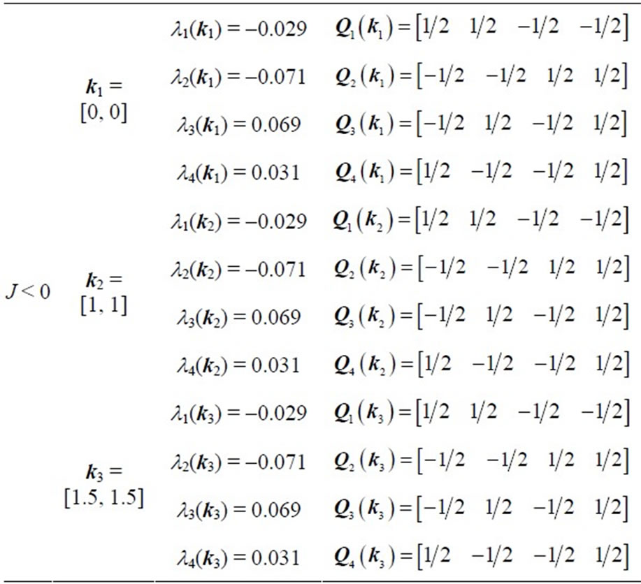 Table 1. Computationally obtained eigenvelues and their eigenvectors for given k-vectors and the positive and negative values of exchange parameters.
