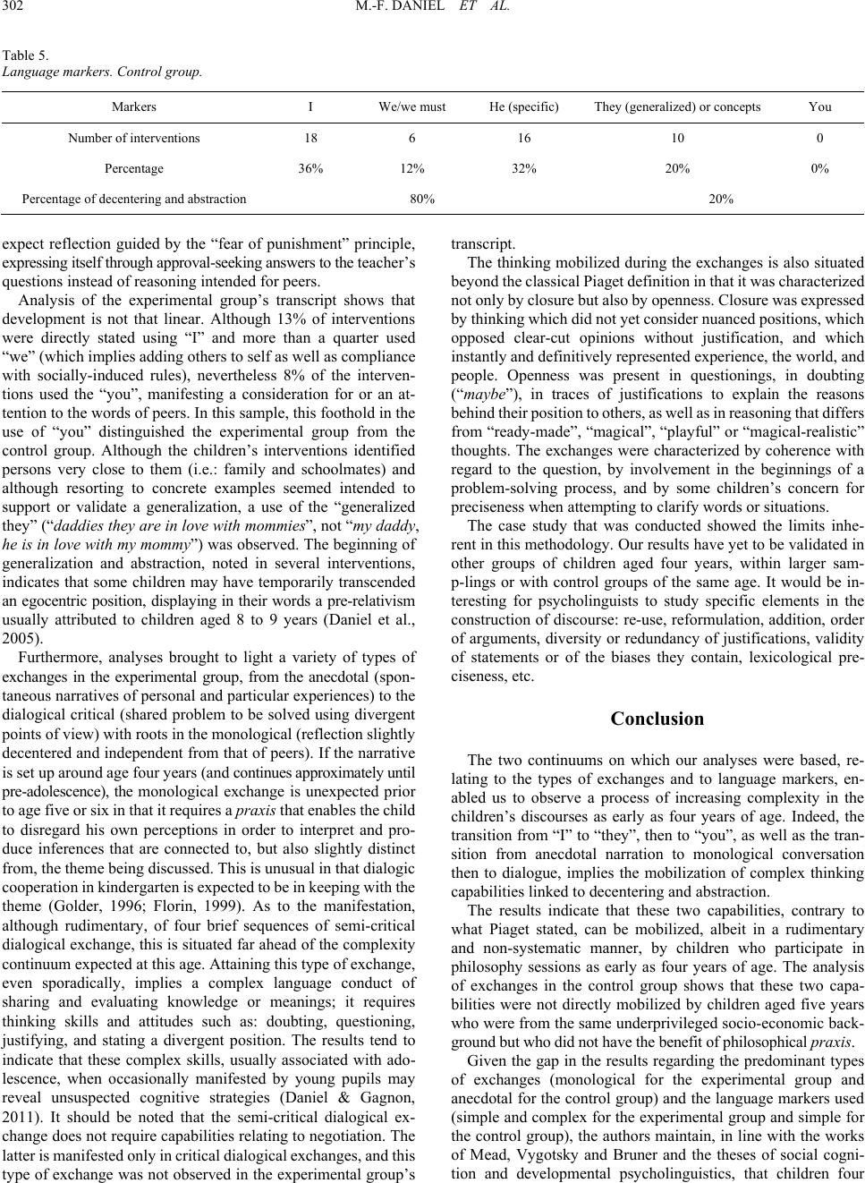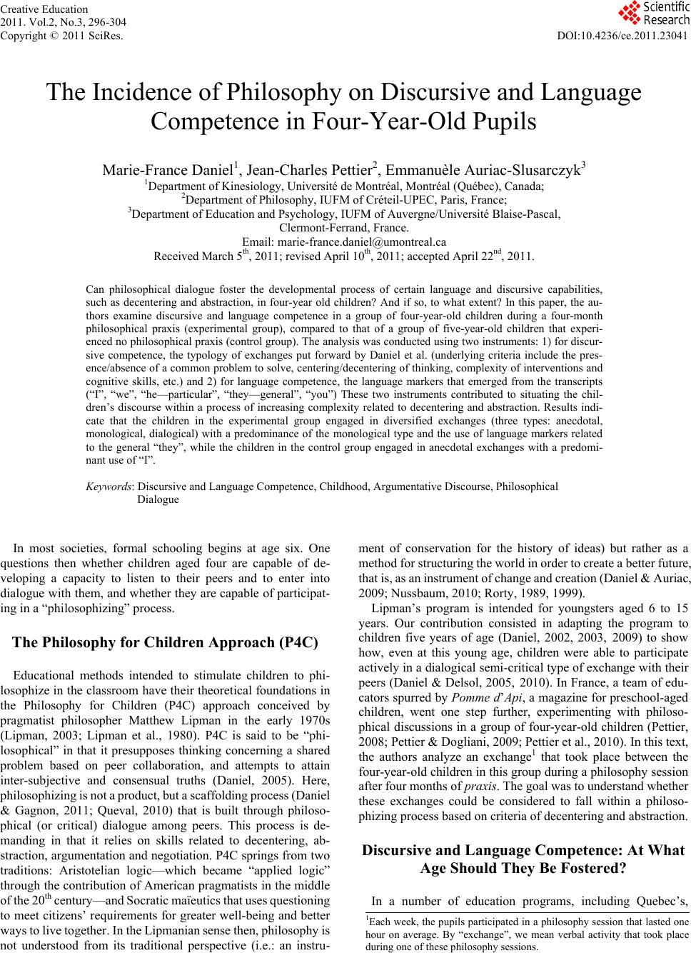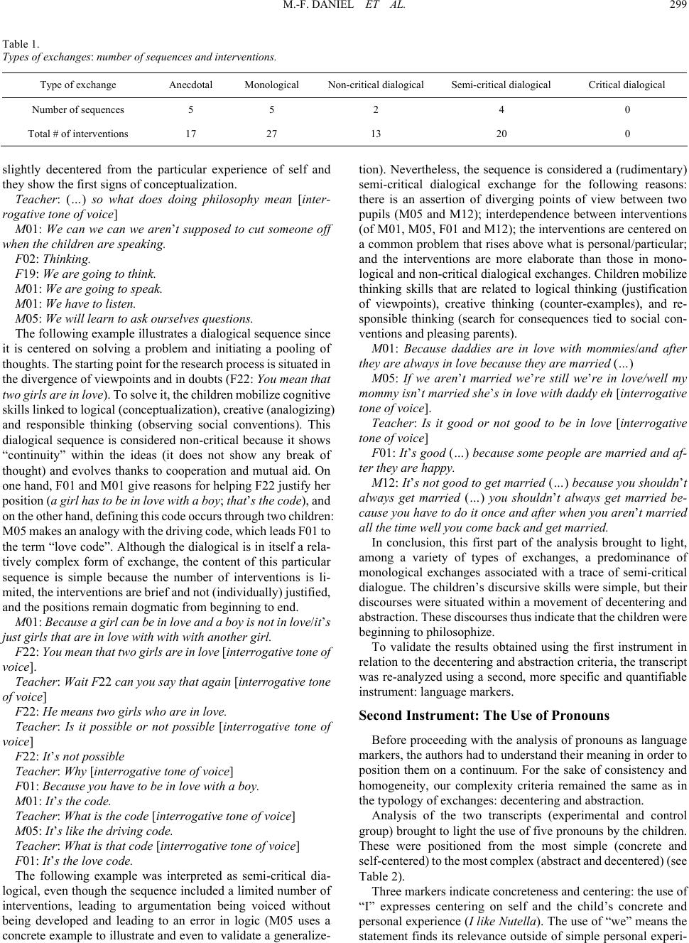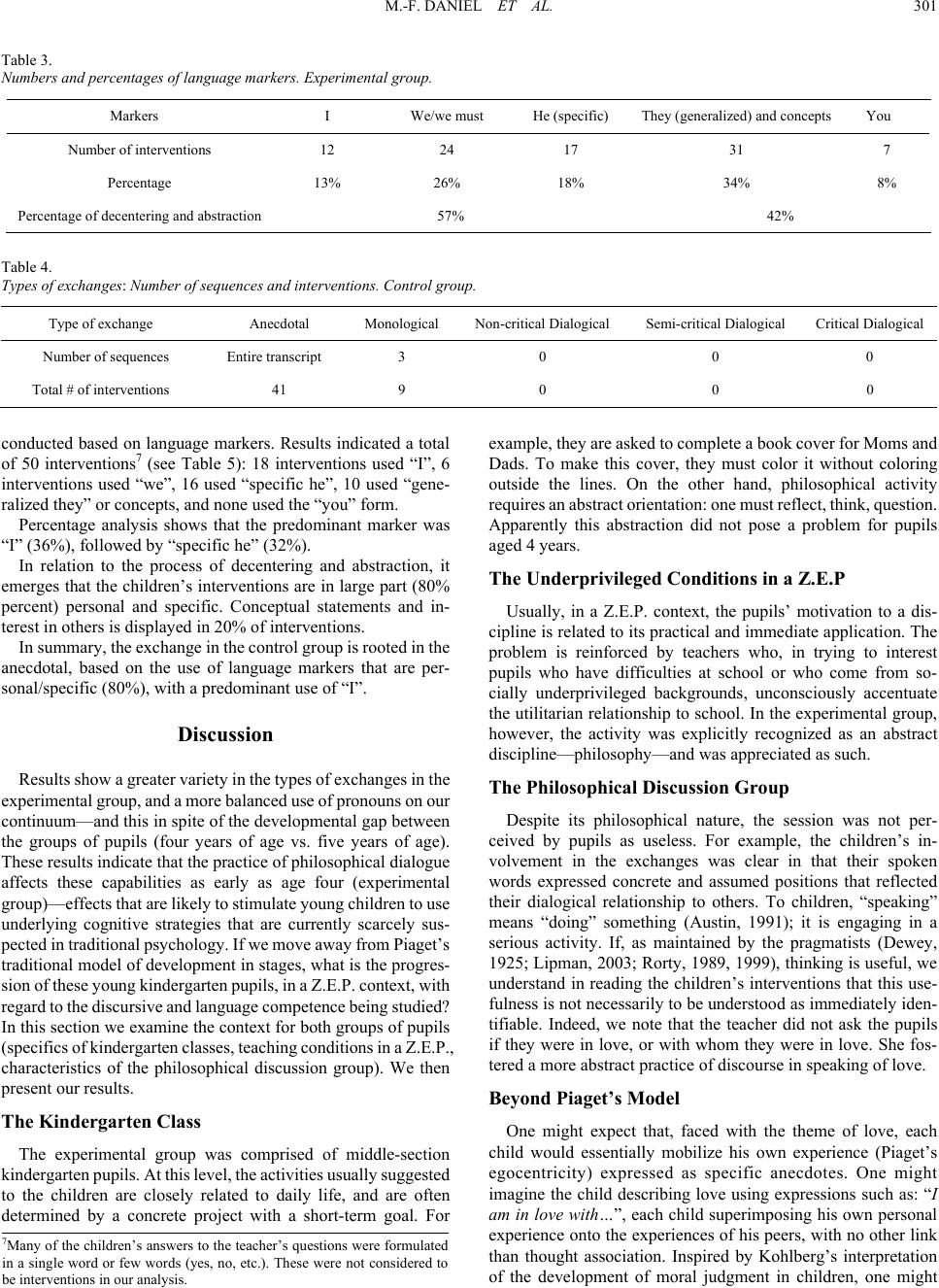 ![]() Creative Education 2011. Vol.2, No.3, 296-304 Copyright © 2011 SciRes. DOI:10.4236/ce.2011.23041 The Incidence of Philosophy on Discursive and Language Competence in Four-Year-Old Pupils Marie-France Daniel1, Jean-Charles Pettier2, Emmanuèle Auriac-Slusarczyk3 1Department of Kinesiology, Université de Montréal, Montréal (Québec), Canada; 2Department of Philosophy, IUFM of Créteil-UPEC, Paris, France; 3Department of Education and Psychology, IUFM of Auvergne/Université Blaise-Pascal, Clermont-Ferrand, France. Email: marie-france.daniel@umontreal.ca Received March 5th, 2011; revised April 10th, 2011; accepted April 22nd, 2011. Can philosophical dialogue foster the developmental process of certain language and discursive capabilities, such as decentering and abstraction, in four-year old children? And if so, to what extent? In this paper, the au- thors examine discursive and language competence in a group of four-year-old children during a four-month philosophical praxis (experimental group), compared to that of a group of five-year-old children that experi- enced no philosophical praxis (control group). The analysis was conducted using two instruments: 1) for discur- sive competence, the typology of exchanges put forward by Daniel et al. (underlying criteria include the pres- ence/absence of a common problem to solve, centering/decentering of thinking, complexity of interventions and cognitive skills, etc.) and 2) for language competence, the language markers that emerged from the transcripts (“I”, “we”, “he—particular”, “they—general”, “you”) These two instruments contributed to situating the chil- dren’s discourse within a process of increasing complexity related to decentering and abstraction. Results indi- cate that the children in the experimental group engaged in diversified exchanges (three types: anecdotal, monological, dialogical) with a predominance of the monological type and the use of language markers related to the general “they”, while the children in the control group engaged in anecdotal exchanges with a predomi- nant use of “I”. Keywords: Discursive and Language Competence, C hi l dh ood, Argumentative Discourse, Philo s o p h i c a l Dialogue In most societies, formal schooling begins at age six. One questions then whether children aged four are capable of de- veloping a capacity to listen to their peers and to enter into dialogue with them, and whether they are capable of participat- ing in a “philosophizing” process. The Philosophy for Children Approach (P4C) Educational methods intended to stimulate children to phi- losophize in the classroom have their theoretical foundations in the Philosophy for Children (P4C) approach conceived by pragmatist philosopher Matthew Lipman in the early 1970s (Lipman, 2003; Lipman et al., 1980). P4C is said to be “phi- losophical” in that it presupposes thinking concerning a shared problem based on peer collaboration, and attempts to attain inter-subjective and consensual truths (Daniel, 2005). Here, philosophizing is not a product, but a scaffold ing process (Daniel & Gagnon, 2011; Queval, 2010) that is built through philoso- phical (or critical) dialogue among peers. This process is de- manding in that it relies on skills related to decentering, ab- straction, argumentation and negotiation. P4C springs from two traditions: Aristotelian logic—which became “applied logic” through the contribution of American pragmatists in the middle of the 20th centu ry—and Socratic maïeutics that uses questioning to meet citizens’ requirements for greater well-being and better ways to live together. In the Lipmanian sense then, phil osophy is not understood from its traditional perspective (i.e.: an instru- ment of conservation for the history of ideas) but rather as a method for structuring the world in order to create a better future, that is, as an ins trument of change and creati on (Danie l & Auriac , 2009; Nussbaum, 2010; Rorty, 1989, 1999). Lipman’s program is intended for youngsters aged 6 to 15 years. Our contribution consisted in adapting the program to children five years of age (Daniel, 2002, 2003, 2009) to show how, even at this young age, children were able to participate actively in a dialogical semi-critical type of exchange with their peers (Daniel & Delsol, 2005, 2010). In France, a team of edu- cators spurred by Pomme d’Api, a magazine for preschool-aged children, went one step further, experimenting with philoso- phical discussions in a group of four-year-old children (Pettier, 2008; Pettier & Dogliani, 2009; Pettier et al., 2010). In this text, the authors analyze an exchange1 that took place between the four-year-old children in this group during a philosophy session after four months of praxis. Th e goal was to u nder stan d w heth er these exchanges could be considered to fall within a philoso- phizing process based on criteria of decentering and abstraction. Discursive and Language Competence: At What Age Should They Be Fostered? In a number of education programs, including Quebec’s, 1Each week, the pupils participated in a philosophy session that lasted one hour on average. By “exchange”, we mean verbal activity that took place during one of these philosophy sessions. ![]() M.-F. DANIEL ET AL. 297 discursive and language competence are considered fundamen- tal to the child’s development. Similarly, in school programs and instruction in France, language, identified as the heart of learning since 2002, was still considered the cornerstone of academic success in 2008 (Auriac & Maufrais, 2010). The development of discourse and language has a positive impact not only on a pupil’s learning, but also on structuring his identity, his thinking, and his socialization. “Language contributes to forming concepts and ideas; it gives access to knowledge and comprehension. A primary tool in structuring and expressing thought, it plays a key role in the develop