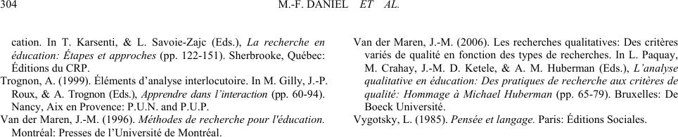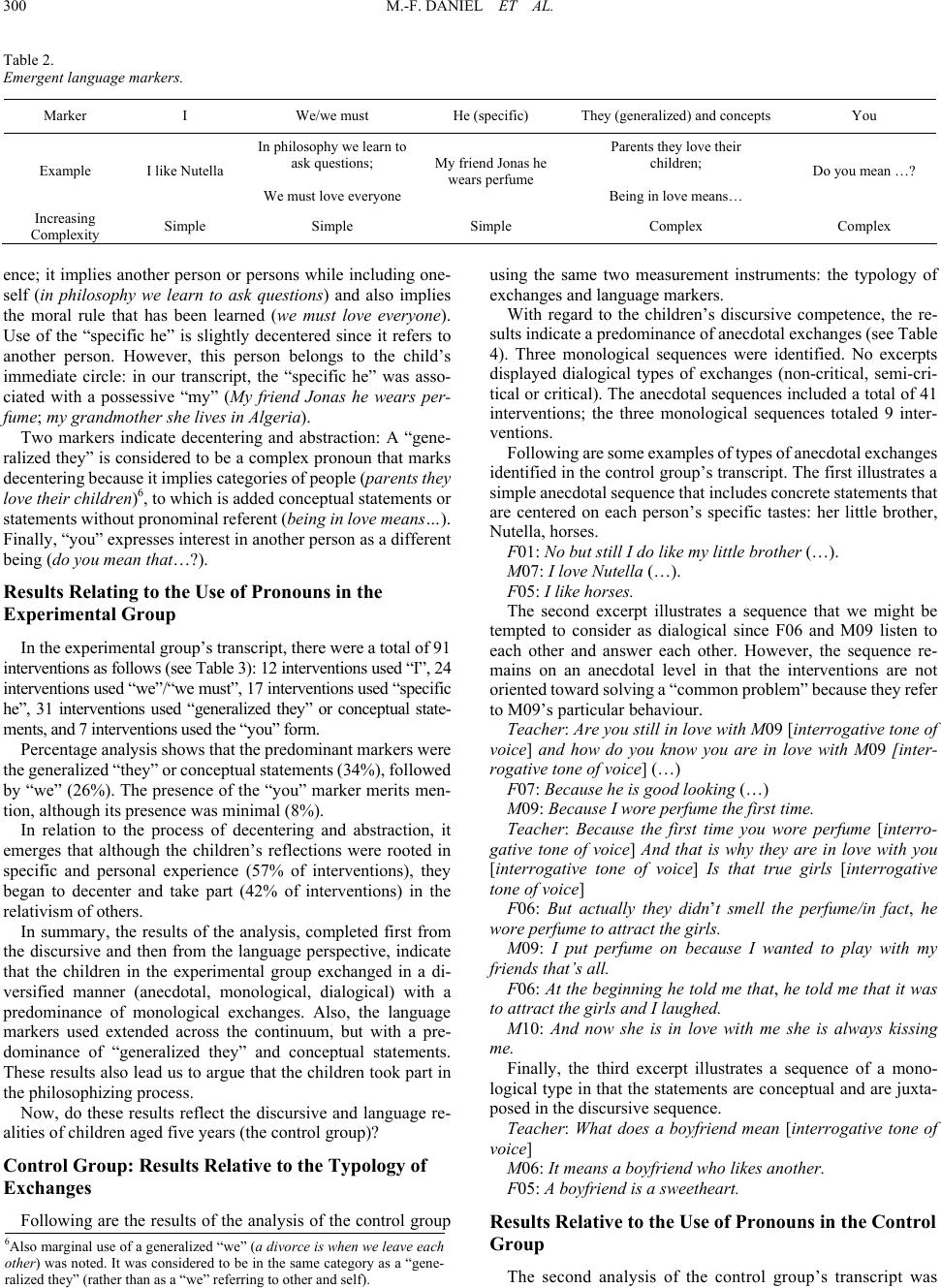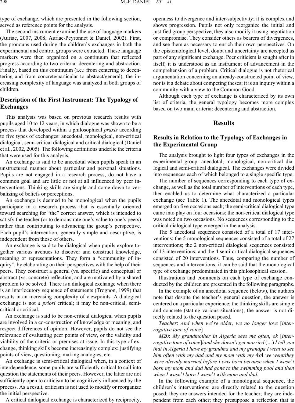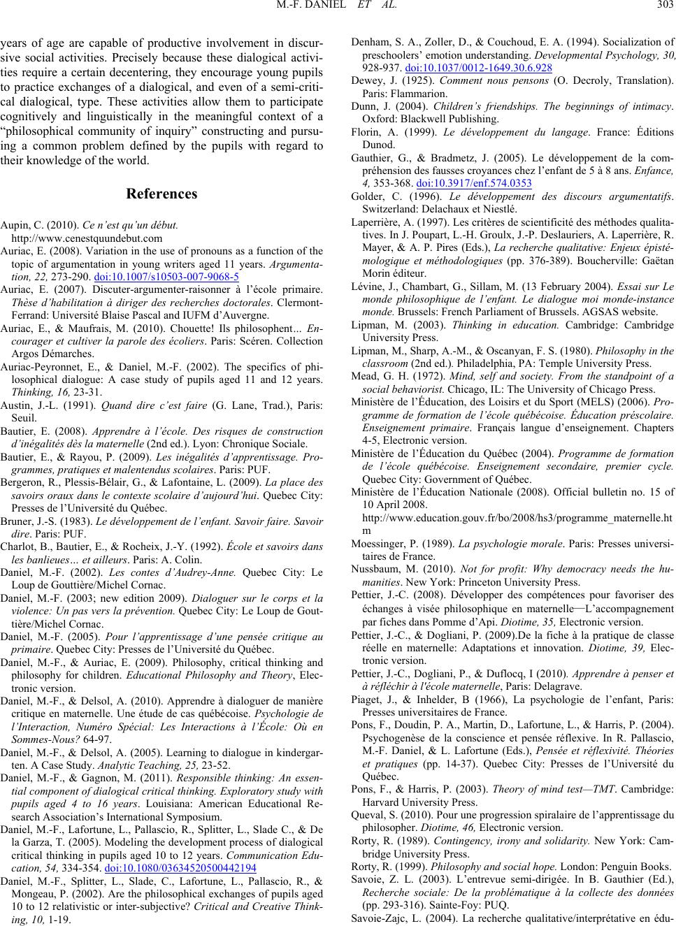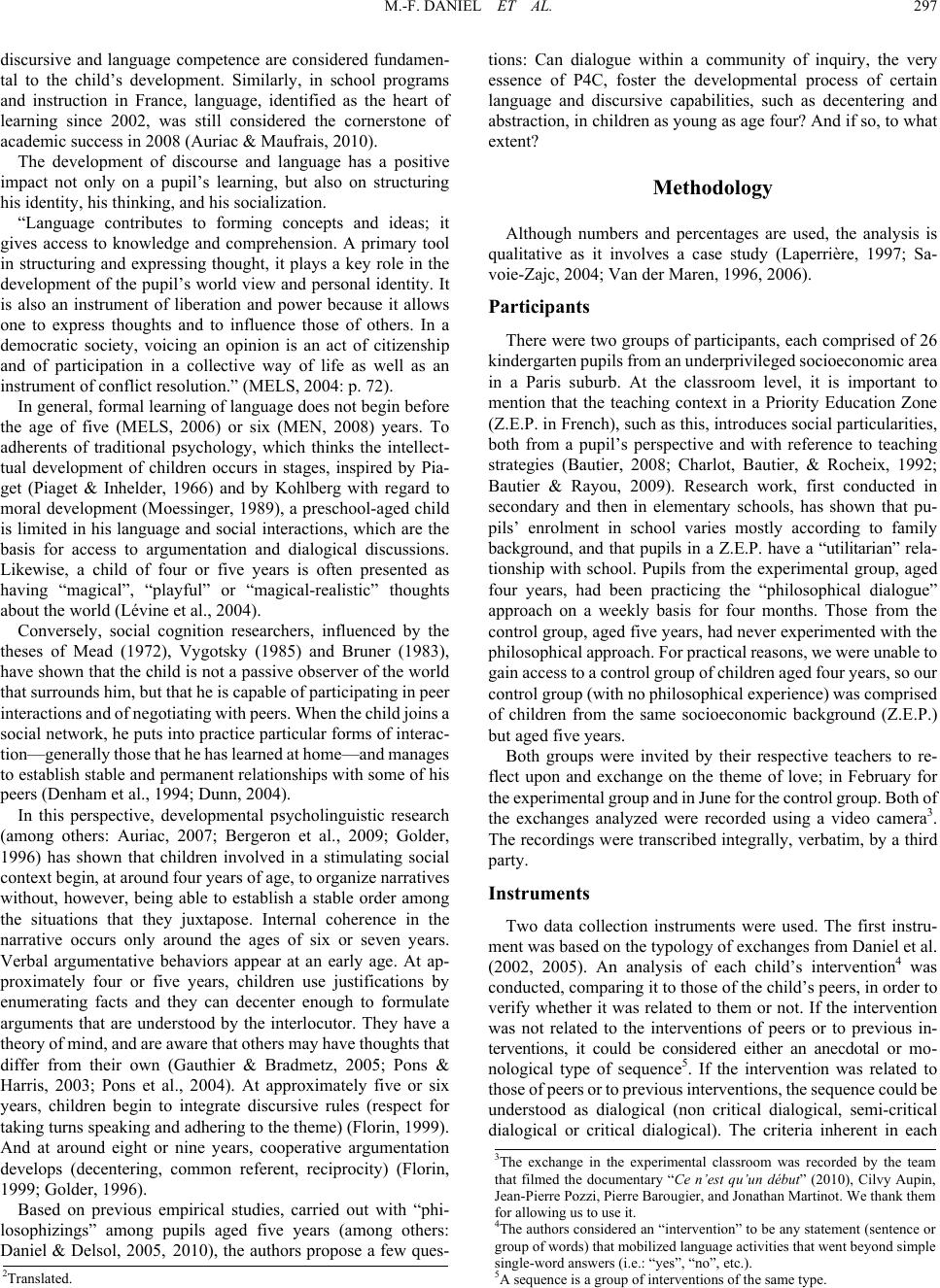 ![]() Creative Education 2011. Vol.2, No.3, 296-304 Copyright © 2011 SciRes. DOI:10.4236/ce.2011.23041 The Incidence of Philosophy on Discursive and Language Competence in Four-Year-Old Pupils Marie-France Daniel1, Jean-Charles Pettier2, Emmanuèle Auriac-Slusarczyk3 1Department of Kinesiology, Université de Montréal, Montréal (Québec), Canada; 2Department of Philosophy, IUFM of Créteil-UPEC, Paris, France; 3Department of Education and Psychology, IUFM of Auvergne/Université Blaise-Pascal, Clermont-Ferrand, France. Email: marie-france.daniel@umontreal.ca Received March 5th, 2011; revised April 10th, 2011; accepted April 22nd, 2011. Can philosophical dialogue foster the developmental process of certain language and discursive capabilities, such as decentering and abstraction, in four-year old children? And if so, to what extent? In this paper, the au- thors examine discursive and language competence in a group of four-year-old children during a four-month philosophical praxis (experimental group), compared to that of a group of five-year-old children that experi- enced no philosophical praxis (control group). The analysis was conducted using two instruments: 1) for discur- sive competence, the typology of exchanges put forward by Daniel et al. (underlying criteria include the pres- ence/absence of a common problem to solve, centering/decentering of thinking, complexity of interventions and cognitive skills, etc.) and 2) for language competence, the language markers that emerged from the transcripts (“I”, “we”, “he—particular”, “they—general”, “you”) These two instruments contributed to situating the chil- dren’s discourse within a process of increasing complexity related to decentering and abstraction. Results indi- cate that the children in the experimental group engaged in diversified exchanges (three types: anecdotal, monological, dialogical) with a predominance of the monological type and the use of language markers related to the general “they”, while the children in the control group engaged in anecdotal exchanges with a predomi- nant use of “I”. Keywords: Discursive and Language Competence, C hi l dh ood, Argumentative Discourse, Philo s o p h i c a l Dialogue In most societies, formal schooling begins at age six. One questions then whether children aged four are capable of de- veloping a capacity to listen to their peers and to enter into dialogue with them, and whether they are capable of participat- ing in a “philosophizing” process. The Philosophy for Children Approach (P4C) Educational methods intended to stimulate children to phi- losophize in the classroom have their theoretical foundations in the Philosophy for Children (P4C) approach conceived by pragmatist philosopher Matthew Lipman in the early 1970s (Lipman, 2003; Lipman et al., 1980). P4C is said to be “phi- losophical” in that it presupposes thinking concerning a shared problem based on peer collaboration, and attempts to attain inter-subjective and consensual truths (Daniel, 2005). Here, philosophizing is not a product, but a scaffold ing process (Daniel & Gagnon, 2011; Queval, 2010) that is built through philoso- phical (or critical) dialogue among peers. This process is de- manding in that it relies on skills related to decentering, ab- straction, argumentation and negotiation. P4C springs from two traditions: Aristotelian logic—which became “applied logic” through the contribution of American pragmatists in the middle of the 20th centu ry—and Socratic maïeutics that uses questioning to meet citizens’ requirements for greater well-being and better ways to live together. In the Lipmanian sense then, phil osophy is not understood from its traditional perspective (i.e.: an instru- ment of conservation for the history of ideas) but rather as a method for structuring the world in order to create a better future, that is, as an ins trument of change and creati on (Danie l & Auriac , 2009; Nussbaum, 2010; Rorty, 1989, 1999). Lipman’s program is intended for youngsters aged 6 to 15 years. Our contribution consisted in adapting the program to children five years of age (Daniel, 2002, 2003, 2009) to show how, even at this young age, children were able to participate actively in a dialogical semi-critical type of exchange with their peers (Daniel & Delsol, 2005, 2010). In France, a team of edu- cators spurred by Pomme d’Api, a magazine for preschool-aged children, went one step further, experimenting with philoso- phical discussions in a group of four-year-old children (Pettier, 2008; Pettier & Dogliani, 2009; Pettier et al., 2010). In this text, the authors analyze an exchange1 that took place between the four-year-old children in this group during a philosophy session after four months of praxis. Th e goal was to u nder stan d w heth er these exchanges could be considered to fall within a philoso- phizing process based on criteria of decentering and abstraction. Discursive and Language Competence: At What Age Should They Be Fostered? In a number of education programs, including Quebec’s, 1Each week, the pupils participated in a philosophy session that lasted one hour on average. By “exchange”, we mean verbal activity that took place during one of these philosophy sessions. ![]() M.-F. DANIEL ET AL. 297 discursive and language competence are considered fundamen- tal to the child’s development. Similarly, in school programs and instruction in France, language, identified as the heart of learning since 2002, was still considered the cornerstone of academic success in 2008 (Auriac & Maufrais, 2010). The development of discourse and language has a positive impact not only on a pupil’s learning, but also on structuring his identity, his thinking, and his socialization. “Language contributes to forming concepts and ideas; it gives access to knowledge and comprehension. A primary tool in structuring and expressing thought, it plays a key role in the develop
