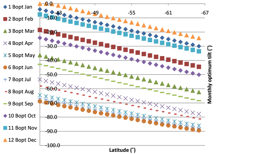 Figure 2. Monthly optimum tilt angle for latitudes [−40˚, −66˚].