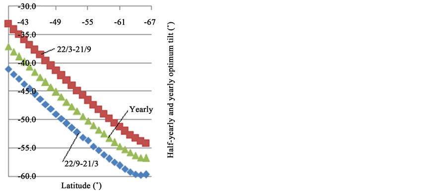 Figure 4. Half-yearly and yearly optimum tilt angle for latitudes [−40˚, −66˚].