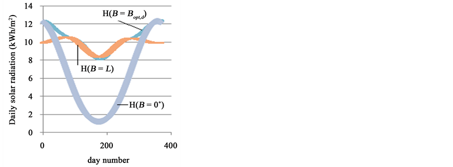 On the other hand, in order to evaluate the possible solar energy gain using tilt angle adjustment the total yearly extraterrestrial solar radiation at B = 0˚, B = Bopt, B = L should be calculated on a daily, monthly, seasonally as well as on a half-yearly and yearly basis. The results, for one example L = 55˚, are given on Figure 5 where H2 stands for solar radiation at B = Bopt, H1 stands for solar radiation at B = L and H0 stands for solar radiation at B = 0˚. It is seen from Figure 5 that solar radiation incident on a surface with optimum tilt angle has the maximum values all over the year. When comparing H2 with H1 it is seen from Figure 5 that H2 is greater than H1 remarkably over the period started from 22/9 to 21/3 while these values are near to each other during half a year started from 22/3 to 21/9.