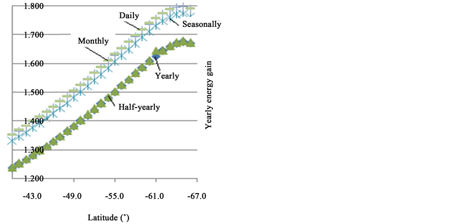 Figure 6. Yearly solar energy gain calculated basing on daily, monthly, seasonally, half-yearly and yearly optimum tilt angle for latitudes [−40˚, −66˚].
