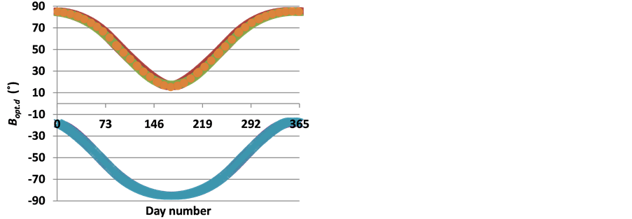 El-Kassa by [10] proposed a formula for determining Bopt,d at latitudes up to 60˚ in Northern Hemisphere with verifying the applicability of his formula during the period starting from 22/9 to 21/3 but his formula suffers from uncertainty during period starting from 22/3 to 21/9 (see [1] for more details). Skeiker [11] presented his study aiming to develop an analytical procedure to obtain formula for determining Bopt,d for any chosen day at any latitude in Northern Hemisphere but he repeated the same formula of El-Kassaby [10] (see [2] for more details). So, no need to compare the results of the present work with those of [10] and [11] . Figure 9 shows the results of applying Equation (2) and Equation (12) for determining Bopt,d for 60˚S latitudes and Equation (2), the algorithm of [8] in addition to results of [1] for 60˚N. It is seen from Figure 9 that the results of the present work agree very well with those of [1] and the algorithm of [8] . Moreover, Equation (12) gives an excellent fit of the calculated results of the algorithm in this work.