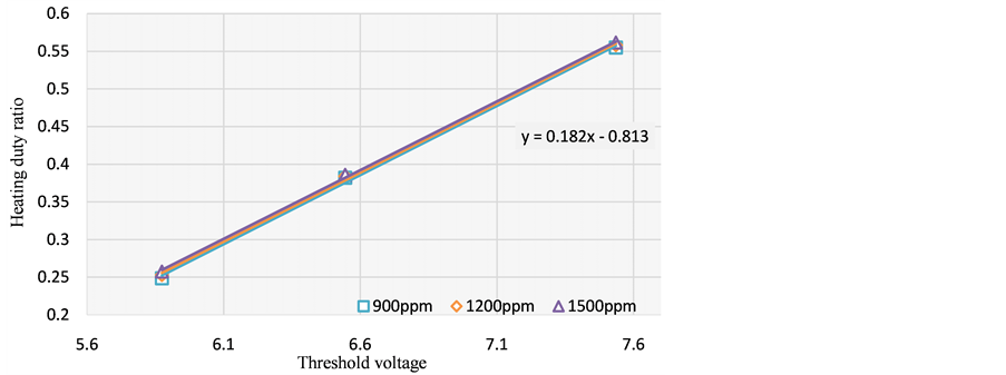 There are several factors influencing the detection. The first one we analyzed is the threshold voltage. When the threshold voltage becomes higher, the delta-sigma architecture will control the light and increase the radiation power to make the output voltage reach the new threshold value. Therefore, a higher heating ratio will be obtained. Figure 7 shows the experimental results under different threshold voltage. By observing these results, one can find that as the the threshold voltage increases, the higher the heating ratio will get higher under the same gas concentration. The experimental results are agreed with theoretical prediction.