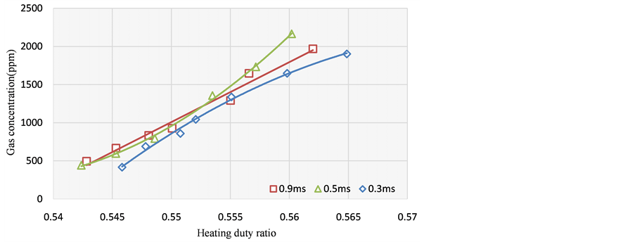 The next interesting factor of our proposed measuring system is the sampling time. Since the transfer ratio of the radiation to the out power will increase or decay exponentially during the sampling time, the detected ratio will vary as long as the sampling time increases. Then, the relationship of the heating duty ratio and the gas concentration will change corresponding to different threshold voltage.