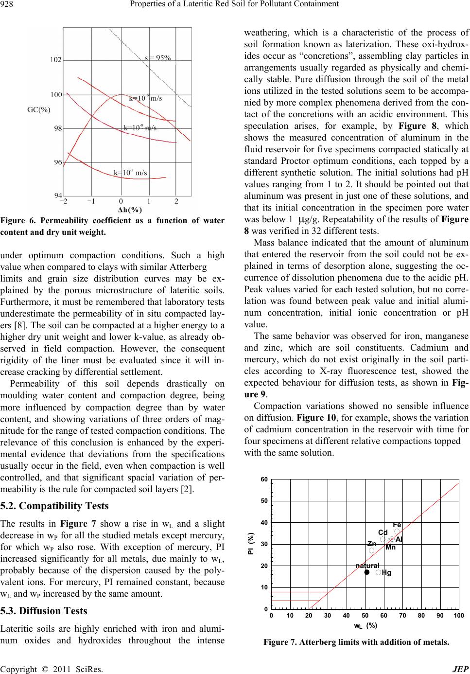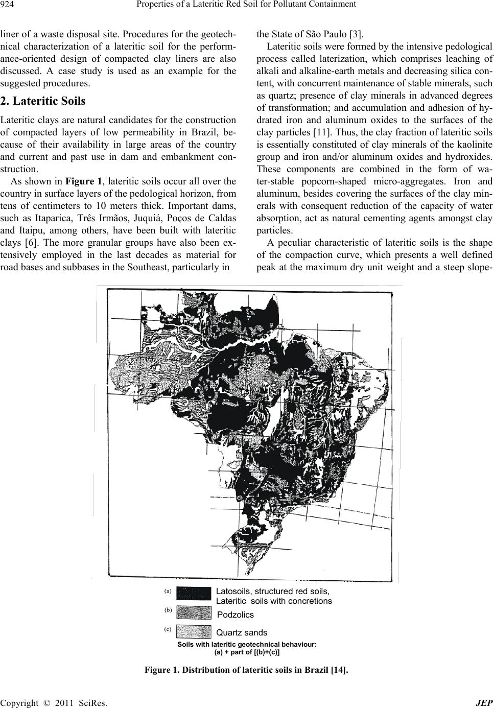 Properties of a Lateritic Red Soil for Pollutant Containment 924 liner of a waste disposal site. Procedures for the geotech- nical characterization of a lateritic soil for the perform- ance-oriented design of compacted clay liners are also discussed. A case study is used as an example for the suggested procedures. 2. Lateritic Soils Lateritic clays are natural candidates for the construction of compacted layers of low permeability in Brazil, be- cause of their availability in large areas of the country and current and past use in dam and embankment con- struction. As shown in Figure 1, lateritic soils occur all over the country in surface layers of the pedological horizon, from tens of centimeters to 10 meters thick. Important dams, such as Itaparica, Três Irmãos, Juquiá, Poços de Caldas and Itaipu, among others, have been built with lateritic clays [6]. The more granular groups have also been ex- tensively employed in the last decades as material for road bases and subbases in the Southeast, particularly in the State of São Paulo [3]. Lateritic soils were formed by the intensive p edo logical process called laterization, which comprises leaching of alkali and alkaline-earth metals and decreasing silica con- tent, with concurrent maintenance of stable minerals, such as quartz; presence of clay minerals in advanced degrees of transformation; and accumulation and adhesion of hy- drated iron and aluminum oxides to the surfaces of the clay particles [11]. Thus, the clay fraction of lateritic soils is essentially constituted of clay minerals of the kaolinite group and iron and/or aluminum oxides and hydroxides. These components are combined in the form of wa- ter-stable popcorn-shaped micro-aggregates. Iron and aluminum, besides covering the surfaces of the clay min- erals with consequent reduction of the capacity of water absorption, act as natural cementing agents amongst clay particles. A peculiar characteristic of lateritic soils is the shape of the compaction curve, which presents a well defined peak at the maximum dry unit weight and a steep slope- Quartz sands Podz ol ics Latosoils, structured red soils, Lateritic so ils with concretions Soils with lateritic geotechn ical behaviour: (a) + part of [(b)+(c)] Figure 1. Distribution of lateritic soils in Brazil [14]. Copyright © 2011 SciRes. JEP