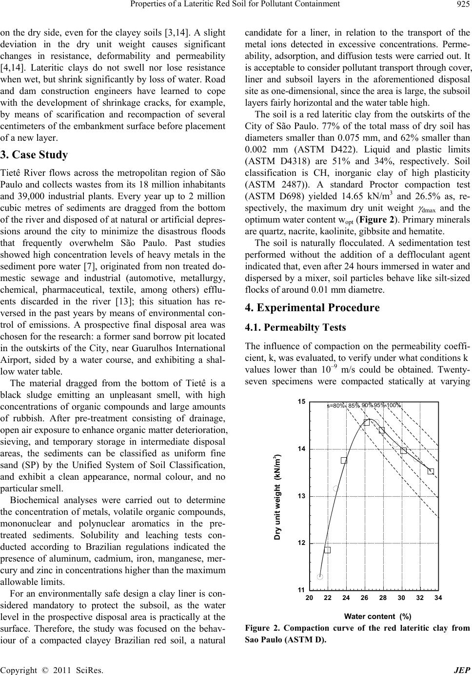 Journal of Environmental Protection, 2011, 2, 923-931 doi:10.4236/jep.2011.27105 Published Online September2011 (http://www.SciRP.org/journal/jep) Copyright © 2011 SciRes. JEP 923 Properties of a Lateritic Red Soil for Pollutant Containment Maria Eugenia Gimenez Boscov1, Waldemar Coelho Hachich1, Claudio Fernando Mahler2, Elisabeth de Oliveira1 1University of São Paulo, São Paulo, Brazil; 2Federal University of Rio de Jane iro, Rio de Janeiro, Braz il. Email: meboscov@usp.br. Received May 22nd, 2011; revised July 6th, 2011; accepted August 16th, 2011. ABSTRACT In many regions of Brazil, lateritic clays are the natural candidates for the construction of compacted clay liners of waste disposal sites because of their a vailability and appro priate geotechnica l characteristics. Lateritic soils have been extensively used in recent decades in dam and road construction, but little is known about the migration of pollutants through compacted la yers of such soils. This paper describes the characteristics of a lateritic clay, representing a group of soils of significant occurrence in the State of São Paulo, to be employed in a clay liner of a waste disposal site. Laboratory tests to assess permeability, adsorption and diffusion of six metals through the compacted soil showed that permeability criterion may be met in the field, that the soil presents a modest capa city to retain cadmium and that con- stituent metal oxides may be dissolved from the soil grains by acidic solutions. Keywords: Compacted Clay Liner, Lateritic Soil, Permeability, Cadmium, Adsorption 1. Introduction There is growing concern in Brazil regarding the prob- lem of disposal of domestic and industrial wastes. Sani- tary landfills have been built in most cities in the last decade, but 34% of the total collected mass of municipal solid wastes (MSW) are still disposed of inadequate landfills or dumped [10]. Industrial conglomerates and large industrial plants are controlled by environmental authorities, but wastes from smaller industries are still co-disposed with solid municipal waste in small munici- palities. International regulations for the design of waste dis- posal sites adopted in Brazil provide general guidelines, but understanding the peculiarities of Brazilian soils and climate is essential to check the applicability of such regulations to specific sites. Large areas of the country are covered with tropical soils [14], among which the lateritic red clays are natural candidates for the construc- tion of compacted clay liners [5]. Lateritic soils have been extensively u sed in th e last decades in dam and road construction; nevertheless, very little is known about the migration of pollutants through compacted layers of such soils. The main mechanisms of solute transport through a porous medium are: advection, mechanical dispersion, diffusion, chemical reaction s of th e solute in the solution, such as radioactivity, and chemical reactions among sol- ute and solids, such as adsorption [9]. Advectio n, i.e. the movement of solute as it is carried by the water seeping through the so il, and mechanical dispersion, i.e. the mix- ing that occurs together with advection, are dependent on the hydraulic conductivity of the soil. Diffusion, i.e. the movement of ionic and molecular constituents by their thermal-kinetic energy in the opposite direction of the concentration gradient, is controlled by the diffusion co- efficient in the chemical species of the soil. Adsorption, which is a physical-chemical process by which a solute is accumulated in a solid-liquid interface, is essentially due to clay minerals, which are negatively charged because of isomorphic substitution of cations in the silicate or aluminate layers of the crystalline reticule. Other reten- tion mechanisms may occur, such as precipitation, ion complexation and specific adsorption. The capacity of soils for attenuating pollution has been intensively stud- ied in the last thirty years; an important application is the utilization of compacted clay liners in waste disposal sites or waste treatment plants to control subsoil con- tamination [15]. This paper describes the characteristics of a lateritic clay, representing a group of soils of significant occur- rence in the State of São Paulo, to be employed in a clay