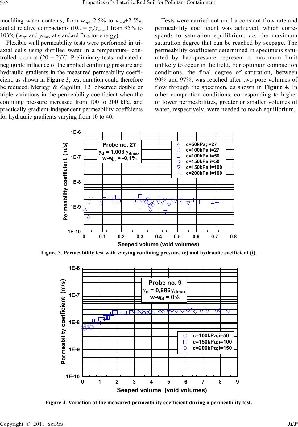 Properties of a Lateritic Red Soil for Pollutant Containment Copyright © 2011 SciRes. JEP 926 Tests were carried out until a constant flow rate and permeability coefficient was achieved, which corre- sponds to saturation equilibrium, i.e. the maximum saturation degree that can be reached by seepage. The permeability coefficient deter mined in specimens satu- rated by backpressure represent a maximum limit unlikely to occur in the field. For optimum compaction conditions, the final degree of saturation, between 90% and 97%, was reached after two pore volumes of flow through the specimen, as shown in Figure 4. In other compaction conditions, corresponding to higher or lower permeabilities, greater or smaller volumes of water, respectively, were needed to reach equilibrium. moulding water contents, from wopt–2.5% to wopt+2.5%, and at relative compactions (RC = d/ dmax) from 95% to 103% (wopt and dmax at st andard Pr oct or ene rg y ). Flexible wall permeability tests were performed in tri- axial cells using distilled water in a temperature- con- trolled room at (20 2)˚C. Preliminary tests indicated a negligible influence of the applied confining pressure and hydraulic gradients in the measured permeability coeffi- cient, as shown in Figure 3; test duration could therefore be reduced. Meriggi & Zagollin [12] observed double or triple variations in the permeability coefficient when the confining pressure increased from 100 to 300 kPa, and practically gradient-independent permeability coeffcients for hydraulic gradients varying from 10 to 40. 00.1 0.2 0.3 0.4 0.5 0.6 0.7 0.8 Seeped volume (void volumes) 1E-10 1E-9 1E-8 1E-7 1E-6 Permeability coefficient (m/s) c=50kPa;i=27 c=100kPa;i=27 c=100kPa;i=50 c=150kPa;i=50 c=150kPa;i=100 c=200kPa;i=100 Probe no. 27 d = 1,003 dmax w-w ot = -0,1% Figure 3. Permeability test with varying confining pressure (c) and hydraulic coefficient (i). 0123456789 Seeped volume (void volumes) 1E-10 1E-9 1E-8 1E-7 1E-6 Permeability coefficient (m/s) c=100kPa;i=50 c=150kPa;i=100 c=200kPa;i=150 Probe no. 9 d = 0,986 dmax w-w ot = 0% Figure 4. Variation of the measured permeability coefficient during a permeability test.