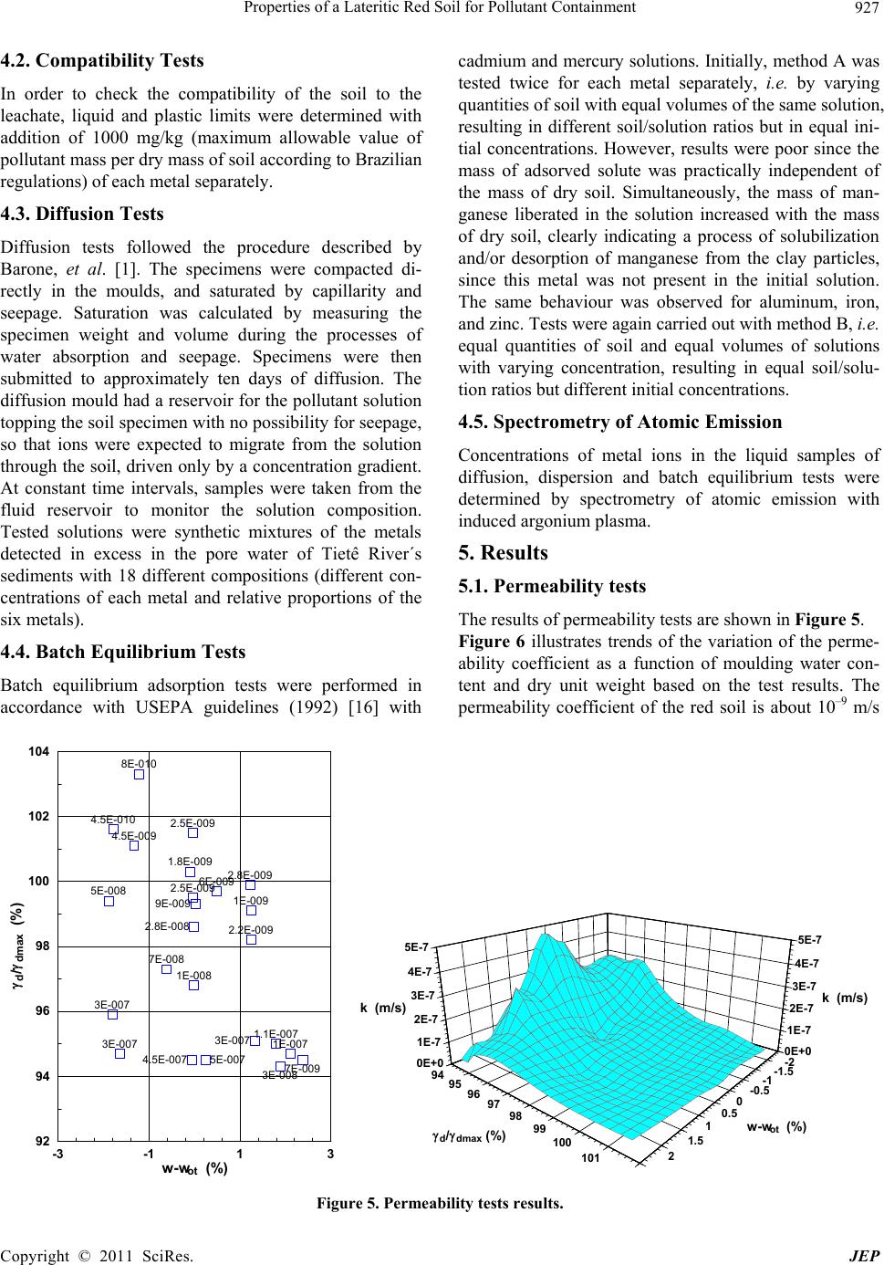 Properties of a Lateritic Red Soil for Pollutant Containment 927 4.2. Compatibility Tests In order to check the compatibility of the soil to the leachate, liquid and plastic limits were determined with addition of 1000 mg/kg (maximum allowable value of pollutant mass per dry mass of soil according to Brazilian regulations) of each metal separately. 4.3. Diffusion Tests Diffusion tests followed the procedure described by Barone, et al. [1]. The specimens were compacted di- rectly in the moulds, and saturated by capillarity and seepage. Saturation was calculated by measuring the specimen weight and volume during the processes of water absorption and seepage. Specimens were then submitted to approximately ten days of diffusion. The diffusion mould had a reservoir for the pollutant solution topping the so il speci men with no po ssibility for seep age, so that ions were expected to migrate from the solution through the soil, driven only by a concentration gradient. At constant time intervals, samples were taken from the fluid reservoir to monitor the solution composition. Tested solutions were synthetic mixtures of the metals detected in excess in the pore water of Tietê River´s sediments with 18 different compositions (different con- centrations of each metal and relative proportions of the six metals). 4.4. Batch Equilibrium Tests Batch equilibrium adsorption tests were performed in accordance with USEPA guidelines (1992) [16] with cadmium and mercury solutions. Initially, method A was tested twice for each metal separately, i.e. by varying quantities of soil with equal volumes of the same solu tion, resulting in different soil/solution ratios but in equal ini- tial concentrations. However, results were poor since the mass of adsorved solute was practically independent of the mass of dry soil. Simultaneously, the mass of man- ganese liberated in the solution increased with the mass of dry soil, clearly indicating a process of solubilization and/or desorption of manganese from the clay particles, since this metal was not present in the initial solution. The same behaviour was observed for aluminum, iron, and zinc. Tests were again carried out with method B, i.e. equal quantities of soil and equal volumes of solutions with varying concentration, resulting in equal soil/solu- tion ratios but different initial concentrations. 4.5. Spectrometry of Atomic Emission Concentrations of metal ions in the liquid samples of diffusion, dispersion and batch equilibrium tests were determined by spectrometry of atomic emission with induced argonium plasma. 5. Results 5.1. Permeability tests The results of permeability tests are shown in Figure 5. Figure 6 illustrates trends of the variation of the perme- ability coefficient as a function of moulding water con- tent and dry unit weight based on the test results. The permeability coefficient of the red soil is about 10–9 m/s -3 -11 3 w-w ot (%) 92 94 96 98 100 102 104 d / dmax (%) 8E-010 7E-008 2.8E-009 3E-008 2.2E-009 1E-009 1E-008 2.8E-008 6E-009 5E-007 1.1E-007 4.5E-010 7E-009 9E-009 3E-007 4.5E-007 1E-007 5E-008 2.5E-009 2.5E-009 3E-007 3E-007 4.5E-009 1.8E-009 -2 -1.5 -1 -0.5 0 0.5 1 1.5 2 w-w ot (%) 94 95 96 97 98 99100 101 d/dmax (%) 0E+0 1E-7 2E-7 3E-7 4E-7 5E-7 k (m/s) 0E+0 1E-7 2E-7 3E-7 4E-7 5E-7 k (m/s) Figure 5. Permeability tests results. Copyright © 2011 SciRes. JEP