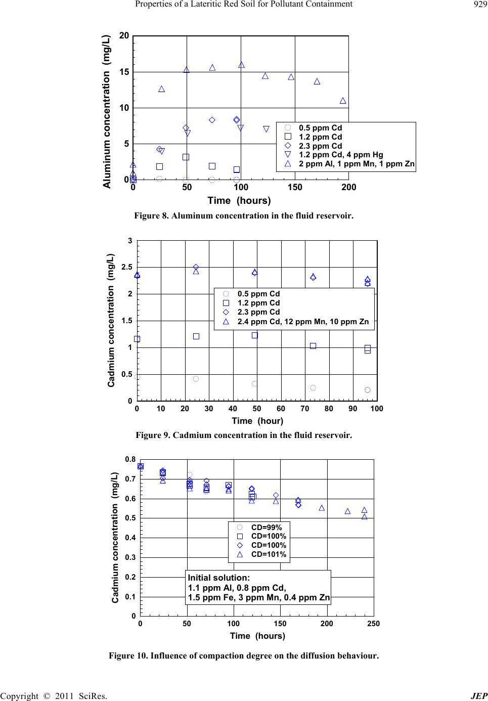 Properties of a Lateritic Red Soil for Pollutant Containment 929 050100 150 200 Time (hours) 0 5 10 15 20 Aluminum concentration (mg/L) 0.5 ppm Cd 1.2 ppm Cd 2.3 ppm Cd 1.2 ppm Cd, 4 p pm Hg 2 ppm Al, 1 ppm Mn, 1 ppm Zn Figure 8. Aluminum concentration in the fluid reservoir. 010 20 30 40 50 60 70 80 90100 Time (hour) 0 0.5 1 1.5 2 2.5 3 Cadmium concentration (mg/L) 0.5 ppm Cd 1.2 ppm Cd 2.3 ppm Cd 2.4 ppm Cd, 12 ppm Mn, 10 ppm Zn Figure 9. Cadmium concentration in the fluid reservoir. 050100 150 200 250 Time (hours) 0 0.1 0.2 0.3 0.4 0.5 0.6 0.7 0.8 Cadmium concentration (mg/L) CD=99% CD=100% CD=100% CD=101% Initial solution: 1.1 ppm Al, 0.8 ppm Cd, 1.5 ppm Fe, 3 ppm Mn, 0.4 ppm Zn Figure 10. Influence of compaction degree on the diffusion behaviour. Copyright © 2011 SciRes. JEP