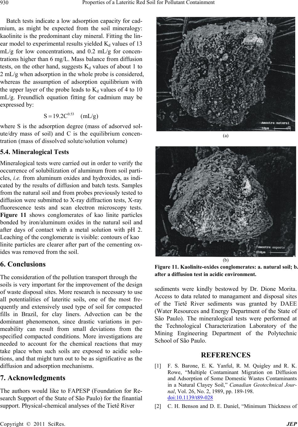 Properties of a Lateritic Red Soil for Pollutant Containment 930 Batch tests indicate a low adsorption capacity for cad- mium, as might be expected from the soil mineralogy: kaolinite is the p redominant clay mineral. Fitting the lin- ear model to experimental results yielded Kd values of 13 mL/g for low concentrations, and 0.2 mL/g for concen- trations higher than 6 mg/L. Mass balance from diffusion tests, on the other hand, suggests Kd values of about 1 to 2 mL/g when adsorption in the whole probe is considered, whereas the assumption of adsorption equilibrium with the upper layer of the probe leads to Kd values of 4 to 10 mL/g. Freundlich equation fitting for cadmium may be expressed by: 0.53 S 19.2C(mL/g) where S is the adsorption degree (mass of adsorved sol- ute/dry mass of soil) and C is the equilibrium concen- tration (mass o f d issolv ed so lut e/so lut ion volume) 5.4. Mineralogical Tests Mineralogical tests were carried out in orde r to verify the occurrence of solubilization of aluminum from soil parti- cles, i.e. from aluminum oxides and hydroxides, as indi- cated by the results of diffusion and batch tests. Samples from the natural soil and from prob es prev iously tested to diffusion were submitted to X-ray diffraction tests, X-ray fluorescence tests and scan electron microscopy tests. Figure 11 shows conglomerates of kao linite particles bonded by iron/aluminum oxides in the natural soil and after days of contact with a metal solution with pH 2. Leaching of the conglomerate is visible: contours of kao linite particles are clearer after part of the cementing ox- ides was removed from the soil. 6. Conclusions The consideration of the pollution transport through the soils is very important for the improvement of the design of waste disposal sites. More research is necessary to use all potentialities of lateritic soils, one of the most fre- quently and extensively used type of soil for compacted fills in Brazil, for clay liners. Advection can be the dominant phenomenon, since drastic variations in per- meability can result from small deviations from the specified compacted conditions. More investigations are needed to account for the chemical reactions that may take place when such soils are exposed to acidic solu- tions, and that migh t turn out to be as significative as the diffusion and adsorption mechanisms. 7. Acknowledgments The authors would like to FAPESP (Foundation for Re- search Support of the State of São Paulo) for the finantial support. Physical-chemical analyses of the Tietê River (a) (b) Figure 11. Kaolinite-oxides conglomerates: a. natural soil; b. after a diffusion test in acidic environment. sediments were kindly bestowed by Dr. Dione Morita. Access to data related to managament and disposal sites of the Tietê River sediments was granted by DAEE (Water Resources and Energy Department of the State of São Paulo). The mineralogical tests were performed at the Technological Characterization Laboratory of the Mining Engineering Department of the Polytechnic School of São Paulo. REFERENCES [1] F. S. Barone, E. K. Yanful, R. M. Quigley and R. K. Rowe, “Multiple Contaminant Migration on Diffusion and Adsorption of Some Domestic Wastes Contaminants in a Natural Clayey Soil,” Canadian Geotechnical Jour- nal, Vol. 26, No. 2, 1989, pp. 189-198. doi:10.1139/t89-028 [2] C. H. Benson and D. E. Daniel, “Minimum Thickness of Copyright © 2011 SciRes. JEP