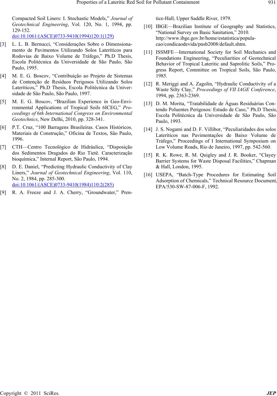 Properties of a Lateritic Red Soil for Pollutant Containment Copyright © 2011 SciRes. JEP 931 Compacted Soil Liners: I. Stochastic Models,” Journal of Geotechnical Engineering, Vol. 120, No. 1, 1994, pp. 129-152. doi:10.1061/(ASCE)0733-9410(1994)120:1(129) [3] L. L. B. Bernucci, “Considerações Sobre o Dimensiona- mento de Pavimentos Utilizando Solos Lateríticos para Rodovias de Baixo Volume de Tráfego,” Ph.D Thesis, Escola Politécnica da Universidade de São Paulo, São Paulo, 1995. [4] M. E. G. Boscov, “Contribuição ao Projeto de Sistemas de Contenção de Resíduos Perigosos Utilizando Solos Lateríticos,” Ph.D Thesis, Escola Politécnica da Univer- sidade de São Paulo, São Paulo, 1997. [5] M. E. G. Boscov, “Brazilian Experience in Geo-Envi- ronmental Applications of Tropical Soils 6ICEG,” Pro- ceedings of 6th International Congress on Environmental Geotechnics, New Delhi, 2010, pp. 328-341. [6] P.T. Cruz, “100 Barragens Brasileiras. Casos Históricos. Materiais de Construção,” Oficina de Textos, São Paulo, 1996. [7] CTH—Centro Tecnológico de Hidráulica, “Disposição dos Sedimentos Dragados do Rio Tietê. Caracterização bioquímica,” Internal Report, São Paulo, 1994. [8] D. E. Daniel, “Predicting Hydraulic Conductivity of Clay Liners,” Journal of Geotechnical Engineering, Vol. 110, No. 2, 1984, pp. 285-300. doi:10.1061/(ASCE)0733-9410(1984)110:2(285) [9] R. A. Freeze and J. A. Cherry, “Groundwater,” Pren- tice-Hall, Upper Saddle River, 1979. [10] IBGE—Brazilian Institute of Geography and Statistics, “National Survey on Basic Sanitation,” 2010. http://www.ibge.gov.br/home/estatistica/popula- cao/condicaodevida/pnsb2008/default.shtm. [11] ISSMFE—International Society for Soil Mechanics and Foundations Engineering, “Peculiarities of Geotechnical Behavior of Tropical Lateritic and Saprolitic Soils,” Pro- gress Report, Committee on Tropical Soils, São Paulo, 1985. [12] R. Meriggi and A. Zagolin, “Hydraulic Conductivity of a Waste Silty Clay,” Proceedings of VII IAGE Conference, 1994, pp. 2363-2369. [13] D. M. Morita, “Tratabilidade de Águas Residuárias Con- tendo Poluentes Perigosos: Estudo de Caso,” Ph.D Thesis, Escola Politécnica da Universidade de São Paulo, São Paulo, 1993. [14] J. S. Nogami and D. F. Villibor, “Peculiaridades dos solos Lateríticos nas Pavimentações de Baixo Volume de Tráfego,” Proceedings of I International Symposium on Low Volume Roads, Rio de Janeiro, 1997, pp. 542-560. [15] R. K. Rowe, R. M. Quigley and J. R. Booker, “Clayey Barrier Systems for Waste Disposal Facilities,” Chapman & Hall, London, 1995. [16] USEPA, “Batch-Type Procedures for Estimating Soil Adsorption of Chemicals,” Technical Resource Document, EPA/530-SW-87-006-F, 1992.