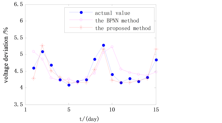The optimal regularization parameter C and kernel parameter δ are used in least squares support vector machine model to predict the voltage deviation for the next 15 days from January 1st to 15th, 2016. In order to verify the feasibility of the proposed method, the BP neural network algorithm is compared with the method in this paper. The results are shown in Figure 5.