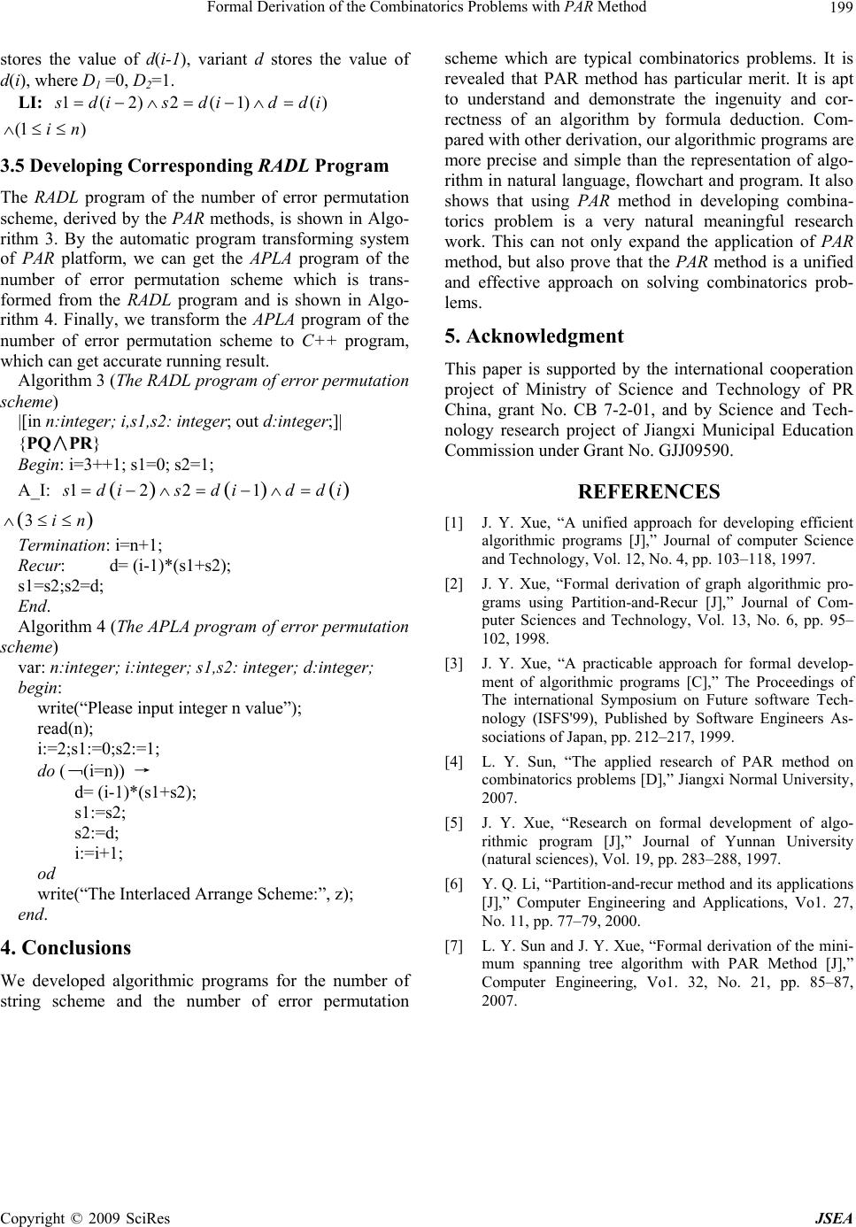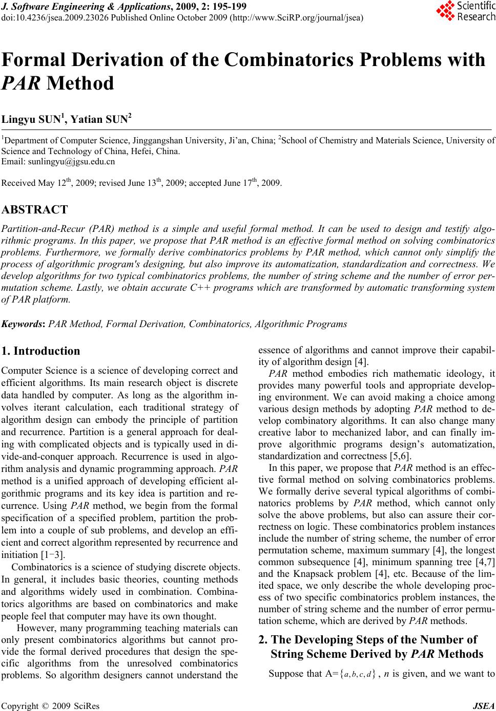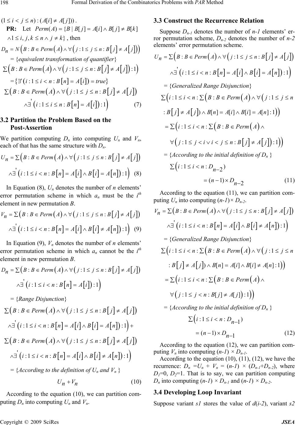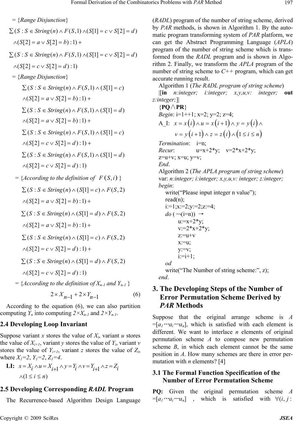 ![]() J. Software Engineering & Applications, 2009, 2: 195-199 doi:10.4236/jsea.2009.23026 Published Online October 2009 (http://www.SciRP.org/journal/jsea) Copyright © 2009 SciRes JSEA 195 Formal Derivation of the Combinatorics Problems with PAR Method Lingyu SUN1, Yatian SUN2 1Department of Compute r Science, Jinggangshan University, Ji’an, China; 2School of Chemistry and Materials Science, University of Science and Technology of China, Hefei, China. Email: sunlingyu@jgsu.edu.cn Received May 12th, 2009; revised June 13th, 2009; accepted June 17th, 2009. ABSTRACT Partition-and-Recur (PAR) method is a simple and useful formal method. It can be used to design and testify algo- rithmic programs. In this paper, we propose that PAR method is an effective formal method on solving combinatorics problems. Furthermore, we formally derive combinatorics problems by PAR method, which cannot only simplify the process of algorithmic program's designing, but also improve its automatization, standardization and correctness. We develop algorithms for two typical combinatorics problems, the number of string scheme and the number of error per- mutation scheme. Lastly, we obtain accurate C++ programs which are transformed by automatic transforming system of PAR platform. Keywords: PAR Method, Formal Derivation, Combinator ics, Algorithmic Programs 1. Introduction Computer Science is a science of developing correct and efficient algorithms. Its main research object is discrete data handled by computer. As long as the algorithm in- volves iterant calculation, each traditional strategy of algorithm design can embody the principle of partition and recurrence. Partition is a general approach for deal- ing with complicated objects and is typically used in di- vide-and-conquer approach. Recurrence is used in algo- rithm analysis and dynamic programming approach. PAR method is a unified approach of developing efficient al- gorithmic programs and its key idea is partition and re- currence. Using PAR method, we begin from the formal specification of a specified problem, partition the prob- lem into a couple of sub problems, and develop an effi- cient and correct algorith m represented by recurrence and initiation [1-3]. Combinatorics is a science of studying discrete objects. In general, it includes basic theories, counting methods and algorithms widely used in combination. Combina- torics algorithms are based on combinatorics and make people feel that computer may have its own thought. However, many programming teaching materials can only present combinatorics algorithms but cannot pro- vide the formal derived procedures that design the spe- cific algorithms from the unresolved combinatorics problems. So algorithm designers cannot understand the essence of algorithms and cannot improve their capabil- ity of algorithm design [4]. PAR method embodies rich mathematic ideology, it provides many powerful tools and appropriate develop- ing environment. We can avoid making a choice among various design methods by adopting PAR method to de- velop combinatory algorithms. It can also change many creative labor to mechanized labor, and can finally im- prove algorithmic programs design’s automatization, standardization and correctness [5,6]. In this paper, we propose that PAR method is an effec- tive formal method on solving combinatorics problems. We formally derive several typical algorithms of combi- natorics problems by PAR method, which cannot only solve the above problems, but also can assure their cor- rectness on logic. These combinatorics problem instances include the number of string scheme, the number of error permutation scheme, maximum summary [4], the longest common subsequence [4], minimum spanning tree [4,7] and the Knapsack problem [4], etc. Because of the lim- ited space, we only describe the whole developing proc- ess of two specific combinatorics problem instances, the number of string scheme and the number of error permu- tation scheme, which are derived by PAR methods. 2. The Developing Steps of the Number of String Scheme Derived by PAR Methods Suppose that A= ,,,abcd , n is given, and we want to ![]() Formal Derivation of the Combinatorics Problems with PAR Method 196 select n elements to compose string, in which element a and b cannot be adjacent elements. How many schemes are there in a string with n elements? [4] 2.1 The Formal Function Specification of the Number of String Scheme PQ: Given integer n, set A= ,,,abcd , string S stores n elements of set A. PR: Let Stringn=SS k=aS k=bS k 1cSk dkn and ,: F Sij ij 1ba , then :..1nSjjab Sj ..j (: (): Z NSSString n n (:1:[1][1] ))jjnSjj abSjj ba = {According to the definition of } ,FSi (: ():(,1))NSSString nFS = {equivalent transformation of quantifier} (:() (,1):1)SS StringnFS (1) 2.2 Partition the Problem Based on the Post-Assertion We partition computing Zn into computing X n and Yn , each of that has the same structure with Zn. (:() (,1) X SSString nFS n ([1][1] ):1)SaSb (2) In Equation (2), Xn denote the number of n elements’ string scheme that element a and b cannot be adjacent elements and the initial element is a or b. (:() (,1)YSSString nF S n ([1][1] ):1)ScSd (3) In Equation (3), Yn denote the number of n elements’ string scheme that element a and b cannot be adjacent elements and the initial element is c or d. (:() (,1):1)ZSSString nF S n (:() (,1)SSString nFS ([1][1][1][1]) :1)SaSbScSd ={Range Disjunction} ( :()(,1) ([1][1]):1)SSStringnF SSaSb (:()(,1)([1][1]) :1)SSString nFSScSd = {According to the definition of Xn and Yn} X Y nn (4) According to the equation (4), we can partition com- puting Zn into computing Xn and Yn. 2.3 Construct the Recurrence Relation Suppose Xn-1 denotes the number of n-1 elements’ string scheme that satisfy the condition and the initial element is a or b. Yn-1 denotes the number of n-1 elements’ string scheme that satisfy the condition and the initial element is c or d. (:() (,1) X SSStringnFS n ([1][1] ):