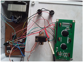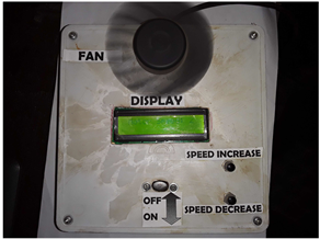 After wiring the components together, the assembly is encased with switch S1, labelled as power-on-off button, the Up and Down push buttons are labelled as speed increase and speed decrease as shown on the case, the LCD and a fan connected to the shaft of the motor are also displayed on the case as shown in Figure 3.