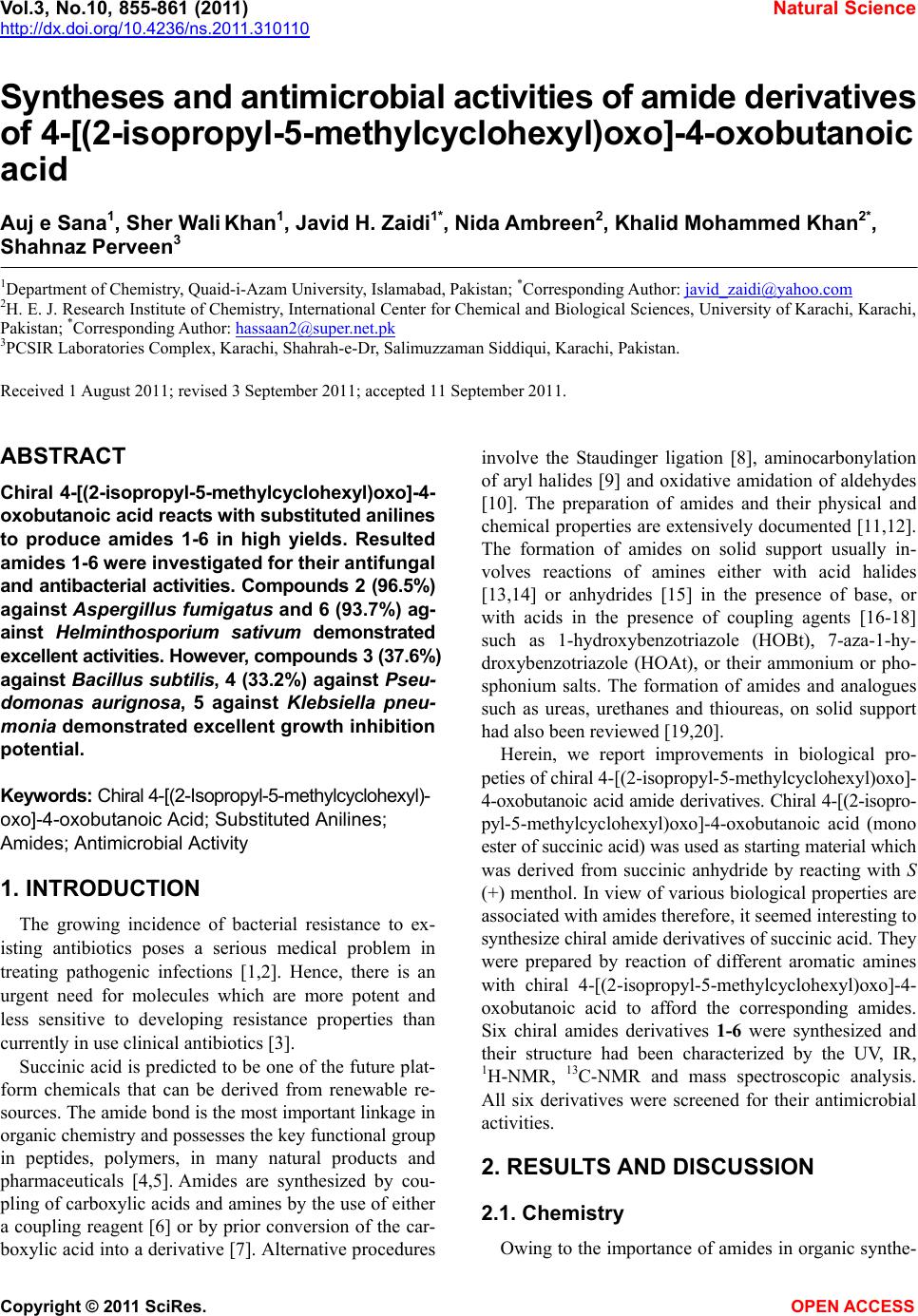 Vol.3, No.10, 855-861 (2011) Natural Science http://dx.doi.org/10.4236/ns.2011.310110 Copyright © 2011 SciRes. OPEN ACCESS Syntheses and antimicrobial activities of amide derivatives of 4-[(2-isopropyl-5-methylcyclohexyl)oxo]-4-oxobutanoic acid Auj e Sana1, Sher Wali Khan1, Javid H. Zaidi1*, Nida Ambreen2, Khalid Mohammed Khan2*, Shahnaz Perveen3 1Department of Chemistry, Quaid-i-Azam University, Islamabad, Pakistan; *Corresponding Author: javid_zaidi@yahoo.com 2H. E. J. Research Institute of Chemistry, International Center for Chemical and Biological Sciences, University of Karachi, Karachi, Pakistan; *Corresponding Author: hassaan2@super.net.pk 3PCSIR Laboratories Complex, Karachi, Shahrah-e-Dr, Salimuzzaman Siddiqui, Karachi, Pakistan. Received 1 August 2011; revised 3 September 2011; accepted 11 September 2011. ABSTRACT Chiral 4-[(2-isopropyl-5-methylcyclohexyl)oxo]-4- oxobutanoic acid reacts with substituted anilines to produce amides 1-6 in high yields. Resulted amides 1-6 were investigated for their antifungal and antibacterial activities. Compounds 2 (96.5%) against Aspergillus fumigatus and 6 (93.7%) ag- ainst Helminthosporium sativum demonstrated excellent activities. However, compounds 3 (37.6%) against Bacillus subtilis, 4 (33.2%) against Pseu- domonas aurignosa, 5 against Klebsiella pneu- monia demonstrated excellent growth inhibition potential. Keywords: Chiral 4-[(2-Isopropyl-5-methylcyclohexyl)- oxo]-4-oxobutanoic Acid; Substituted Anilines; Amides; Antimicrobial Activity 1. INTRODUCTION The growing incidence of bacterial resistance to ex- isting antibiotics poses a serious medical problem in treating pathogenic infections [1,2]. Hence, there is an urgent need for molecules which are more potent and less sensitive to developing resistance properties than currently in use clinical antibiotics [3]. Succinic acid is predicted to be one of the future plat- form chemicals that can be derived from renewable re- sources. The amide bond is the most important linkage in organic chemistry and possesses the key functional group in peptides, polymers, in many natural products and pharmaceuticals [4,5]. Amides are synthesized by cou- pling of carboxylic acids and amines by the use of either a coupling reagent [6] or by prior conversion of the car- boxylic acid into a derivative [7]. Alternative procedures involve the Staudinger ligation [8], aminocarbonylation of aryl halides [9] and oxidative amidation of aldehydes [10]. The preparation of amides and their physical and chemical properties are extensively documented [11,12]. The formation of amides on solid support usually in- volves reactions of amines either with acid halides [13,14] or anhydrides [15] in the presence of base, or with acids in the presence of coupling agents [16-18] such as 1-hydroxybenzotriazole (HOBt), 7-aza-1-hy- droxybenzotriazole (HOAt), or their ammonium or pho- sphonium salts. The formation of amides and analogues such as ureas, urethanes and thioureas, on solid support had also been reviewed [19,20]. Herein, we report improvements in biological pro- peties of chiral 4-[(2-isopropyl-5-methylcyclohexyl)oxo]- 4-oxobutanoic acid amide derivatives. Chiral 4-[(2-isopro- pyl-5-methylcyclohexyl)oxo]-4-oxobutanoic acid (mono ester of succinic acid) was used as starting material which was derived from succinic anhydride by reacting with S (+) menthol. In view of various biological properties are associated with amides therefore, it seemed interesting to synthesize chiral amide derivatives of succinic acid. They were prepared by reaction of different aromatic amines with chiral 4-[(2-isopropyl-5-methylcyclohexyl)oxo]-4- oxobutanoic acid to afford the corresponding amides. Six chiral amides derivatives 1-6 were synthesized and their structure had been characterized by the UV, IR, 1H-NMR, 13C-NMR and mass spectroscopic analysis. All six derivatives were screened for their antimicrobial activities. 2. RESULTS AND DISCUSSION 2.1. Chemistry Owing to the importance of amides in organic synthe-