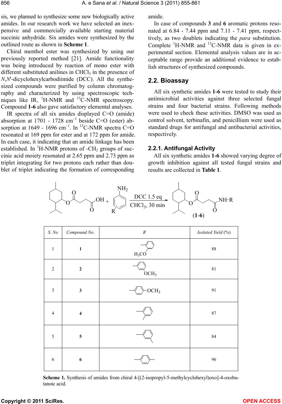 A. e Sana et al. / Natural Science 3 (2011) 855-861 Copyright © 2011 SciRes. OPEN ACCESS 856 sis, we planned to synthesize some new biologically active amides. In our research work we have selected an inex- pensive and commercially available starting material succinic anhydride. Six amides were synthesized by the outlined route as shown in Scheme 1. Chiral menthol ester was synthesized by using our previously reported method [21]. Amide functionality was being introduced by reaction of mono ester with different substituted anilines in CHCl3 in the presence of N,N'-dicyclohexylcarbodiimide (DCC). All the synthe- sized compounds were purified by column chromatog- raphy and characterized by using spectroscopic tech- niques like IR, 1H-NMR and 13C-NMR spectroscopy. Compound 1-6 also gave satisfactory elemental analyses. IR spectra of all six amides displayed C=O (amide) absorption at 1701 - 1728 cm–1 beside C=O (ester) ab- sorption at 1649 - 1696 cm–1. In 13C-NMR spectra C=O resonated at 169 ppm for ester and at 172 ppm for amide. In each case, it indicating that an amide linkage has been established. In 1H-NMR protons of -CH2 groups of suc- cinic acid moiety resonated at 2.65 ppm and 2.73 ppm as triplet integrating for two protons each rather than dou- blet of triplet indicating the formation of corresponding amide. In case of compounds 3 and 6 aromatic protons reso- nated at 6.84 - 7.44 ppm and 7.11 - 7.41 ppm, respect- tively, as two doublets indicating the para substitution. Complete 1H-NMR and 13C-NMR data is given in ex- perimental section. Elemental analysis values are in ac- ceptable range provide an additional evidence to estab- lish structures of synthesized compounds. 2.2. Bioassay All six synthetic amides 1-6 were tested to study their antimicrobial activities against three selected fungal strains and four bacterial strains. Following methods were used to check these activities. DMSO was used as control solvent, terbinafin, and penicillium were used as standard drugs for antifungal and antibacterial activities, respectively. 2.2.1. Antifungal Activity All six synthetic amides 1-6 showed varying degree of growth inhibition against all tested fungal strains and results are collected in Table 1. ONH O O R O O O OH NH2 R DCC 1.5 eq CHCl3, 30 min + (1-6) S. No Compound No. R Isolated Yield (%) 1 1 H3CO 88 2 2 OCH3 81 3 3 OCH3 91 4 4 87 5 5 84 6 6 96 Scheme 1. Synthesis of amides from chiral 4-[(2-isopropyl-5-methylcyclohexyl)oxo]-4-oxobu- tanoic acid.