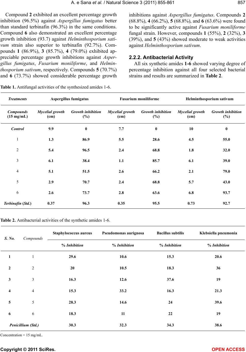 A. e Sana et al. / Natural Science 3 (2011) 855-861 Copyright © 2011 SciRes. OPEN ACCESS 857 857 Compound 2 exhibited an excellent percentage growth inhibition (96.5%) against Aspergillus fumigatus better than standard terbinafin (96.3%) in the same conditions. Compound 6 also demonstrated an excellent percentage growth inhibition (93.7) against Helminthosporium sati- vum strain also superior to terbinafin (92.7%). Com- pounds 1 (86.9%), 3 (85.7%), 4 (79.0%) exhibited ap- preciable percentage growth inhibitions against Asper- gillus fumigatus, Fusarium moniliforme, and Helmin- thosporium sativum, respectively. Compounds 5 (70.7%) and 6 (73.7%) showed considerable percentage growth inhibitions against Aspergillus fumigatus. Compounds 2 (68.8%), 4 (66.2%), 5 (68.8%), and 6 (63.6%) were found to be significantly active against Fusarium moniliforme fungal strain. However, compounds 1 (55%), 2 (32%), 3 (39%), and 5 (43%) showed moderate to weak activities against Helminthosporium sativum. 2.2.2. Antibacterial Activity All six synthetic amides 1-6 showed varying degree of percentage inhibition against all four selected bacterial strains and results are summarized in Table 2. Table 1. Antifungal activities of the synthesized amides 1-6. Treatments Aspergillus fumigatus Fusarium moniliforme Helminthosporium sativum Compounds (15 mg/mL) Mycelial growth (cm) Growth inhibition (%) Mycelial growth (cm) Growth inhibition (%) Mycelial growth (cm) Growth inhibition (%) Control 9.9 0 7.7 0 10 0 1 1.3 86.9 5.5 28.6 4.5 55.0 2 5.4 96.5 2.4 68.8 1.8 32.0 3 6.1 38.4 1.1 85.7 6.1 39.0 4 5.1 51.5 2.6 66.2 2.1 79.0 5 2.9 70.7 2.4 68.8 5.7 43.0 6 2.6 73.7 2.8 63.6 6.8 93.7 Terbinafin (Std.) 0.37 96.3 0.35 95.5 0.73 92.7 Table 2. Antibacterial activities of the synthetic amides 1-6. Staphylococcus aureus Pseudomonas aurignosa Bacillus subtilis Klebsiella pneumonia S. No. Compounds % Inhibition % Inhibition % Inhibition % Inhibition 1 1 29.6 10.6 15.3 20.6 2 2 20 10.5 18.3 36 3 3 16.3 12.6 37.6 19 4 4 15.3 33.2 16.3 21.3 5 5 28.3 14.6 24 39.6 6 6 18.3 11 22 19 Penicillium (Std.) 30.3 32.3 34.3 38.6 Concentration = 15 mg/mL.