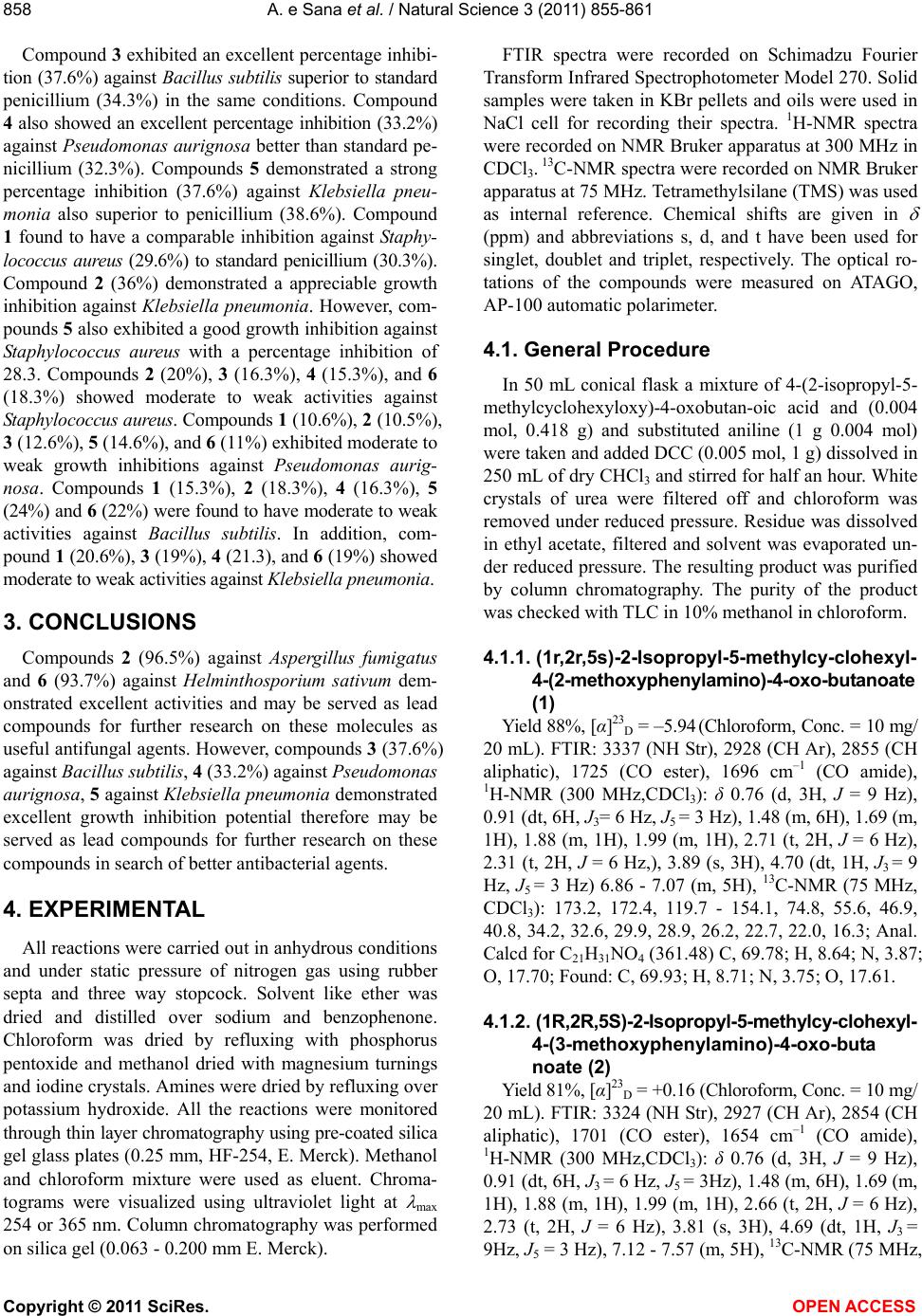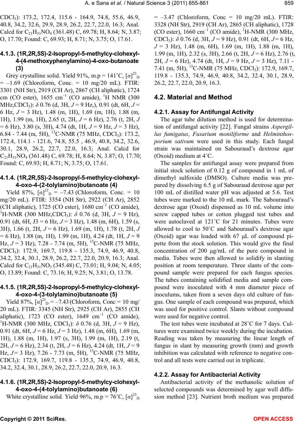 A. e Sana et al. / Natural Science 3 (2011) 855-861 Copyright © 2011 SciRes. OPEN ACCESS 858 Compound 3 exhibited an excellent percentage inhibi- tion (37.6%) against Bacillus subtilis superior to standard penicillium (34.3%) in the same conditions. Compound 4 also showed an excellent percentage inhibition (33.2%) against Pseudomonas aurignosa better than standard pe- nicillium (32.3%). Compounds 5 demonstrated a strong percentage inhibition (37.6%) against Klebsiella pneu- monia also superior to penicillium (38.6%). Compound 1 found to have a comparable inhibition against Staphy- lococcus aureus (29.6%) to standard penicillium (30.3%). Compound 2 (36%) demonstrated a appreciable growth inhibition against Klebsiella pneumonia. However, com- pounds 5 also exhibited a good growth inhibition against Staphylococcus aureus with a percentage inhibition of 28.3. Compounds 2 (20%), 3 (16.3%), 4 (15.3%), and 6 (18.3%) showed moderate to weak activities against Staphylococcus aureus. Compounds 1 (10.6%), 2 (10.5%), 3 (12.6%), 5 (14.6%), and 6 (11%) exhibited moderate to weak growth inhibitions against Pseudomonas aurig- nosa. Compounds 1 (15.3%), 2 (18.3%), 4 (16.3%), 5 (24%) and 6 (22%) were found to have moderate to weak activities against Bacillus subtilis. In addition, com- pound 1 (20.6%), 3 (19%), 4 (21.3), and 6 (19%) showed moderate to weak activities against Klebsiella pneumonia. 3. CONCLUSIONS Compounds 2 (96.5%) against Aspergillus fumigatus and 6 (93.7%) against Helminthosporium sativum dem- onstrated excellent activities and may be served as lead compounds for further research on these molecules as useful antifungal agents. However, compounds 3 (37.6%) against Bacillus subtilis, 4 (33.2%) against Pseudomonas aurignosa, 5 against Klebsiella pneumonia demonstrated excellent growth inhibition potential therefore may be served as lead compounds for further research on these compounds in search of better antibacterial agents. 4. EXPERIMENTAL All reactions were carried out in anhydrous conditions and under static pressure of nitrogen gas using rubber septa and three way stopcock. Solvent like ether was dried and distilled over sodium and benzophenone. Chloroform was dried by refluxing with phosphorus pentoxide and methanol dried with magnesium turnings and iodine crystals. Amines were dried by refluxing over potassium hydroxide. All the reactions were monitored through thin layer chromatography using pre-coated silica gel glass plates (0.25 mm, HF-254, E. Merck). Methanol and chloroform mixture were used as eluent. Chroma- tograms were visualized using ultraviolet light at max 254 or 365 nm. Column chromatography was performed on silica gel (0.063 - 0.200 mm E. Merck). FTIR spectra were recorded on Schimadzu Fourier Transform Infrared Spectrophotometer Model 270. Solid samples were taken in KBr pellets and oils were used in NaCl cell for recording their spectra. 1H-NMR spectra were recorded on NMR Bruker apparatus at 300 MHz in CDCl3. 13C-NMR spectra were recorded on NMR Bruker apparatus at 75 MHz. Tetramethylsilane (TMS) was used as internal reference. Chemical shifts are given in (ppm) and abbreviations s, d, and t have been used for singlet, doublet and triplet, respectively. The optical ro- tations of the compounds were measured on ATAGO, AP-100 automatic polarimeter. 4.1. General Procedure In 50 mL conical flask a mixture of 4-(2-isopropyl-5- methylcyclohexyloxy)-4-oxobutan-oic acid and (0.004 mol, 0.418 g) and substituted aniline (1 g 0.004 mol) were taken and added DCC (0.005 mol, 1 g) dissolved in 250 mL of dry CHCl3 and stirred for half an hour. White crystals of urea were filtered off and chloroform was removed under reduced pressure. Residue was dissolved in ethyl acetate, filtered and solvent was evaporated un- der reduced pressure. The resulting product was purified by column chromatography. The purity of the product was checked with TLC in 10% methanol in chloroform. 4.1.1. (1r,2r,5s)-2-Isopropyl-5-methylcy-clohexyl- 4-(2-methoxyphenylamino)-4-oxo-butanoate (1) Yield 88%, [α]23 D = –5.94 (Chloroform, Conc. = 10 mg/ 20 mL). FTIR: 3337 (NH Str), 2928 (CH Ar), 2855 (CH aliphatic), 1725 (CO ester), 1696 cm–1 (CO amide), 1H-NMR (300 MHz,CDCl3): δ 0.76 (d, 3H, J = 9 Hz), 0.91 (dt, 6H, J3= 6 Hz, J5 = 3 Hz), 1.48 (m, 6H), 1.69 (m, 1H), 1.88 (m, 1H), 1.99 (m, 1H), 2.71 (t, 2H, J = 6 Hz), 2.31 (t, 2H, J = 6 Hz,), 3.89 (s, 3H), 4.70 (dt, 1H, J3 = 9 Hz, J5 = 3 Hz) 6.86 - 7.07 (m, 5H), 13C-NMR (75 MHz, CDCl3): 173.2, 172.4, 119.7 - 154.1, 74.8, 55.6, 46.9, 40.8, 34.2, 32.6, 29.9, 28.9, 26.2, 22.7, 22.0, 16.3; Anal. Calcd for C21H31NO4 (361.48) C, 69.78; H, 8.64; N, 3.87; O, 17.70; Found: C, 69.93; H, 8.71; N, 3.75; O, 17.61. 4.1.2. (1R,2R,5S)-2-Isopropyl-5-methylcy-clohexyl- 4-(3-methoxyphenylamino)-4-oxo-buta noate (2) Yield 81%, [α]23 D = +0.16 (Chloroform, Conc. = 10 mg/ 20 mL). FTIR: 3324 (NH Str), 2927 (CH Ar), 2854 (CH aliphatic), 1701 (CO ester), 1654 cm–1 (CO amide), 1H-NMR (300 MHz,CDCl3): δ 0.76 (d, 3H, J = 9 Hz), 0.91 (dt, 6H, J3 = 6 Hz, J5 = 3Hz), 1.48 (m, 6H), 1.69 (m, 1H), 1.88 (m, 1H), 1.99 (m, 1H), 2.66 (t, 2H, J = 6 Hz), 2.73 (t, 2H, J = 6 Hz), 3.81 (s, 3H), 4.69 (dt, 1H, J3 = 9Hz, J5 = 3 Hz), 7.12 - 7.57 (m, 5H), 13C-NMR (75 MHz,