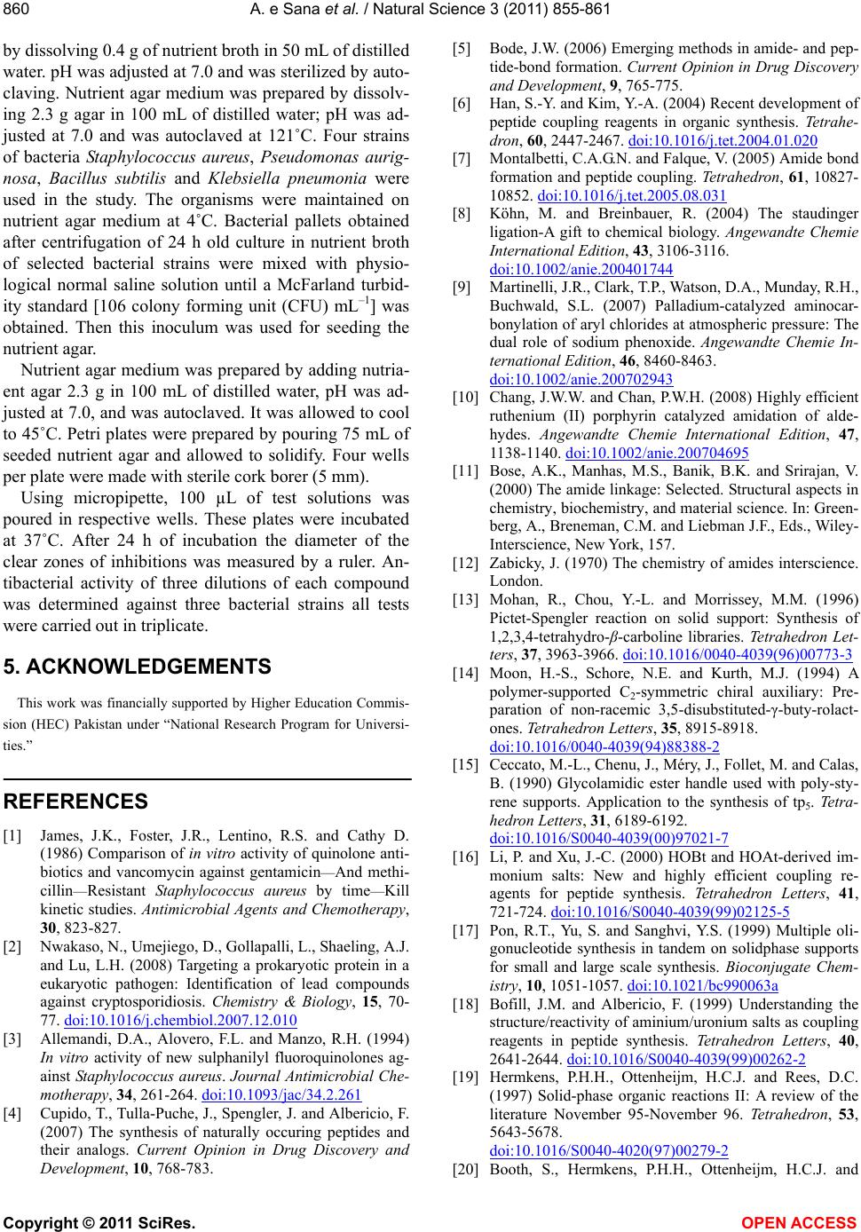 A. e Sana et al. / Natural Science 3 (2011) 855-861 Copyright © 2011 SciRes. OPEN ACCESS 860 by dissolving 0.4 g of nutrient broth in 50 mL of distilled water. pH was adjusted at 7.0 and was sterilized by auto- claving. Nutrient agar medium was prepared by dissolv- ing 2.3 g agar in 100 mL of distilled water; pH was ad- justed at 7.0 and was autoclaved at 121˚C. Four strains of bacteria Staphylococcus aureus, Pseudomonas aurig- nosa, Bacillus subtilis and Klebsiella pneumonia were used in the study. The organisms were maintained on nutrient agar medium at 4˚C. Bacterial pallets obtained after centrifugation of 24 h old culture in nutrient broth of selected bacterial strains were mixed with physio- logical normal saline solution until a McFarland turbid- ity standard [106 colony forming unit (CFU) mL–1] was obtained. Then this inoculum was used for seeding the nutrient agar. Nutrient agar medium was prepared by adding nutria- ent agar 2.3 g in 100 mL of distilled water, pH was ad- justed at 7.0, and was autoclaved. It was allowed to cool to 45˚C. Petri plates were prepared by pouring 75 mL of seeded nutrient agar and allowed to solidify. Four wells per plate were made with sterile cork borer (5 mm). Using micropipette, 100 µL of test solutions was poured in respective wells. These plates were incubated at 37˚C. After 24 h of incubation the diameter of the clear zones of inhibitions was measured by a ruler. An- tibacterial activity of three dilutions of each compound was determined against three bacterial strains all tests were carried out in triplicate. 5. ACKNOWLEDGEMENTS This work was financially supported by Higher Education Commis- sion (HEC) Pakistan under “National Research Program for Universi- ties.” REFERENCES [1] James, J.K., Foster, J.R., Lentino, R.S. and Cathy D. (1986) Comparison of in vitro activity of quinolone anti- biotics and vancomycin against gentamicin—And methi- cillin—Resistant Staphylococcus aureus by time—Kill kinetic studies. Antimicrobial Agents and Chemotherapy, 30, 823-827. [2] Nwakaso, N., Umejiego, D., Gollapalli, L., Shaeling, A.J. and Lu, L.H. (2008) Targeting a prokaryotic protein in a eukaryotic pathogen: Identification of lead compounds against cryptosporidiosis. Chemistry & Biology, 15, 70- 77. doi:10.1016/j.chembiol.2007.12.010 [3] Allemandi, D.A., Alovero, F.L. and Manzo, R.H. (1994) In vitro activity of new sulphanilyl fluoroquinolones ag- ainst Staphylococcus aureus. Journal Antimicrobial Che- motherapy, 34, 261-264. doi:10.1093/jac/34.2.261 [4] Cupido, T., Tulla-Puche, J., Spengler, J. and Albericio, F. (2007) The synthesis of naturally occuring peptides and their analogs. Current Opinion in Drug Discovery and Development, 10, 768-783. [5] Bode, J.W. (2006) Emerging methods in amide- and pep- tide-bond formation. Current Opinion in Drug Discovery and Development, 9, 765-775. [6] Han, S.-Y. and Kim, Y.-A. (2004) Recent development of peptide coupling reagents in organic synthesis. Tetrahe- dron, 60, 2447-2467. doi:10.1016/j.tet.2004.01.020 [7] Montalbetti, C.A.G.N. and Falque, V. (2005) Amide bond formation and peptide coupling. Tetrahedron, 61, 10827- 10852. doi:10.1016/j.tet.2005.08.031 [8] Köhn, M. and Breinbauer, R. (2004) The staudinger ligation-A gift to chemical biology. Angewandte Chemie International Edition, 43, 3106-3116. doi:10.1002/anie.200401744 [9] Martinelli, J.R., Clark, T.P., Watson, D.A., Munday, R.H., Buchwald, S.L. (2007) Palladium-catalyzed aminocar- bonylation of aryl chlorides at atmospheric pressure: The dual role of sodium phenoxide. Angewandte Chemie In- ternational Edition, 46, 8460-8463. doi:10.1002/anie.200702943 [10] Chang, J.W.W. and Chan, P.W.H. (2008) Highly efficient ruthenium (II) porphyrin catalyzed amidation of alde- hydes. Angewandte Chemie International Edition, 47, 1138-1140. doi:10.1002/anie.200704695 [11] Bose, A.K., Manhas, M.S., Banik, B.K. and Srirajan, V. (2000) The amide linkage: Selected. Structural aspects in chemistry, biochemistry, and material science. In: Green- berg, A., Breneman, C.M. and Liebman J.F., Eds., Wiley- Interscience, New York, 157. [12] Zabicky, J. (1970) The chemistry of amides interscience. London. [13] Mohan, R., Chou, Y.-L. and Morrissey, M.M. (1996) Pictet-Spengler reaction on solid support: Synthesis of 1,2,3,4-tetrahydro-β-carboline libraries. Tetrahedron Let- ters, 37, 3963-3966. doi:10.1016/0040-4039(96)00773-3 [14] Moon, H.-S., Schore, N.E. and Kurth, M.J. (1994) A polymer-supported C2-symmetric chiral auxiliary: Pre- paration of non-racemic 3,5-disubstituted-γ-buty-rolact- ones. Tetrahedron Letters, 35, 8915-8918. doi:10.1016/0040-4039(94)88388-2 [15] Ceccato, M.-L., Chenu, J., Méry, J., Follet, M. and Calas, B. (1990) Glycolamidic ester handle used with poly-sty- rene supports. Application to the synthesis of tp5. Tetra- hedron Letters, 31, 6189-6192. doi:10.1016/S0040-4039(00)97021-7 [16] Li, P. and Xu, J.-C. (2000) HOBt and HOAt-derived im- monium salts: New and highly efficient coupling re- agents for peptide synthesis. Tetrahedron Letters, 41, 721-724. doi:10.1016/S0040-4039(99)02125-5 [17] Pon, R.T., Yu, S. and Sanghvi, Y.S. (1999) Multiple oli- gonucleotide synthesis in tandem on solidphase supports for small and large scale synthesis. Bioconjugate Chem- istry, 10, 1051-1057. doi:10.1021/bc990063a [18] Bofill, J.M. and Albericio, F. (1999) Understanding the structure/reactivity of aminium/uronium salts as coupling reagents in peptide synthesis. Tetrahedron Letters, 40, 2641-2644. doi:10.1016/S0040-4039(99)00262-2 [19] Hermkens, P.H.H., Ottenheijm, H.C.J. and Rees, D.C. (1997) Solid-phase organic reactions II: A review of the literature November 95-November 96. Tetrahedron, 53, 5643-5678. doi:10.1016/S0040-4020(97)00279-2 [20] Booth, S., Hermkens, P.H.H., Ottenheijm, H.C.J. and