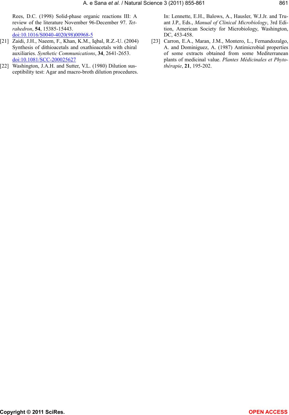 A. e Sana et al. / Natural Science 3 (2011) 855-861 Copyright © 2011 SciRes. OPEN ACCESS 861 861 Rees, D.C. (1998) Solid-phase organic reactions III: A review of the literature November 96-December 97. Tet- rahedron, 54, 15385-15443. doi:10.1016/S0040-4020(98)00968-5 [21] Zaidi, J.H., Naeem, F., Khan, K.M., Iqbal, R.Z.-U. (2004) Synthesis of dithioacetals and oxathioacetals with chiral auxiliaries. Synthetic Communications, 34, 2641-2653. doi:10.1081/SCC-200025627 [22] Washington, J.A.H. and Sutter, V.L. (1980) Dilution sus- ceptibility test: Agar and macro-broth dilution procedures. In: Lennette, E.H., Balows, A., Hausler, W.J.Jr. and Tru- ant J.P., Eds., Manual of Clinical Microbiology, 3rd Edi- tion, American Society for Microbiology, Washington, DC, 453-458. [23] Carron, E.A., Maran, J.M., Montero, L., Fernandozalgo, A. and Dominiguez, A. (1987) Antimicrobial properties of some extracts obtained from some Mediterranean plants of medicinal value. Plantes Médicinales et Phyto- thérapie, 21, 195-202.