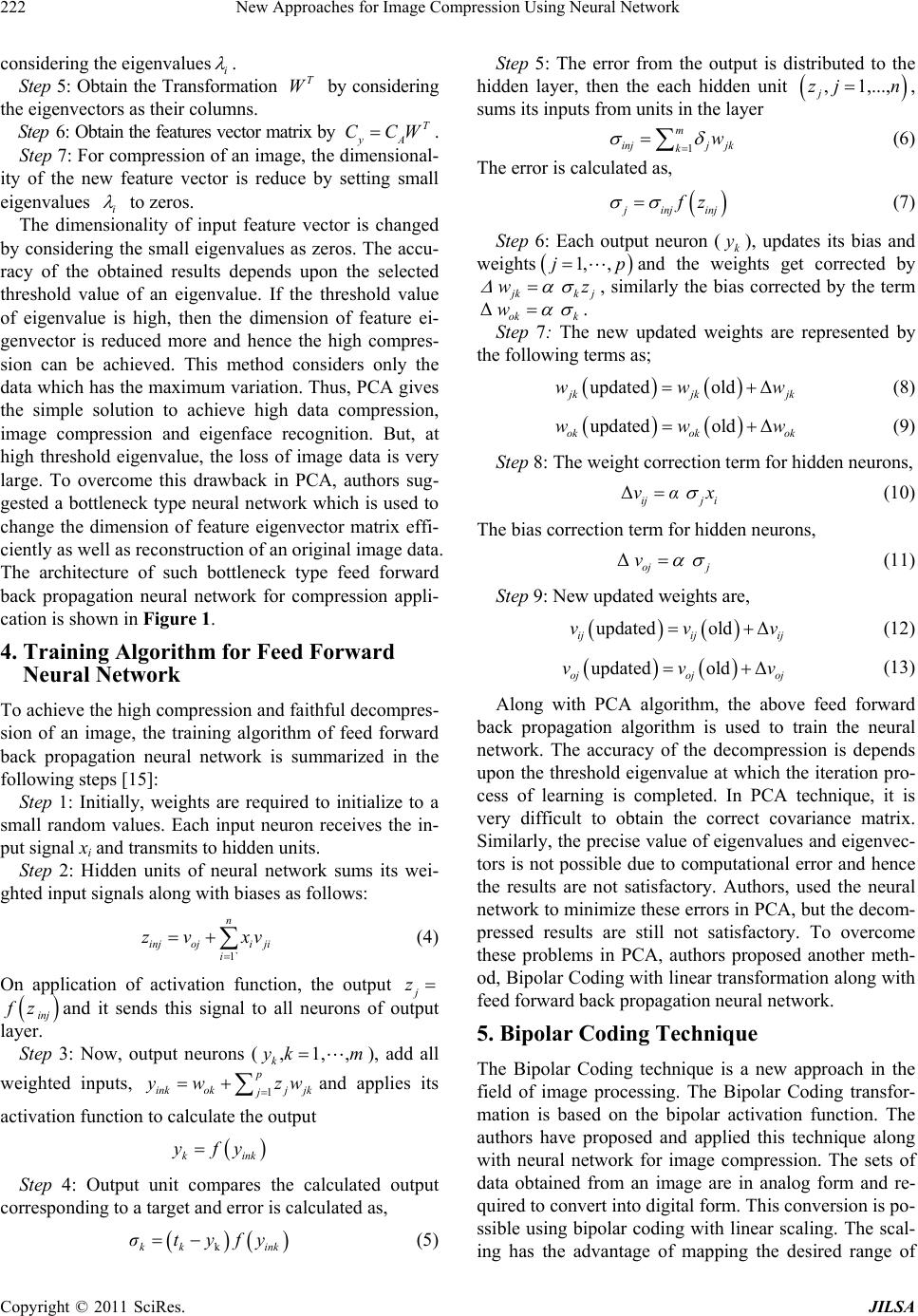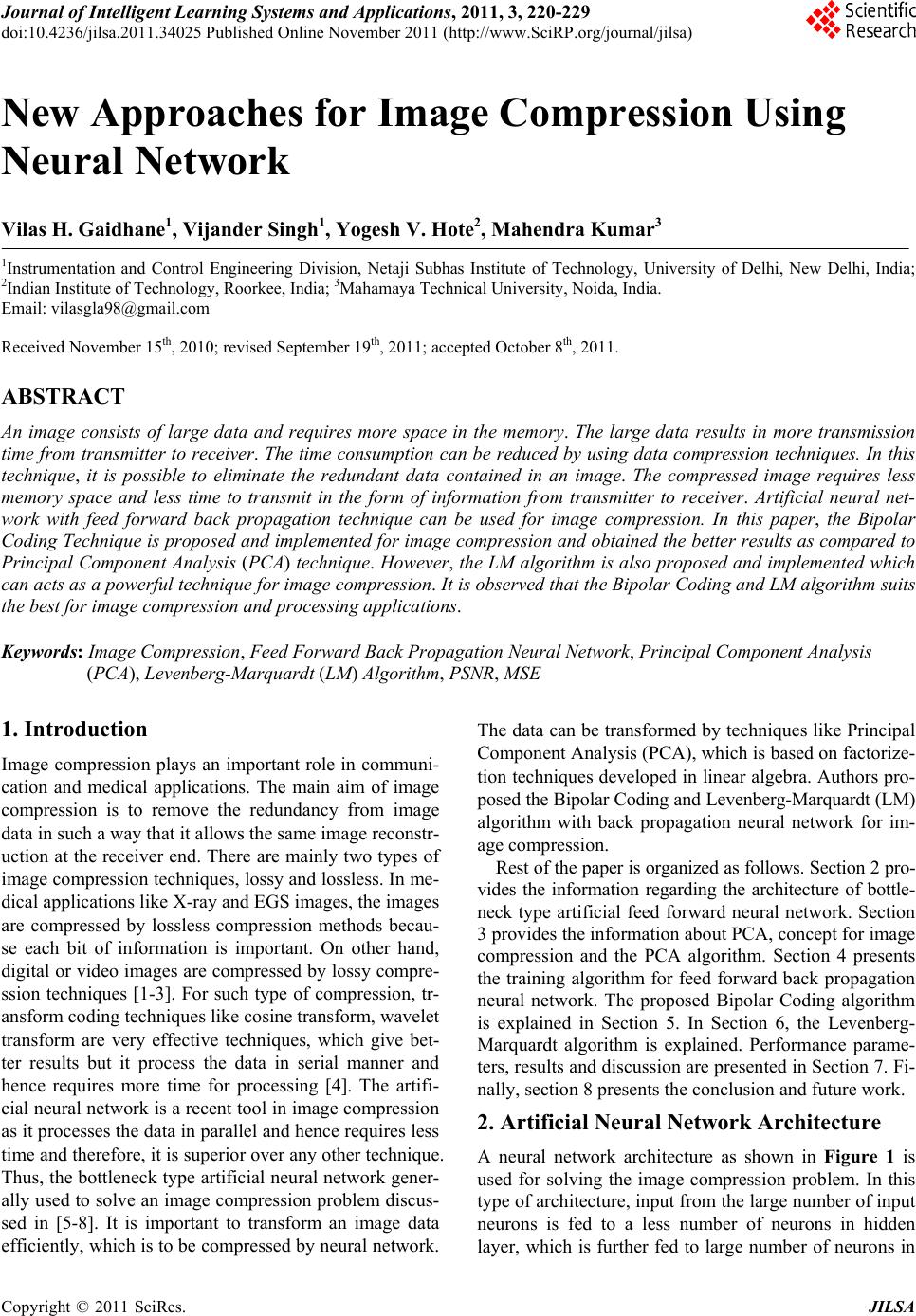 Journal of Intelligent Learning Systems and Applications, 2011, 3, 220-229 doi:10.4236/jilsa.2011.34025 Published Online November 2011 (http://www.SciRP.org/journal/jilsa) Copyright © 2011 SciRes. JILSA New Approaches for Image Compression Using Neural Network Vilas H. Gaidhane1, Vijander Singh1, Yogesh V. Hote2, Mahendra Kumar3 1Instrumentation and Control Engineering Division, Netaji Subhas Institute of Technology, University of Delhi, New Delhi, India; 2Indian Institute of Technology, Roorkee, India; 3Mahamaya Technical University, Noida, India. Email: vilasgla98@gmail.com Received November 15th, 2010; revised September 19th, 2011; accepted October 8th, 2011. ABSTRACT An image consists of large data and requires more space in the memory. The large data results in more transmission time from transmitter to receiver. The time consumption can be reduced by using data compression techniques. In this technique, it is possible to eliminate the redundant data contained in an image. The compressed image requires less memory space and less time to transmit in the form of information from transmitter to receiver. Artificial neural net- work with feed forward back propagation technique can be used for image compression. In this paper, the Bipolar Coding Technique is proposed and implemented for image compression and obtained the better results as compared to Principal Component Analysis (PCA) technique. However, the LM algorithm is also proposed and implemented which can acts as a powerful technique for image compression. It is observed that the Bipolar Coding and LM algorithm suits the best for image compression and processing applications. Keywords: Image Compression, Feed Forward Back Propagation Neural Network, Principal Component Analysis (PCA), Levenberg-Marquardt (LM) Algorithm, PSNR, MSE 1. Introduction Image compression plays an important role in communi- cation and medical applications. The main aim of image compression is to remove the redundancy from image data in such a way that it allows the same image reconstr- uction at the receiver end. There are mainly two types of image compression techniques, lossy and lossless. In me- dical applications like X-ray and EGS images, the images are compressed by lossless compression methods becau- se each bit of information is important. On other hand, digital or video images are compressed by lossy compre- ssion techniques [1-3]. For such type of compression, tr- ansform coding techniques like cosine transform, wavelet transform are very effective techniques, which give bet- ter results but it process the data in serial manner and hence requires more time for processing [4]. The artifi- cial neural network is a recent tool in image compression as it processes the data in parallel and hence requires less time and therefore, it is superior over any other technique. Thus, the bottleneck type artificial neural network gener- ally used to solve an image compression problem discus- sed in [5-8]. It is important to transform an image data efficiently, which is to be compressed by neural network. The data can be transformed by techniques like Principal Component Analysis (PCA), which is based on factorize- tion techniques developed in linear algebra. Authors pro- posed the Bipolar Coding and Levenberg-Marquardt (LM) algorithm with back propagation neural network for im- age compression. Rest of the paper is organized as follows. Section 2 pro- vides the information regarding the architecture of bottle- neck type artificial feed forward neural network. Section 3 provides the information about PCA, concept for image compression and the PCA algorithm. Section 4 presents the training algorithm for feed forward back propagation neural network. The proposed Bipolar Coding algorithm is explained in Section 5. In Section 6, the Levenberg- Marquardt algorithm is explained. Performance parame- ters, results and discussion are presented in Section 7. Fi- nally, section 8 presents the conclusion and future work. 2. Artificial Neural Network Architecture A neural network architecture as shown in Figure 1 is used for solving the image compression problem. In this type of architecture, input from the large number of input neurons is fed to a less number of neurons in hidden layer, which is further fed to large number of neurons in