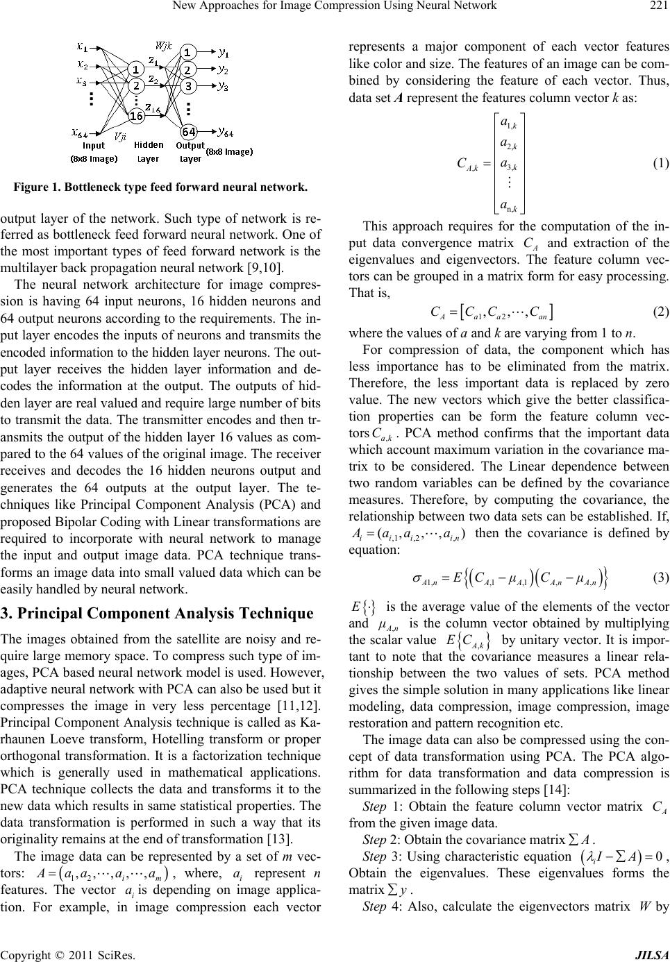 New Approaches for Image Compression Using Neural Network221 Figure 1. Bottleneck type feed forw ard neural networ k. output layer of the network. Such type of network is re- ferred as bottleneck feed forward neural network. One of the most important types of feed forward network is the multilayer back propagation neural network [9,10]. The neural network architecture for image compres- sion is having 64 input neurons, 16 hidden neurons and 64 output neurons according to the requirements. The in- put layer encodes the inputs of neurons and transmits the encoded information to the hidden layer neurons. The out- put layer receives the hidden layer information and de- codes the information at the output. The outputs of hid- den layer are real valued and require large number of bits to transmit the data. The transmitter encodes and then tr- ansmits the output of the hidden layer 16 values as com- pared to the 64 values of the original image. The receiver receives and decodes the 16 hidden neurons output and generates the 64 outputs at the output layer. The te- chniques like Principal Component Analysis (PCA) and proposed Bipolar Coding with Linear transformations are required to incorporate with neural network to manage the input and output image data. PCA technique trans- forms an image data into small valued data which can be easily handled by neural network. 3. Principal Component Analysis Technique The images obtained from the satellite are noisy and re- quire large memory space. To compress such type of im- ages, PCA based neural network model is used. However, adaptive neural network with PCA can also be used but it compresses the image in very less percentage [11,12]. Principal Component Analysis technique is called as Ka- rhaunen Loeve transform, Hotelling transform or proper orthogonal transformation. It is a factorization technique which is generally used in mathematical applications. PCA technique collects the data and transforms it to the new data which results in same statistical properties. The data transformation is performed in such a way that its originality remains at the end of transformation [13]. The image data can be represented by a set of m vec- tors: 12 ,,,,, im aaa a a , where, i represent n features. The vector iis depending on image applica- tion. For example, in image compression each vector represents a major component of each vector features like color and size. The features of an image can be com- bined by considering the feature of each vector. Thus, data set A represent the features column vector k as: a 1, 2, 3, , n, k k k Ak k a a a C a (1) This approach requires for the computation of the in- put data convergence matrix A and extraction of the eigenvalues and eigenvectors. The feature column vec- tors can be grouped in a matrix form for easy processing. That is, C 12 ,,, Aaa an CCC C (2) where the values of a and k are varying from 1 to n. For compression of data, the component which has less importance has to be eliminated from the matrix. Therefore, the less important data is replaced by zero value. The new vectors which give the better classifica- tion properties can be form the feature column vec- tors ,ak. PCA method confirms that the important data which account maximum variation in the covariance ma- trix to be considered. The Linear dependence between two random variables can be defined by the covariance measures. Therefore, by computing the covariance, the relationship between two data sets can be established. If, ,1 C (, ii,2 , ,, ) i in aa a then the covariance is defined by equation: 1,,1 ,1,,A nAAAnAn EC μCμ (3) E is the average value of the elements of the vector and ,An is the column vector obtained by multiplying the scalar value ,Ak EC by unitary vector. It is impor- tant to note that the covariance measures a linear rela- tionship between the two values of sets. PCA method gives the simple solution in many applications like linear modeling, data compression, image compression, image restoration and pattern recognition etc. The image data can also be compressed using the con- cept of data transformation using PCA. The PCA algo- rithm for data transformation and data compression is summarized in the following steps [14]: Step 1: Obtain the feature column vector matrix from the given image data. A C Step 2: Obtain the covariance matrix . Step 3: Using characteristic equation 0 iIA , Obtain the eigenvalues. These eigenvalues forms the matrix y . Step 4: Also, calculate the eigenvectors matrix by W Copyright © 2011 SciRes. JILSA