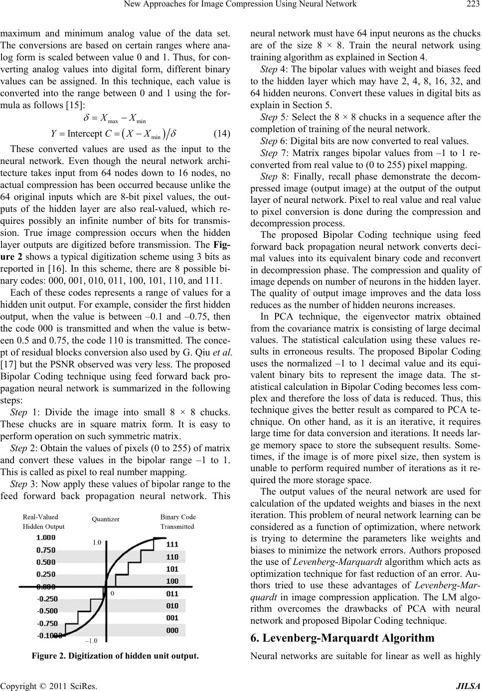 New Approaches for Image Compression Using Neural Network223 maximum and minimum analog value of the data set. The conversions are based on certain ranges where ana- log form is scaled between value 0 and 1. Thus, for con- verting analog values into digital form, different binary values can be assigned. In this technique, each value is converted into the range between 0 and 1 using the for- mula as follows [15]: max min X min Intercept YCXX (14) These converted values are used as the input to the neural network. Even though the neural network archi- tecture takes input from 64 nodes down to 16 nodes, no actual compression has been occurred because unlike the 64 original inputs which are 8-bit pixel values, the out- puts of the hidden layer are also real-valued, which re- quires possibly an infinite number of bits for transmis- sion. True image compression occurs when the hidden layer outputs are digitized before transmission. The Fig- ure 2 shows a typical digitization scheme using 3 bits as reported in [16]. In this scheme, there are 8 possible bi- nary codes: 000, 001, 010, 011, 100, 101, 110, and 111. Each of these codes represents a range of values for a hidden unit output. For example, consider the first hidden output, when the value is between –0.1 and –0.75, then the code 000 is transmitted and when the value is betw- een 0.5 and 0.75, the code 110 is transmitted. The conce- pt of residual blocks conversion also used by G. Qiu et al. [17] but the PSNR observed was very less. The proposed Bipolar Coding technique using feed forward back pro- pagation neural network is summarized in the following steps: Step 1: Divide the image into small 8 × 8 chucks. These chucks are in square matrix form. It is easy to perform operation on such symmetric matrix. Step 2: Obtain the values of pixels (0 to 255) of matrix and convert these values in the bipolar range –1 to 1. This is called as pixel to real number mapping. Step 3: Now apply these values of bipolar range to the feed forward back propagation neural network. This Figure 2. Digitization of hidden unit output. neural network must have 64 input neurons as the chucks are of the size 8 × 8. Train the neural network using training algorithm as explained in Section 4. Step 4: The bipolar values with weight and biases feed to the hidden layer which may have 2, 4, 8, 16, 32, and 64 hidden neurons. Convert these values in digital bits as explain in Section 5. Step 5: Select the 8 × 8 chucks in a sequence after the completion of training of the neural network. Step 6: Digital bits are now converted to real values. Step 7: Matrix ranges bipolar values from –1 to 1 re- converted from real value to (0 to 255) pixel mapping. Step 8: Finally, recall phase demonstrate the decom- pressed image (output image) at the output of the output layer of neural network. Pixel to real value and real value to pixel conversion is done during the compression and decompression process. The proposed Bipolar Coding technique using feed forward back propagation neural network converts deci- mal values into its equivalent binary code and reconvert in decompression phase. The compression and quality of image depends on number of neurons in the hidden layer. The quality of output image improves and the data loss reduces as the number of hidden neurons increases. In PCA technique, the eigenvector matrix obtained from the covariance matrix is consisting of large decimal values. The statistical calculation using these values re- sults in erroneous results. The proposed Bipolar Coding uses the normalized –1 to 1 decimal value and its equi- valent binary bits to represent the image data. The st- atistical calculation in Bipolar Coding becomes less com- plex and therefore the loss of data is reduced. Thus, this technique gives the better result as compared to PCA te- chnique. On other hand, as it is an iterative, it requires large time for data conversion and iterations. It needs lar- ge memory space to store the subsequent results. Some- times, if the image is of more pixel size, then system is unable to perform required number of iterations as it re- quired the more storage space. The output values of the neural network are used for calculation of the updated weights and biases in the next iteration. This problem of neural network learning can be considered as a function of optimization, where network is trying to determine the parameters like weights and biases to minimize the network errors. Authors proposed the use of Levenberg-Marquardt algorithm which acts as optimization technique for fast reduction of an error. Au- thors tried to use these advantages of Levenberg-Mar- quardt in image compression application. The LM algo- rithm overcomes the drawbacks of PCA with neural network and proposed Bipolar Coding technique. 6. Levenberg-Marquardt Algorithm Neural networks are suitable for linear as well as highly Copyright © 2011 SciRes. JILSA