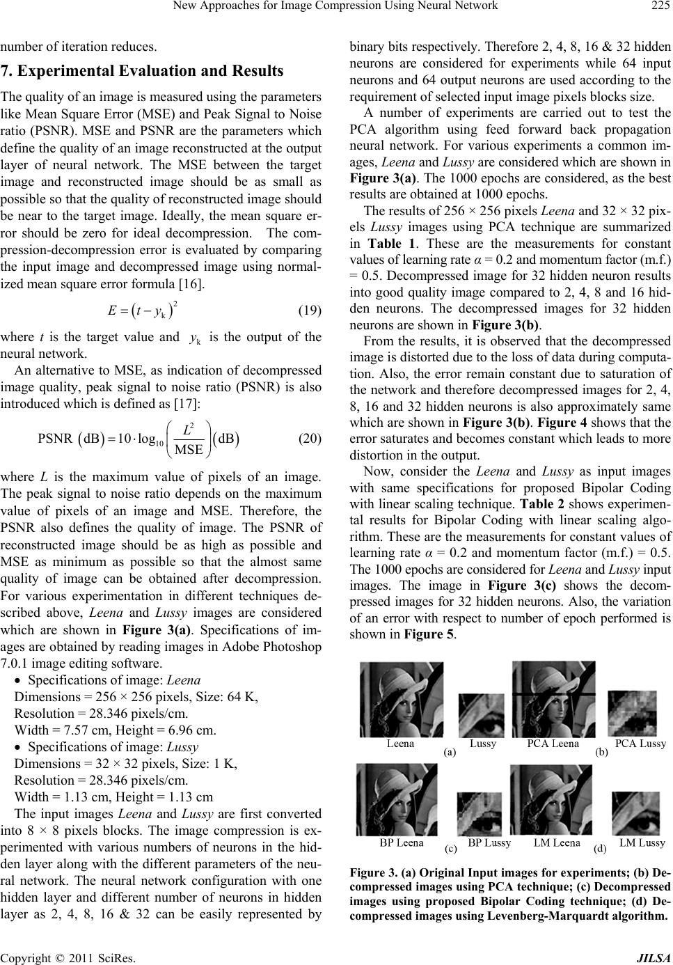 New Approaches for Image Compression Using Neural Network225 number of iteration reduces. 7. Experimental Evaluation and Results The quality of an image is measured using the parameters like Mean Square Error (MSE) and Peak Signal to Noise ratio (PSNR). MSE and PSNR are the parameters which define the quality of an image reconstructed at the output layer of neural network. The MSE between the target image and reconstructed image should be as small as possible so that the quality of reconstructed image should be near to the target image. Ideally, the mean square er- ror should be zero for ideal decompression. The com- pression-decompression error is evaluated by comparing the input image and decompressed image using normal- ized mean square error formula [16]. 2 k Ety (19) where t is the target value and is the output of the neural network. k y An alternative to MSE, as indication of decompressed image quality, peak signal to noise ratio (PSNR) is also introduced which is defined as [17]: 2 10 PSNR dB10logdB MSE L (20) where L is the maximum value of pixels of an image. The peak signal to noise ratio depends on the maximum value of pixels of an image and MSE. Therefore, the PSNR also defines the quality of image. The PSNR of reconstructed image should be as high as possible and MSE as minimum as possible so that the almost same quality of image can be obtained after decompression. For various experimentation in different techniques de- scribed above, Leena and Lussy images are considered which are shown in Figure 3(a). Specifications of im- ages are obtained by reading images in Adobe Photoshop 7.0.1 image editing software. Specifications of image: Leena Dimensions = 256 × 256 pixels, Size: 64 K, Resolution = 28.346 pixels/cm. Width = 7.57 cm, Height = 6.96 cm. Specifications of image: Lussy Dimensions = 32 × 32 pixels, Size: 1 K, Resolution = 28.346 pixels/cm. Width = 1.13 cm, Height = 1.13 cm The input images Leena and Lussy are first converted into 8 × 8 pixels blocks. The image compression is ex- perimented with various numbers of neurons in the hid- den layer along with the different parameters of the neu- ral network. The neural network configuration with one hidden layer and different number of neurons in hidden layer as 2, 4, 8, 16 & 32 can be easily represented by binary bits respectively. Therefore 2, 4, 8, 16 & 32 hidden neurons are considered for experiments while 64 input neurons and 64 output neurons are used according to the requirement of selected input image pixels blocks size. A number of experiments are carried out to test the PCA algorithm using feed forward back propagation neural network. For various experiments a common im- ages, Leena and Lussy are considered which are shown in Figure 3(a). The 1000 epochs are considered, as the best results are obtained at 1000 epochs. The results of 256 × 256 pixels Leena and 32 × 32 pix- els Lussy images using PCA technique are summarized in Table 1. These are the measurements for constant values of learning rate α = 0.2 and momentum factor (m.f.) = 0.5. Decompressed image for 32 hidden neuron results into good quality image compared to 2, 4, 8 and 16 hid- den neurons. The decompressed images for 32 hidden neurons are shown in Fi gure 3(b). From the results, it is observed that the decompressed image is distorted due to the loss of data during computa- tion. Also, the error remain constant due to saturation of the network and therefore decompressed images for 2, 4, 8, 16 and 32 hidden neurons is also approximately same which are shown in Figure 3(b). Figure 4 shows that the error saturates and becomes constant which leads to more distortion in the output. Now, consider the Leena and Lussy as input images with same specifications for proposed Bipolar Coding with linear scaling technique. Table 2 shows experimen- tal results for Bipolar Coding with linear scaling algo- rithm. These are the measurements for constant values of learning rate α = 0.2 and momentum factor (m.f.) = 0.5. The 1000 epochs are considered for Leena and Lussy input images. The image in Figure 3(c) shows the decom- pressed images for 32 hidden neurons. Also, the variation of an error with respect to number of epoch performed is shown in Figure 5. Figure 3. (a) Original Input images for experiments; (b) De- compressed images using PCA tec hnique; (c) Decompressed images using proposed Bipolar Coding technique; (d) De- compressed images using Levenberg-Marquardt algorithm. Copyright © 2011 SciRes. JILSA