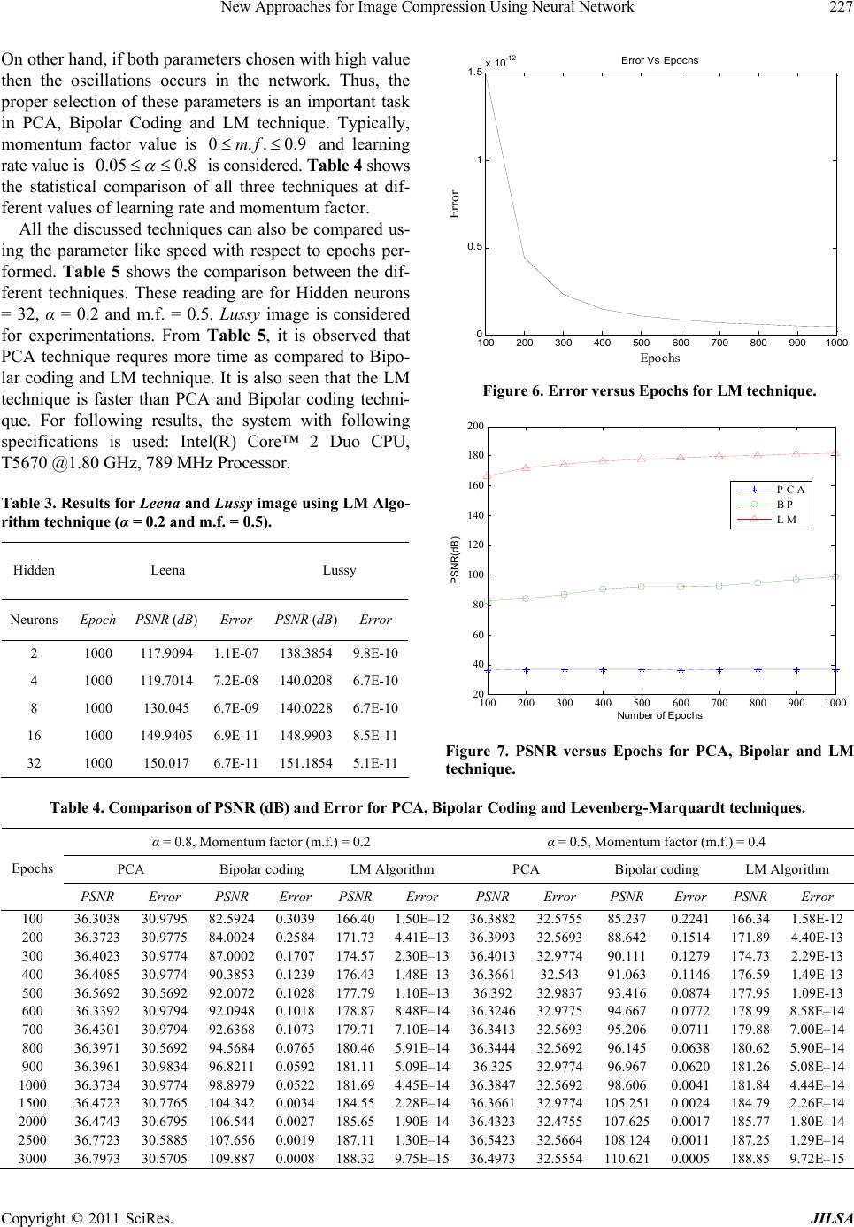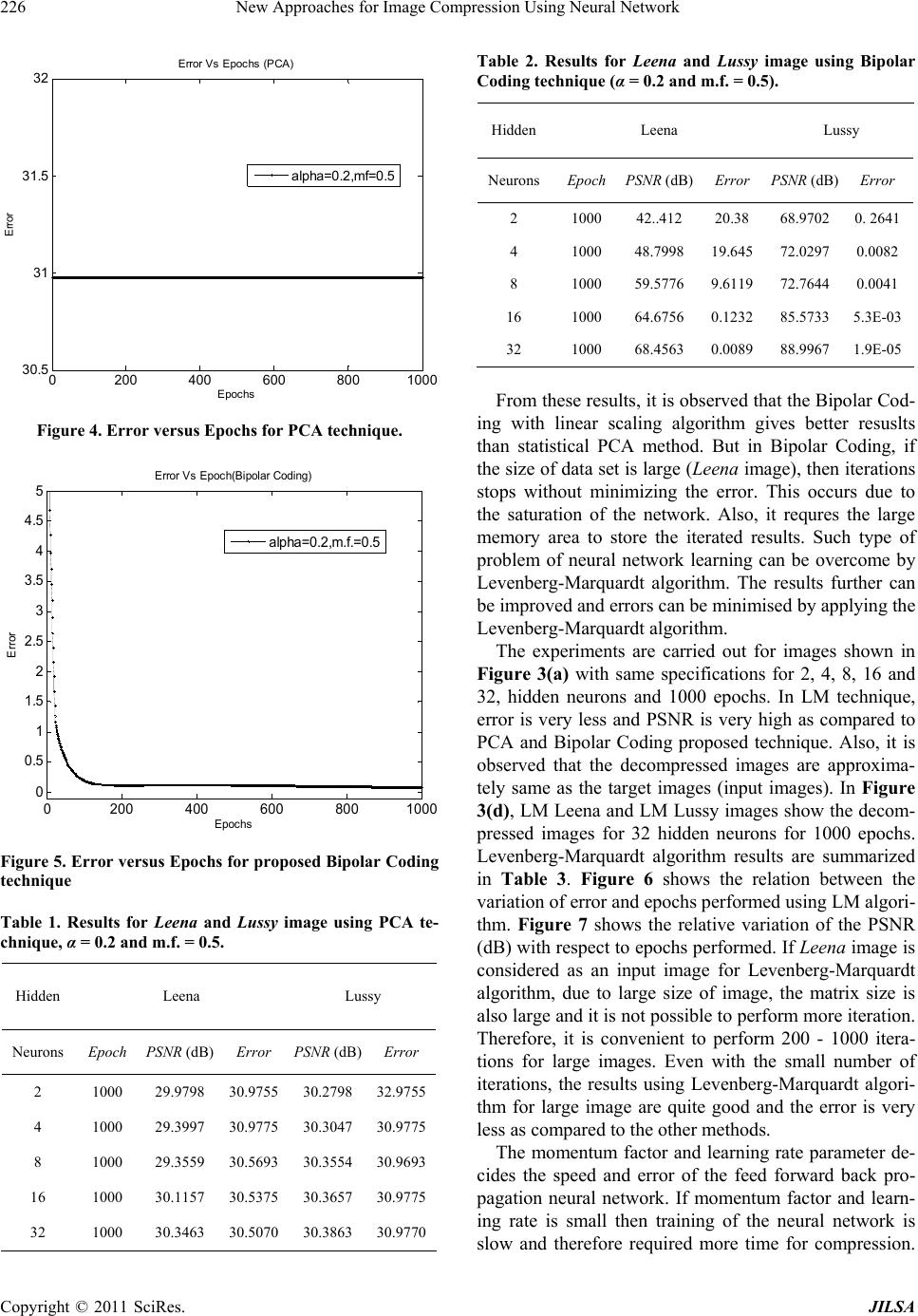 New Approaches for Image Compression Using Neural Network 226 0200 400 600 8001000 30.5 31 31.5 32 E poc hs E rror E rror V s Ep ochs (P CA ) alpha=0.2,mf=0.5 Figure 4. Error versus Epochs for PCA technique. 0200 400600800 1000 0 0.5 1 1.5 2 2.5 3 3.5 4 4.5 5 E poc hs Error E rror V s Epoch(Bi pol ar Codi ng) alpha=0.2,m.f.=0.5 Figure 5. Error versus Epochs for proposed Bipolar Coding technique Table 1. Results for Leena and Lussy image using PCA te- chnique, α = 0.2 a nd m.f. = 0.5. Hidden Leena Lussy Neurons Epoch PSNR (dB) Error PSNR (dB) Error 2 1000 29.9798 30.9755 30.2798 32.9755 4 1000 29.3997 30.9775 30.3047 30.9775 8 1000 29.3559 30.5693 30.3554 30.9693 16 1000 30.1157 30.5375 30.3657 30.9775 32 1000 30.3463 30.5070 30.3863 30.9770 Table 2. Results for Leena and Lussy image using Bipolar Coding technique (α = 0.2 and m.f. = 0.5). HiddenLeena Lussy Neurons Epoch PSNR (dB) Error PSNR (dB) Error 2 1000 42..41220.38 68.97020. 2641 4 1000 48.799819.645 72.02970.0082 8 1000 59.57769.6119 72.76440.0041 16 1000 64.67560.1232 85.57335.3E-03 32 1000 68.45630.0089 88.99671.9E-05 From these results, it is observed that the Bipolar Cod- ing with linear scaling algorithm gives better resuslts than statistical PCA method. But in Bipolar Coding, if the size of data set is large (Leena image), then iterations stops without minimizing the error. This occurs due to the saturation of the network. Also, it requres the large memory area to store the iterated results. Such type of problem of neural network learning can be overcome by Levenberg-Marquardt algorithm. The results further can be improved and errors can be minimised by applying the Levenberg-Marquardt algorithm. The experiments are carried out for images shown in Figure 3(a) with same specifications for 2, 4, 8, 16 and 32, hidden neurons and 1000 epochs. In LM technique, error is very less and PSNR is very high as compared to PCA and Bipolar Coding proposed technique. Also, it is observed that the decompressed images are approxima- tely same as the target images (input images). In Figure 3(d), LM Leena and LM Lussy images show the decom- pressed images for 32 hidden neurons for 1000 epochs. Levenberg-Marquardt algorithm results are summarized in Table 3. Figure 6 shows the relation between the variation of error and epochs performed using LM algori- thm. Figure 7 shows the relative variation of the PSNR (dB) with respect to epochs performed. If Leena image is considered as an input image for Levenberg-Marquardt algorithm, due to large size of image, the matrix size is also large and it is not possible to perform more iteration. Therefore, it is convenient to perform 200 - 1000 itera- tions for large images. Even with the small number of iterations, the results using Levenberg-Marquardt algori- thm for large image are quite good and the error is very less as compared to the other methods. The momentum factor and learning rate parameter de- cides the speed and error of the feed forward back pro- pagation neural network. If momentum factor and learn- ing rate is small then training of the neural network is slow and therefore required more time for compression. Copyright © 2011 SciRes. JILSA
