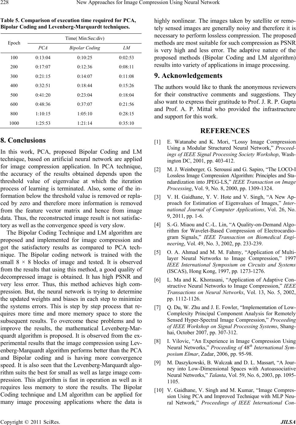 New Approaches for Image Compression Using Neural Network 228 Table 5. Comparison of execution time required for PCA, Bipolar Coding and Levenberg-Marquardt technique s. Time( Min:Sec:div) Epoch PCA Bipolar Coding LM 100 0:13:04 0:10:25 0:02:53 200 0:17:07 0:12:36 0:08:11 300 0:21:15 0:14:07 0:11:08 400 0:32:51 0:18:44 0:15:26 500 0:41:20 0:23:04 0:18:04 600 0:48:36 0:37:07 0:21:56 800 1:10:15 1:05:10 0:28:15 1000 1:25:53 1:21:14 0:35:10 8. Conclusions In this work, PCA, proposed Bipolar Coding and LM technique, based on artificial neural network are applied for image compression application. In PCA technique, the accuracy of the results obtained depends upon the threshold value of eigenvalue at which the iteration process of learning is terminated. Also, some of the in- formation below the threshold value is removed or repla- ced by zero and therefore more information is removed from the feature vector matrix and hence from image data. Thus, the reconstructed image result is not satisfac- tory as well as the convergence speed is very slow. The Bipolar Coding Technique and LM algorithm are proposed and implemented for image compression and got the satisfactory results as compared to PCA tech- nique. The Bipolar coding network is trained with the small 8 × 8 blocks of image and tested. It is observed from the results that using this method, a good quality of decompressed image is obtained. It has high PSNR and very less error. Thus, this method achieves high com- pression. But, the neural network is trying to determine the updated weights and biases in each step to minimize the systems errors. This is step by step process that re- quires more time and more memory space to store the subsequent results. To overcome these problems and to improve the results, the mathematical Levenberg-Mar- quardt algorithm is proposed. It is observed from the ex- perimental results that the image compression using Lev- enberg-Marquardt algorithm performs better than the PCA and Bipolar coding and is having more convergence speed. It is also seen that the Levenberg-Marquardt algo- rithm suits the best for small as well as large image com- pression. This algorithm is fast in operation as well as it requires less memory to store the results. The Bipolar Coding technique and LM algorithm can be applied for many image processing applications where the data is highly nonlinear. The images taken by satellite or remo- tely sensed images are generally noisy and therefore it is necessary to perform lossless compression. The proposed methods are most suitable for such compression as PSNR is very high and less error. The adaptive nature of the proposed methods (Bipolar Coding and LM algorithm) results into variety of applications in image processing. 9. Acknowledgements The authors would like to thank the anonymous reviewers for their constructive comments and suggestions. They also want to express their gratitude to Prof. J. R. P. Gupta and Prof. A. P. Mittal who provided the infrastructure and support for this work. REFERENCES [1] E. Watanabe and K. Mori, “Lossy Image Compression Using a Modular Structured Neural Network,” Proceed- ings of IEEE Signal Processing Society Workshop, Wash- ington DC, 2001, pp. 403-412. [2] M. J. Weinberger, G. Seroussi and G. Sapiro, “The LOCO-I Lossless Image Compression Algorithm: Principles and Sta- ndardization into JPEG-LS,” IEEE Transaction on Image Processing, Vol. 9, No. 8, 2000, pp. 1309-1324. [3] V. H. Gaidhane, Y. V. Hote and V. Singh, “A New Ap- proach for Estimation of Eigenvalues of Images,” Inter- national Journal of Computer Applications, Vol. 26, No. 9, 2011, pp. 1-6. [4] S.-G. Miaou and C.-L. Lin, “A Quality-on-Demand Algo- rithm for Wavelet-Based Compression of Electrocardio- gram Signals,” IEEE Transaction on Biomedical Engi- neering, Vol. 49, No. 3, 2002, pp. 233-239. [5] O. A. Ahmad and M. M. Fahmy, “Application of Multi- layer Neural Networks to Image Compression,” 1997 IEEE International Symposium on Circuits and Systems (ISCAS), Hong Kong, 1997, pp. 1273-1276. [6] L. Ma and K. Khorasani, “Application of Adaptive Con- structive Neural Networks to Image Compression,” IEEE Transactions on Neural Networks, Vol. 13, No. 5, 2002, pp. 1112-1126. [7] Q. Du, W. Zhu and J. E. Fowler, “Implementation of Low- Complexity Principal Component Analysis for Remotely Sensed Hyper-Spectral Image Compression,” Proceeding of IEEE Workshop on Signal Processing Systems, Shang- hai, October 2007, pp. 307-312. [8] I. Vilovic, “An Experience in Image Compression Using Neural Networks,” Proceeding of 48th International Sym- posium Elmar, Zadar, 2006, pp. 95-98. [9] M. Daszykowski, B. Walczak and D. L. Massart, “A Jour- ney into Low-Dimensional Spaces with Autoassociative Neural Networks,” Talanta, Vol. 59, No. 6, 2003, pp. 1095- 1105. [10] V. Gaidhane, V. Singh and M. Kumar, “Image Compres- sion Using PCA and Improved Technique with MLP Neu- ral Network,” Proceedings of IEEE International Con- Copyright © 2011 SciRes. JILSA