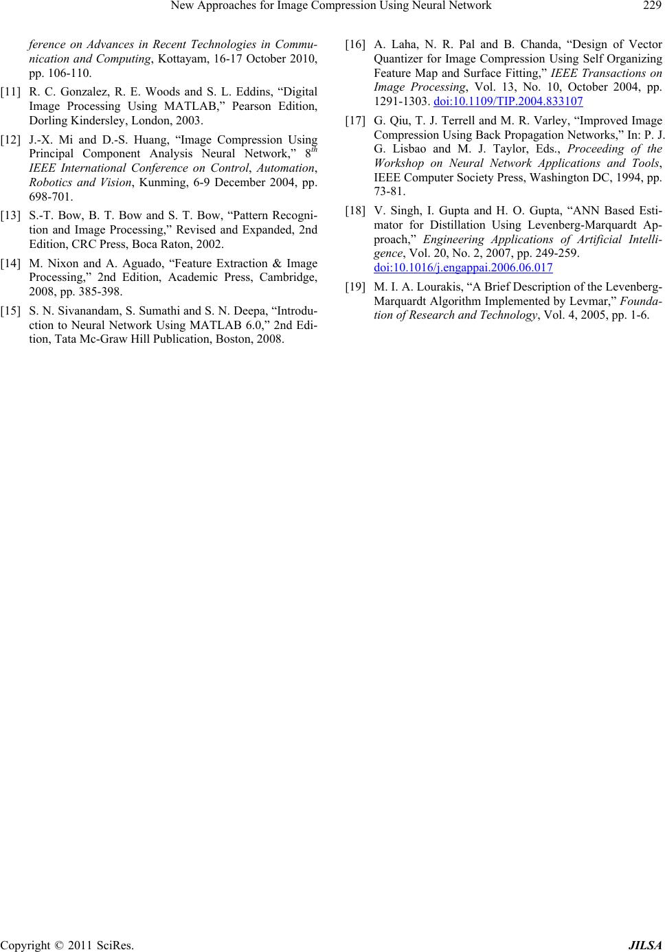 New Approaches for Image Compression Using Neural Network229 ference on Advances in Recent Technologies in Commu- nication and Computing, Kottayam, 16-17 October 2010, pp. 106-110. [11] R. C. Gonzalez, R. E. Woods and S. L. Eddins, “Digital Image Processing Using MATLAB,” Pearson Edition, Dorling Kindersley, London, 2003. [12] J.-X. Mi and D.-S. Huang, “Image Compression Using Principal Component Analysis Neural Network,” 8th IEEE International Conference on Control, Automation, Robotics and Vision, Kunming, 6-9 December 2004, pp. 698-701. [13] S.-T. Bow, B. T. Bow and S. T. Bow, “Pattern Recogni- tion and Image Processing,” Revised and Expanded, 2nd Edition, CRC Press, Boca Raton, 2002. [14] M. Nixon and A. Aguado, “Feature Extraction & Image Processing,” 2nd Edition, Academic Press, Cambridge, 2008, pp. 385-398. [15] S. N. Sivanandam, S. Sumathi and S. N. Deepa, “Introdu- ction to Neural Network Using MATLAB 6.0,” 2nd Edi- tion, Tata Mc-Graw Hill Publication, Boston, 2008. [16] A. Laha, N. R. Pal and B. Chanda, “Design of Vector Quantizer for Image Compression Using Self Organizing Feature Map and Surface Fitting,” IEEE Transactions on Image Processing, Vol. 13, No. 10, October 2004, pp. 1291-1303. doi:10.1109/TIP.2004.833107 [17] G. Qiu, T. J. Terrell and M. R. Varley, “Improved Image Compression Using Back Propagation Networks,” In: P. J. G. Lisbao and M. J. Taylor, Eds., Proceeding of the Workshop on Neural Network Applications and Tools, IEEE Computer Society Press, Washington DC, 1994, pp. 73-81. [18] V. Singh, I. Gupta and H. O. Gupta, “ANN Based Esti- mator for Distillation Using Levenberg-Marquardt Ap- proach,” Engineering Applications of Artificial Intelli- gence, Vol. 20, No. 2, 2007, pp. 249-259. doi:10.1016/j.engappai.2006.06.017 [19] M. I. A. Lourakis, “A Brief Description of the Levenberg- Marquardt Algorithm Implemented by Levmar,” Founda- tion of Research and Technology, Vol. 4, 2005, pp. 1-6. Copyright © 2011 SciRes. JILSA