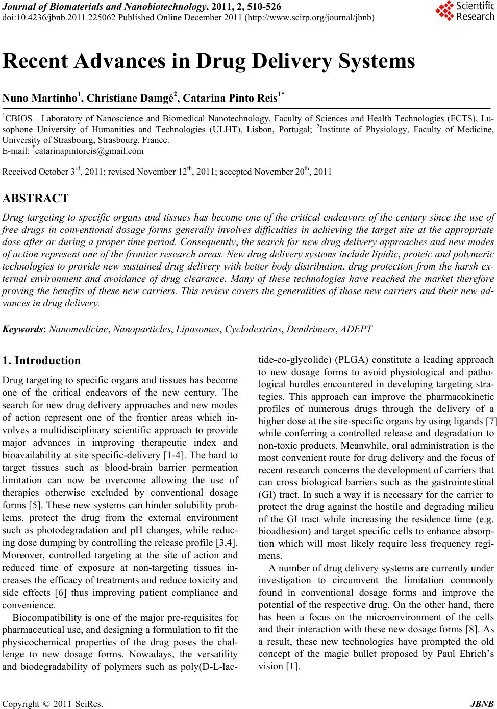 Journal of Biomaterials and Nanobiotechnology, 2011, 2, 510-526 doi:10.4236/jbnb.2011.225062 Published Online December 2011 (http://www.scirp.org/journal/jbnb) Copyright © 2011 SciRes. JBNB Recent Advances in Drug Delivery Systems Nuno Martinho1, Christiane Damgé2, Catarina Pinto Reis1* 1CBIOS—Laboratory of Nanoscience and Biomedical Nanotechnology, Faculty of Sciences and Health Technologies (FCTS), Lu- sophone University of Humanities and Technologies (ULHT), Lisbon, Portugal; 2Institute of Physiology, Faculty of Medicine, University of Strasbourg, Strasbourg, France. E-mail: *catarinapintoreis@gmail.com Received October 3rd, 2011; revised November 12th, 2011; accepted November 20th, 2011 ABSTRACT Drug targeting to specific organs and tissues has become one of the critical endeavors of the century since the use of free drugs in conventional dosage forms generally involves difficulties in achieving the target site at the appropriate dose after or during a proper time period. Consequently, the search for new drug delivery approaches and new modes of action represent one of the frontier research areas. New drug delivery systems include lipidic, proteic and polymeric technologies to provide new sustained drug delivery with better body distribution, drug protection from the harsh ex- ternal environment and avoidance of drug clearance. Many of these technologies have reached the market therefore proving the benefits of these new carriers. This review covers the generalities of those new carriers and their new ad- vances in drug delivery. Keywords: Nanomedicine, Nanoparticles, Liposomes, Cyclodextrins, Dendrimers, ADEPT 1. Introduction Drug targeting to specific organs and tissues has become one of the critical endeavors of the new century. The search for new drug delivery approaches and new modes of action represent one of the frontier areas which in- volves a multidisciplinary scientific approach to provide major advances in improving therapeutic index and bioavailability at site specific-delivery [1-4]. The hard to target tissues such as blood-brain barrier permeation limitation can now be overcome allowing the use of therapies otherwise excluded by conventional dosage forms [5]. These new systems can hinder solubility prob- lems, protect the drug from the external environment such as photodegradation and pH changes, while reduc- ing dose dumping by controlling the release profile [3,4]. Moreover, controlled targeting at the site of action and reduced time of exposure at non-targeting tissues in- creases the efficacy of treatments and reduce toxicity and side effects [6] thus improving patient compliance and convenience. Biocompatibility is one of the major pre-requisites for pharmaceutical use, and designing a formulation to fit the physicochemical properties of the drug poses the chal- lenge to new dosage forms. Nowadays, the versatility and biodegradability of polymers such as poly(D-L-lac- tide-co-glycolide) (PLGA) constitute a leading approach to new dosage forms to avoid physiological and patho- logical hurdles encountered in developing targeting stra- tegies. This approach can improve the pharmacokinetic profiles of numerous drugs through the delivery of a higher dose at the site-specific organs by using ligands [7] while conferring a controlled release and degradation to non-toxic products. Meanwhile, oral administration is the most convenient route for drug delivery and the focus of recent research concerns the development of carriers that can cross biological barriers such as the gastrointestinal (GI) tract. In such a way it is necessary for the carrier to protect the drug against the hostile and degrading milieu of the GI tract while increasing the residence time (e.g. bioadhesion) and target specific cells to enhance absorp- tion which will most likely require less frequency regi- mens. A number of drug delivery systems are currently under investigation to circumvent the limitation commonly found in conventional dosage forms and improve the potential of the respective drug. On the other hand, there has been a focus on the microenvironment of the cells and their interaction with these new dosage forms [8]. As a result, these new technologies have prompted the old concept of the magic bullet proposed by Paul Ehrich’s vision [1].