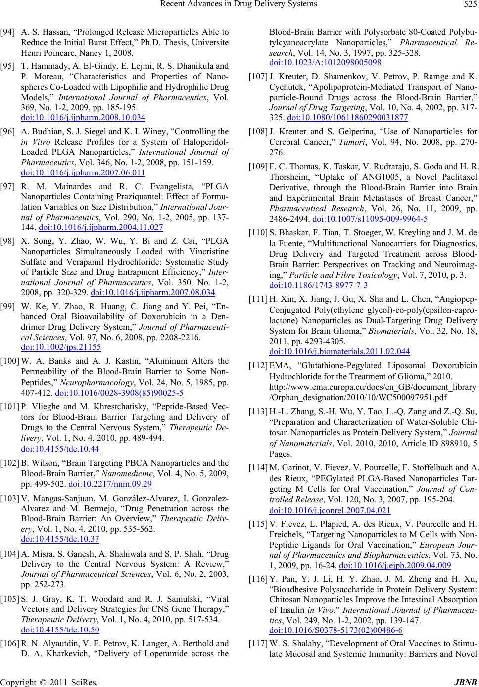 Recent Advances in Drug Delivery Systems525 [94] A. S. Hassan, “Prolonged Release Microparticles Able to Reduce the Initial Burst Effect,” Ph.D. Thesis, Universite Henri Poincare, Nancy 1, 2008. [95] T. Hammady, A. El-Gindy, E. Lejmi, R. S. Dhanikula and P. Moreau, “Characteristics and Properties of Nano- spheres Co-Loaded with Lipophilic and Hydrophilic Drug Models,” International Journal of Pharmaceutics, Vol. 369, No. 1-2, 2009, pp. 185-195. doi:10.1016/j.ijpharm.2008.10.034 [96] A. Budhian, S. J. Siegel and K. I. Winey, “Controlling the in Vitro Release Profiles for a System of Haloperidol- Loaded PLGA Nanoparticles,” International Journal of Pharmaceutics, Vol. 346, No. 1-2, 2008, pp. 151-159. doi:10.1016/j.ijpharm.2007.06.011 [97] R. M. Mainardes and R. C. Evangelista, “PLGA Nanoparticles Containing Praziquantel: Effect of Formu- lation Variables on Size Distribution,” International Jour- nal of Pharmaceutics, Vol. 290, No. 1-2, 2005, pp. 137- 144. doi:10.1016/j.ijpharm.2004.11.027 [98] X. Song, Y. Zhao, W. Wu, Y. Bi and Z. Cai, “PLGA Nanoparticles Simultaneously Loaded with Vincristine Sulfate and Verapamil Hydrochloride: Systematic Study of Particle Size and Drug Entrapment Efficiency,” Inter- national Journal of Pharmaceutics, Vol. 350, No. 1-2, 2008, pp. 320-329. doi:10.1016/j.ijpharm.2007.08.034 [99] W. Ke, Y. Zhao, R. Huang, C. Jiang and Y. Pei, “En- hanced Oral Bioavailability of Doxorubicin in a Den- drimer Drug Delivery System,” Journal of Pharmaceuti- cal Sciences, Vol. 97, No. 6, 2008, pp. 2208-2216. doi:10.1002/jps.21155 [100] W. A. Banks and A. J. Kastin, “Aluminum Alters the Permeability of the Blood-Brain Barrier to Some Non- Peptides,” Neuropharmacology, Vol. 24, No. 5, 1985, pp. 407-412. doi:10.1016/0028-3908(85)90025-5 [101] P. Vlieghe and M. Khrestchatisky, “Peptide-Based Vec- tors for Blood-Brain Barrier Targeting and Delivery of Drugs to the Central Nervous System,” Therapeutic De- livery, Vol. 1, No. 4, 2010, pp. 489-494. doi:10.4155/tde.10.44 [102] B. Wilson, “Brain Targeting PBCA Nanoparticles and the Blood-Brain Barrier,” Nanomedicine, Vol. 4, No. 5, 2009, pp. 499-502. doi:10.2217/nnm.09.29 [103] V. Mangas-Sanjuan, M. González-Alvarez, I. Gonzalez- Alvarez and M. Bermejo, “Drug Penetration across the Blood-Brain Barrier: An Overview,” Therapeutic Deliv- ery, Vol. 1, No. 4, 2010, pp. 535-562. doi:10.4155/tde.10.37 [104] A. Misra, S. Ganesh, A. Shahiwala and S. P. Sha h, “Drug Delivery to the Central Nervous System: A Review,” Journal of Pharmaceutical Sciences, Vol. 6, No. 2, 2003, pp. 252-273. [105] S. J. Gray, K. T. Woodard and R. J. Samulski, “Viral Vectors and Delivery Strategies for CNS Gene Therapy,” Therapeutic Delivery, Vol. 1, No. 4, 2010, pp. 517-534. doi:10.4155/tde.10.50 [106] R. N. Alyautdin, V. E. Petrov, K. Langer, A. Berthold and D. A. Kharkevich, “Delivery of Loperamide across the Blood-Brain Barrier with Polysorbate 80-Coated Polybu- tylcyanoacrylate Nanoparticles,” Pharmaceutical Re- search, Vol. 14, No. 3, 1997, pp. 325-328. doi:10.1023/A:1012098005098 [107] J. Kreuter, D. Shamenkov, V. Petrov, P. Ramge and K. Cychutek, “Apolipoprotein-Mediated Transport of Nano- particle-Bound Drugs across the Blood-Brain Barrier,” Journal of Drug Targeting, Vol. 10, No. 4, 2002, pp. 317- 325. doi:10.1080/10611860290031877 [108] J. Kreuter and S. Gelperina, “Use of Nanoparticles for Cerebral Cancer,” Tumori, Vol. 94, No. 2008, pp. 270- 276. [109] F. C. Thomas, K. Taskar, V. Rudraraju, S. Goda and H. R. Thorsheim, “Uptake of ANG1005, a Novel Paclitaxel Derivative, through the Blood-Brain Barrier into Brain and Experimental Brain Metastases of Breast Cancer,” Pharmaceutical Research, Vol. 26, No. 11, 2009, pp. 2486-2494. doi:10.1007/s11095-009-9964-5 [110] S. Bhaskar, F. Tian, T. Stoeger, W. Krey ling and J. M. de la Fuente, “Multifunctional Nanocarriers for Diagnostics, Drug Delivery and Targeted Treatment across Blood- Brain Barrier: Perspectives on Tracking and Neuroimag- ing,” Particle and Fibre Toxicology, Vol. 7, 2010, p. 3. doi:10.1186/1743-8977-7-3 [111] H. Xin, X. Jiang, J. Gu, X. Sha and L. Chen, “Angiopep- Conjugated Poly(ethylene glycol)-co-poly(epsilon-capro- lactone) Nanoparticles as Dual-Targeting Drug Delivery System for Brain Glioma,” Biomaterials, Vol. 32, No. 18, 2011, pp. 4293-4305. doi:10.1016/j.biomaterials.2011.02.044 [112] EMA, “Glutathione-Pegylated Liposomal Doxorubicin Hydrochloride for the Treatment of Glioma,” 2010. http://www.ema.europa.eu/docs/en_GB/document_library /Orphan_designation/2010/10/WC500097951.pdf [113] H.-L. Zhang, S.-H. Wu, Y. Tao, L.-Q. Zang and Z.-Q. Su, “Preparation and Characterization of Water-Soluble Chi- tosan Nanoparticles as Protein Delivery System,” Journal of Nanomaterials, Vol. 2010, 2010, Article ID 898910, 5 Pages. [114] M. Garinot, V. Fievez, V. Pourcelle, F. Stoffelbach and A. des Rieux, “PEGylated PLGA-Based Nanoparticles Tar- geting M Cells for Oral Vaccination,” Journal of Con- trolled Release, Vol. 120, No. 3, 2007, pp. 195-204. doi:10.1016/j.jconrel.2007.04.021 [115] V. Fievez, L. Plapied, A. des Rieux, V. Pourcelle and H. Freichels, “Targeting Nanoparticles to M Cells with Non- Peptidic Ligands for Oral Vaccination,” European Jour- nal of Pharmaceutics and Biopharmaceutics, Vol. 73, No. 1, 2009, pp. 16-24. doi:10.1016/j.ejpb.2009.04.009 [116] Y. Pan, Y. J. Li, H. Y. Zhao, J. M. Zheng and H. Xu, “Bioadhesive Polysaccharide in Protein Delivery System: Chitosan Nanoparticles Improve the Intestinal Absorption of Insulin in Vivo,” International Journal of Pharmaceu- tics, Vol. 249, No. 1-2, 2002, pp. 139-147. doi:10.1016/S0378-5173(02)00486-6 [117] W. S. Shalaby, “Development of Oral Vaccines to Stimu- late Mucosal and Systemic Immunity: Barriers and Novel Copyright © 2011 SciRes. JBNB