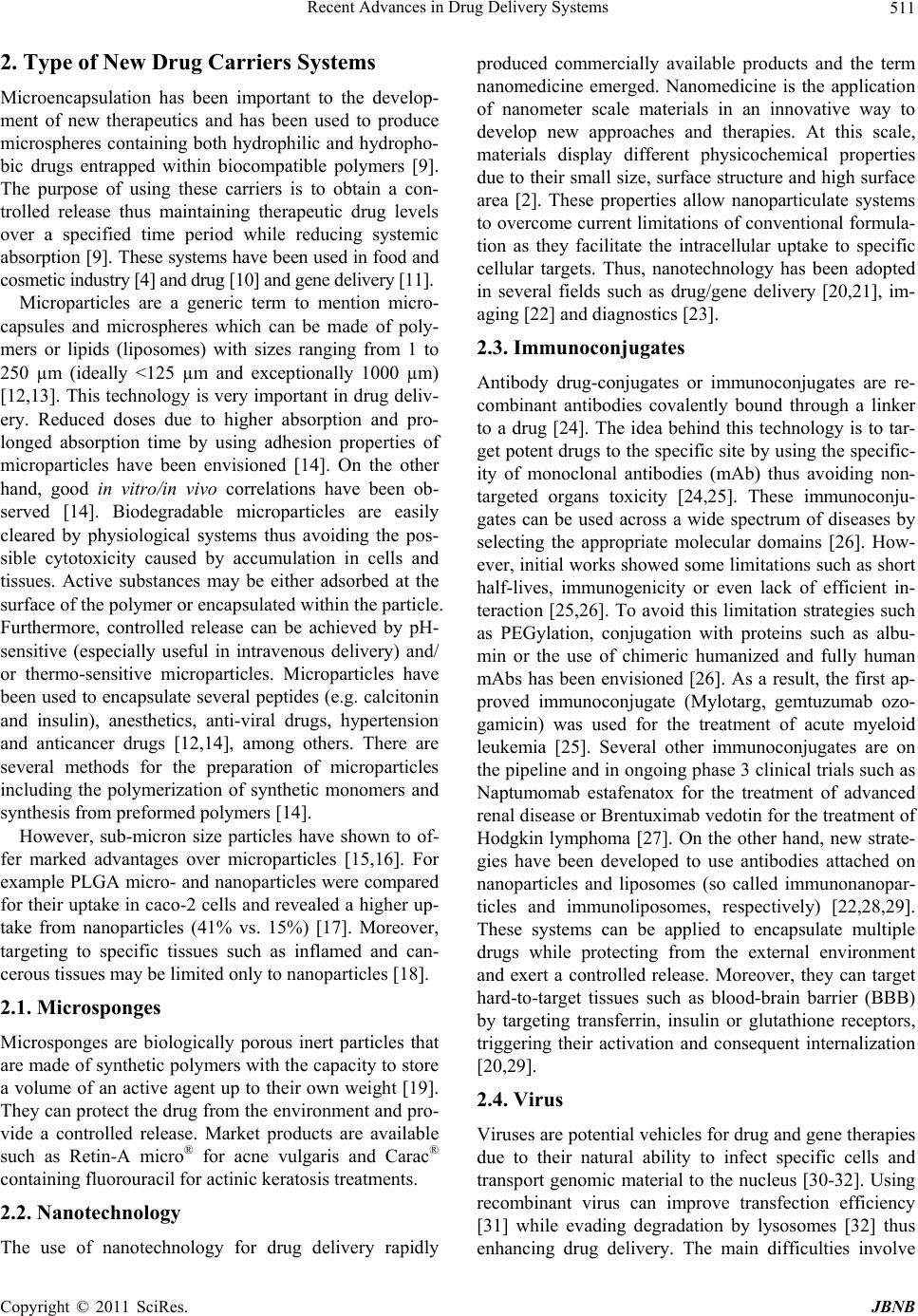 Recent Advances in Drug Delivery Systems511 2. Type of New Drug Carriers Systems Microencapsulation has been important to the develop- ment of new therapeutics and has been used to produce microspheres containing both hydrophilic and hydropho- bic drugs entrapped within biocompatible polymers [9]. The purpose of using these carriers is to obtain a con- trolled release thus maintaining therapeutic drug levels over a specified time period while reducing systemic abso rpt ion [9]. These systems have been used in food and cosmetic industry [4] and drug [10] and gene delivery [11]. Microparticles are a generic term to mention micro- capsules and microspheres which can be made of poly- mers or lipids (liposomes) with sizes ranging from 1 to 250 µm (ideally <125 µm and exceptionally 1000 µm) [12,13]. This technology is very important in drug deliv- ery. Reduced doses due to higher absorption and pro- longed absorption time by using adhesion properties of microparticles have been envisioned [14]. On the other hand, good in vitro/in vivo correlations have been ob- served [14]. Biodegradable microparticles are easily cleared by physiological systems thus avoiding the pos- sible cytotoxicity caused by accumulation in cells and tissues. Active substances may be either adsorbed at the surface of the polymer or encapsulated within the particle. Furthermore, controlled release can be achieved by pH- sensitive (especially useful in intravenous delivery) and/ or thermo-sensitive microparticles. Microparticles have been used to encapsulate several peptides (e.g. calcitonin and insulin), anesthetics, anti-viral drugs, hypertension and anticancer drugs [12,14], among others. There are several methods for the preparation of microparticles including the polymerization of synthetic monomers and synthesis from preformed polymers [14]. However, sub-micron size particles have shown to of- fer marked advantages over microparticles [15,16]. For example PLGA micro- and nanoparticles were compared for their uptake in caco-2 cells and revealed a higher up- take from nanoparticles (41% vs. 15%) [17]. Moreover, targeting to specific tissues such as inflamed and can- cerous tissues may be limited on ly to nanoparticles [18]. 2.1. Microsponges Microsponges are biologically porous inert particles that are made of synthetic poly mers with the capacity to store a volume of an active agent up to their own weight [19]. They can protect the drug from the environment and pro- vide a controlled release. Market products are available such as Retin-A micro® for acne vulgaris and Carac® containing fluorouracil for actinic keratosis treatments. 2.2. Nanotechnology The use of nanotechnology for drug delivery rapidly produced commercially available products and the term nanomedicine emerged. Nanomedicine is the application of nanometer scale materials in an innovative way to develop new approaches and therapies. At this scale, materials display different physicochemical properties due to their small size, surface structure and high surface area [2]. These properties allow nanoparticulate systems to overcome current limitatio ns of conventional formula- tion as they facilitate the intracellular uptake to specific cellular targets. Thus, nanotechnology has been adopted in several fields such as drug/gene delivery [20,21], im- aging [22] and diag no st i cs [23 ] . 2.3. Immunoconjugates Antibody drug-conjugates or immunoconjugates are re- combinant antibodies covalently bound through a linker to a drug [24]. The idea behind this technology is to tar- get potent drugs to th e specific site by using the specific- ity of monoclonal antibodies (mAb) thus avoiding non- targeted organs toxicity [24,25]. These immunoconju- gates can be used across a wide spectrum of diseases by selecting the appropriate molecular domains [26]. How- ever, initial works showed some limitations such as shor t half-lives, immunogenicity or even lack of efficient in- teraction [25,26]. To avoid this limitation strategies such as PEGylation, conjugation with proteins such as albu- min or the use of chimeric humanized and fully human mAbs has been envisioned [26]. As a result, the first ap- proved immunoconjugate (Mylotarg, gemtuzumab ozo- gamicin) was used for the treatment of acute myeloid leukemia [25]. Several other immunoconjugates are on the pipeline and in ongoing phase 3 clin ical trials such as Naptumomab estafenatox for the treatment of advanced renal disease or Brentuximab vedotin for the treatment of Hodgkin lymphoma [27]. On the other hand, new strate- gies have been developed to use antibodies attached on nanoparticles and liposomes (so called immunonanopar- ticles and immunoliposomes, respectively) [22,28,29]. These systems can be applied to encapsulate multiple drugs while protecting from the external environment and exert a controlled release. Moreover, they can target hard-to-target tissues such as blood-brain barrier (BBB) by targeting transferrin, insulin or glutathione receptors, triggering their activation and consequent internalization [20,29]. 2.4. Virus Viruses are potential vehicles for drug and gene therapies due to their natural ability to infect specific cells and transport genomic material to the nucleus [30-32]. Using recombinant virus can improve transfection efficiency [31] while evading degradation by lysosomes [32] thus enhancing drug delivery. The main difficulties involve Copyright © 2011 SciRes. JBNB