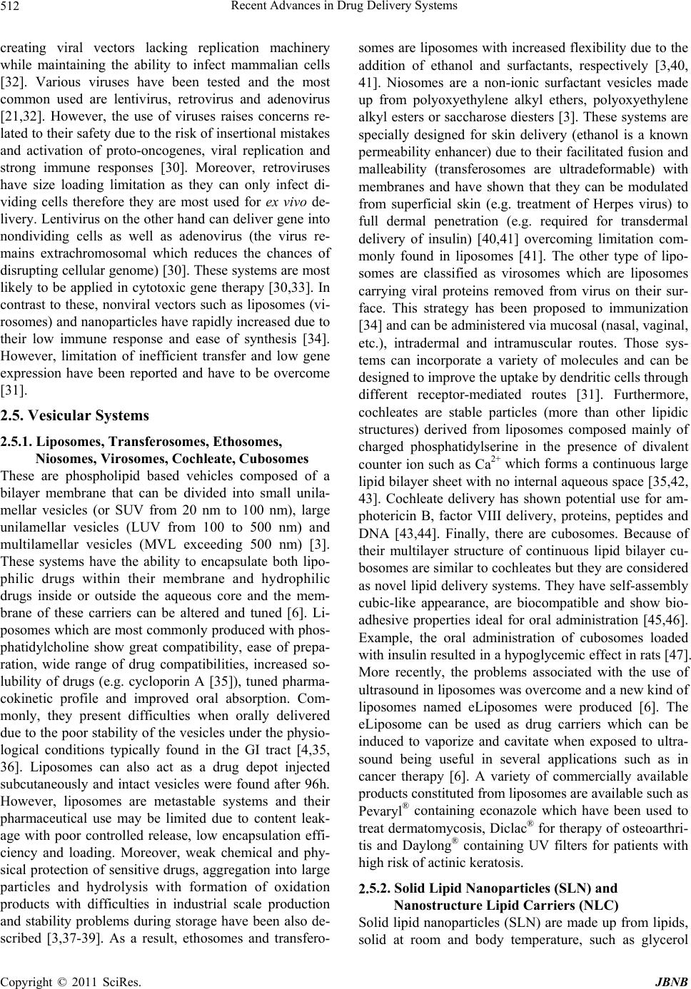Recent Advances in Drug Delivery Systems 512 creating viral vectors lacking replication machinery while maintaining the ability to infect mammalian cells [32]. Various viruses have been tested and the most common used are lentivirus, retrovirus and adenovirus [21,32]. However, the use of viruses raises concerns re- lated to their safety due to the risk of insertional mistakes and activation of proto-oncogenes, viral replication and strong immune responses [30]. Moreover, retroviruses have size loading limitation as they can only infect di- viding cells therefore they are most used for ex vivo de- livery. Lentivirus on the other hand can deliver gene into nondividing cells as well as adenovirus (the virus re- mains extrachromosomal which reduces the chances of disrupting cellular genome) [30]. These systems are most likely to be applied in cytotoxic gene therapy [30,33]. In contrast to these, nonviral vectors such as liposomes (vi- rosomes) and nanoparticles have rapidly increased due to their low immune response and ease of synthesis [34]. However, limitation of inefficient transfer and low gene expression have been reported and have to be overcome [31]. somes are liposomes with increased flexibility due to the addition of ethanol and surfactants, respectively [3,40, 41]. Niosomes are a non-ionic surfactant vesicles made up from polyoxyethylene alkyl ethers, polyoxyethylene alkyl esters or saccharose diesters [3]. These systems are specially designed for skin delivery (ethanol is a known permeability enhancer) due to their facilitated fu sion and malleability (transferosomes are ultradeformable) with membranes and have shown that they can be modulated from superficial skin (e.g. treatment of Herpes virus) to full dermal penetration (e.g. required for transdermal delivery of insulin) [40,41] overcoming limitation com- monly found in liposomes [41]. The other type of lipo- somes are classified as virosomes which are liposomes carrying viral proteins removed from virus on their sur- face. This strategy has been proposed to immunization [34] and can be administered via mucosal (nasal, vaginal, etc.), intradermal and intramuscular routes. Those sys- tems can incorporate a variety of molecules and can be designed to imp rove th e up tak e by dend ritic cells th rough different receptor-mediated routes [31]. Furthermore, cochleates are stable particles (more than other lipidic structures) derived from liposomes composed mainly of charged phosphatidylserine in the presence of divalent counter ion such as Ca2+ which forms a continuous large lipid bilayer sheet with no internal aqueous space [35,42, 43]. Cochleate delivery has shown potential use for am- photericin B, factor VIII delivery, proteins, peptides and DNA [43,44]. Finally, there are cubosomes. Because of their multilayer structure of continuous lipid bilayer cu- bosomes are similar to cochleates but they are considered as novel lipid delivery systems. They have self-assembly cubic-like appearance, are biocompatible and show bio- adhesive properties ideal for oral administration [45,46]. Example, the oral administration of cubosomes loaded with insulin resu lted in a hypo glycemic effect in rats [47]. More recently, the problems associated with the use of ultrasound in liposomes was overcome and a new kind of liposomes named eLiposomes were produced [6]. The eLiposome can be used as drug carriers which can be induced to vaporize and cavitate when exposed to ultra- sound being useful in several applications such as in cancer therapy [6]. A variety of commercially available products constituted from liposomes are available such as Pevaryl® containing econazole which have been used to treat dermatomycosis, Diclac® for therapy of osteoarthri- tis and Daylong® containing UV filters for patients with high risk of actinic keratosis. 2.5. Vesicular Systems 2.5.1. Liposomes, Transferosomes, Ethosomes, Niosomes, Virosomes, Cochleate, Cuboso mes These are phospholipid based vehicles composed of a bilayer membrane that can be divided into small unila- mellar vesicles (or SUV from 20 nm to 100 nm), large unilamellar vesicles (LUV from 100 to 500 nm) and multilamellar vesicles (MVL exceeding 500 nm) [3]. These systems have the ability to encapsulate both lipo- philic drugs within their membrane and hydrophilic drugs inside or outside the aqueous core and the mem- brane of these carriers can be altered and tuned [6]. Li- posomes which are most commonly produced with phos- phatidylcholine show great compatibility, ease of prepa- ration, wide range of drug compatibilities, increased so- lubility of drugs (e.g. cycloporin A [35]), tuned pharma- cokinetic profile and improved oral absorption. Com- monly, they present difficulties when orally delivered due to the poor stability o f the vesicles under the physio- logical conditions typically found in the GI tract [4,35, 36]. Liposomes can also act as a drug depot injected subcutaneously and intact vesicles were found after 96h. However, liposomes are metastable systems and their pharmaceutical use may be limited due to content leak- age with poor controlled release, low encapsulation effi- ciency and loading. Moreover, weak chemical and phy- sical protection of sensitive drugs, aggregation into large particles and hydrolysis with formation of oxidation products with difficulties in industrial scale production and stability problems during storage have been also de- scribed [3,37-39]. As a result, ethosomes and transfero- 2.5.2. Solid Lipid Nanoparticles (SLN) and Nanostructure Lipid Carriers (NLC) Solid lipid nanoparticles (SLN) are made up from lipids, solid at room and body temperature, such as glycerol Copyright © 2011 SciRes. JBNB