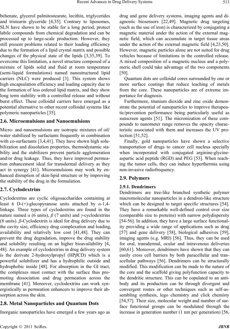 Recent Advances in Drug Delivery Systems513 behenate, glycerol palmitostearate, lecithin, triglycerides and tristearin glyceride [4,35]. Contrary to liposomes, SLN have shown to be stable for a long period, protect labile compounds from chemical degradation and can be processed up to large-scale production. However, they still present problems related to their loading efficiency due to the formation of a lipid crystal matrix and possib le changes of the physical state of the lipids [3,35,39]. To overcome this limitation, a novel structure composed of a mixture of lipids solid and fluid at room temperature (semi-liquid formulations) named nanostructured lipid carriers (NLC) were produced [3]. This system shows high encapsulation efficiency and loading capacity due to the formation of less ordered lipid matrix, and th ey show long term stability with a controlled release and without burst effect. These colloidal carriers have emerged as a potential alternative to other recent colloidal systems like polymeric nanoparticles [35]. 2.6. Microemulsions and Nanoemulsions Micro- and nanoemulsions are isotropic mixtures of oil/ water stabilized by surfactants frequently in combination with co-surfactants [3,4,41]. They have shown high solu- bilization and dissolution properties, thermodynamic sta- bility and the stabilizers prevent particle agglomeration and/or drug leakage. Thus, they have improved permea- tion enhancement ideal for transdermal delivery as they act in synergy [41]. Microemulsions may work by en- hanced disruption of skin-lipid structure or by improving the stability of the drug in the formulation. 2.7. Cyclodextrins Cyclodextrins are cyclic oligosaccharides containing at least 6 D-(+)-glucopyranose units attached by α-1,4- linkage. Three types of cyclodextrins are found in the nature named α (6 units), β (7 units) and γ-cyclodextrins (8 units). β-Cyclodextrin is ideal for drug delivery due to the cavity size, efficiency drug complexation and loading, availability and relatively low cost [41,48]. They can prevent the drug degradation, improve the drug stability and solubility resulting on an higher bioavailability [4, 48]. An example of cyclodextrins in drug delivery system is the derivate 2-hydroxylpropyl (HPβCD) which is a powerful solubilizer and has a hydrophilic outside and hydrophobic inside [48]. For absorption in the GI tract, the complexes must contact with the surface thus pro- moting dissociation and drug permeation across the membrane [41]. Moreover, cyclodextrins can work syn- ergistically as permeation enhancers to improve their ab- sorption across th e skin. 2.8. Metal Nanoparticles and Quantum Dots Inorganic nanoparticles have emerged a few years ago as drug and gene delivery systems, imaging agents and di- agnostic biosensors [22,49]. Magnetic drug targeting (such as the use of iron) is characterized by conjugating a magnetic material under the action of the external mag- netic field, which can accumulate in target tissue areas under the action of the external magnetic field [4,23,50]. However, magnetic particles alone are not suited for drug vehicles because of limitations in the controlled release. A mixed composition of a magnetic nucleus and a poly- meric shell could take advantage of the two components [50]. Quantum dots are colloidal cores surrounded by one or more surface coatings that reduce leaching of metals from the core. These nanoparticles are of extreme im- portance for diagnosis. Furthermore, titanium dioxide and zinc oxide demon- strate the potential of nanoparticles to improve therapeu- tic/prevention performance being particularly useful as sunscreen agents [51]. The micronization of these com- pounds to nanometer range removes the opacity charac- teristic associated with them and increases the UV pro- tection [51,52]. Finally, gold nanoparticles have shown a selective transportation of drugs to cancer cell nucleus specially when incorporated with conjugated arginine-glycine- aspartic acid peptide (RGD) and PEG [53]. When reach- ing the tumor cells, they can induce hyperthermia using non-invasive r a di o frequency. 2.9. Polymers 2.9.1. Dendrimers Dendrimers are tree-like branched synthetic polymer macromolecular nanoparticles in a dendron-like structure which can be designed to target specific structures [54]. They have a remarkable well-defined control over size (comparable size to proteins) with narrow polydispersity [54-56]. In addition, they have a large surface fun ctional- ity providing a wide range of applications such as drug [57] and gene delivery [58], biological adhesives [59], imaging agents (e.g. MRI) [56]. Thus, they can be used for oral, transdermal, ocular and intravenous deliveries [60,61]. Moreover, dendrimers have shown that they can easily cross cell barriers by both paracellular and tran- scellular pathways [56]. Dendrimers can be structurally modified. This modification can be made to the nature of the core and the scaffold giving polyfunction capacity to the dendritic structure. This can be copulated to an anti- body and its production can be through divergent and convergent routes or other techniques such as self-as- sembling synthesis, lego chemistry and click chemisty [54,57]. Their size, molecular weight and number of sur- face functional groups can be modulated through the increase in generation number ( 1 nm per generation) [56, Copyright © 2011 SciRes. JBNB