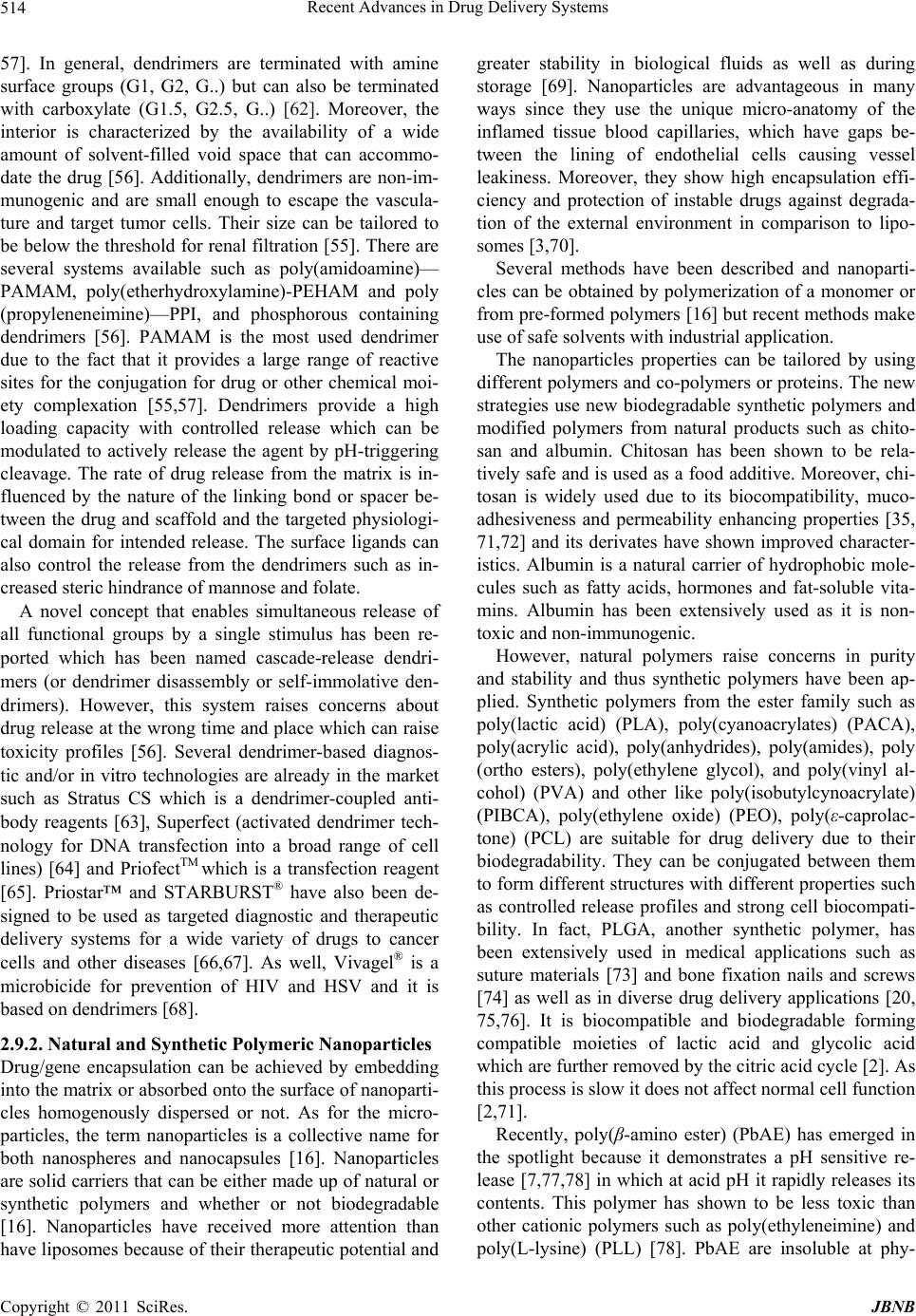 Recent Advances in Drug Delivery Systems 514 57]. In general, dendrimers are terminated with amine surface groups (G1, G2, G..) but can also be terminated with carboxylate (G1.5, G2.5, G..) [62]. Moreover, the interior is characterized by the availability of a wide amount of solvent-filled void space that can accommo- date the drug [56]. Additionally, dendrimers are non-im- munogenic and are small enough to escape the vascula- ture and target tumor cells. Their size can be tailored to be below the threshold for renal filtration [55]. There are several systems available such as poly(amidoamine)— PAMAM, poly(etherhydroxylamine)-PEHAM and poly (propyleneneimine)—PPI, and phosphorous containing dendrimers [56]. PAMAM is the most used dendrimer due to the fact that it provides a large range of reactive sites for the conjugation for drug or other chemical moi- ety complexation [55,57]. Dendrimers provide a high loading capacity with controlled release which can be modulated to actively release the agent by pH-triggering cleavage. The rate of drug release from the matrix is in- fluenced by the nature of the linking bond or spacer be- tween the drug and scaffold and the targeted physiologi- cal domain for intended release. The surface ligands can also control the release from the dendrimers such as in- creased steric hindrance of mannose and folate. A novel concept that enables simultaneous release of all functional groups by a single stimulus has been re- ported which has been named cascade-release dendri- mers (or dendrimer disassembly or self-immolative den- drimers). However, this system raises concerns about drug release at the wrong time and place which can raise toxicity profiles [56]. Several dendrimer-based diagnos- tic and/or in vitro technologies are already in the market such as Stratus CS which is a dendrimer-coupled anti- body reagents [63], Superfect (activated dendrimer tech- nology for DNA transfection into a broad range of cell lines) [64] and PriofectTM which is a transfection reagent [65]. Priostar™ and STARBURST® have also been de- signed to be used as targeted diagnostic and therapeutic delivery systems for a wide variety of drugs to cancer cells and other diseases [66,67]. As well, Vivagel® is a microbicide for prevention of HIV and HSV and it is based on dendrimers [68]. 2.9.2. Natural and Synthetic Polymeric Nanoparticles Drug/gene encapsulation can be achieved by embedding into the matrix or ab sorbed onto th e surface of nanoparti- cles homogenously dispersed or not. As for the micro- particles, the term nanoparticles is a collective name for both nanospheres and nanocapsules [16]. Nanoparticles are solid carriers that can be either made up of natural or synthetic polymers and whether or not biodegradable [16]. Nanoparticles have received more attention than have liposomes because of their therapeutic potential and greater stability in biological fluids as well as during storage [69]. Nanoparticles are advantageous in many ways since they use the unique micro-anatomy of the inflamed tissue blood capillaries, which have gaps be- tween the lining of endothelial cells causing vessel leakiness. Moreover, they show high encapsulation effi- ciency and protection of instable drugs against degrada- tion of the external environment in comparison to lipo- somes [3,70]. Several methods have been described and nanoparti- cles can be obtained by polymerization of a monomer or from pre-formed polymers [16] but recent methods make use of safe solvents with industrial applicatio n. The nanoparticles properties can be tailored by using different polymers and co-polymers or proteins. The new strategies use new biodegradable synthetic polymers and modified polymers from natural products such as chito- san and albumin. Chitosan has been shown to be rela- tively safe and is used as a food additive. Moreover, chi- tosan is widely used due to its biocompatibility, muco- adhesiveness and permeability enhancing properties [35, 71,72] and its derivates have shown improved character- istics. Albumin is a natural carrier of hydrophobic mole- cules such as fatty acids, hormones and fat-soluble vita- mins. Albumin has been extensively used as it is non- toxic and non-immunogenic. However, natural polymers raise concerns in purity and stability and thus synthetic polymers have been ap- plied. Synthetic polymers from the ester family such as poly(lactic acid) (PLA), poly(cyanoacrylates) (PACA), poly(acrylic acid), poly(anhydrides), poly(amides), poly (ortho esters), poly(ethylene glycol), and poly(vinyl al- cohol) (PVA) and other like poly(isobutylcynoacrylate) (PIBCA), poly(ethylene oxide) (PEO), poly(ε-caprolac- tone) (PCL) are suitable for drug delivery due to their biodegradability. They can be conjugated between them to form different structures with different properties such as controlled release profiles and strong cell biocompati- bility. In fact, PLGA, another synthetic polymer, has been extensively used in medical applications such as suture materials [73] and bone fixation nails and screws [74] as well as in diverse drug delivery applications [20, 75,76]. It is biocompatible and biodegradable forming compatible moieties of lactic acid and glycolic acid which are further removed by the citric acid cycle [2]. As this process is slow it does not affect normal cell function [2,71]. Recently, poly(β-amino ester) (PbAE) has emerged in the spotlight because it demonstrates a pH sensitive re- lease [7,77,78] in which at acid pH it rapidly releases its contents. This polymer has shown to be less toxic than other cationic polymers such as poly(ethyleneimine) and poly(L-lysine) (PLL) [78]. PbAE are insoluble at phy- Copyright © 2011 SciRes. JBNB