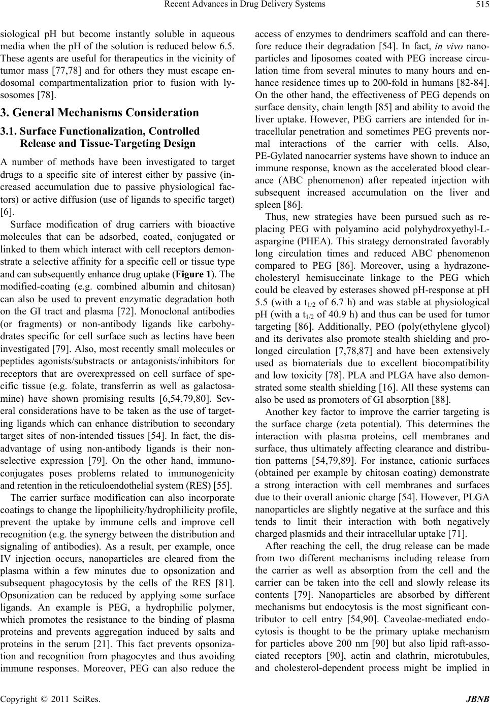 Recent Advances in Drug Delivery Systems515 siological pH but become instantly soluble in aqueous media when the pH of th e solution is reduced below 6.5. These agents are useful for therapeutics in the vicinity of tumor mass [77,78] and for others they must escape en- dosomal compartmentalization prior to fusion with ly- sosomes [78]. 3. General Mechanisms Consideration 3.1. Surface Functionalization, Controlled Release and Tissue-Targeting Design A number of methods have been investigated to target drugs to a specific site of interest either by passive (in- creased accumulation due to passive physiological fac- tors) or active diffusion (use of ligan ds to specific target) [6]. Surface modification of drug carriers with bioactive molecules that can be adsorbed, coated, conjugated or linked to them which interact with cell receptors demon- strate a selective affinity for a specific cell or tissue type and can subsequently enhance drug uptake (Figure 1). The modified-coating (e.g. combined albumin and chitosan) can also be used to prevent enzymatic degradation both on the GI tract and plasma [72]. Monoclonal antibodies (or fragments) or non-antibody ligands like carbohy- drates specific for cell surface such as lectins have been investigated [79]. Also, most recently small molecules or peptides agonists/substracts or antagonists/inhibitors for receptors that are overexpressed on cell surface of spe- cific tissue (e.g. folate, transferrin as well as galactosa- mine) have shown promising results [6,54,79,80]. Sev- eral considerations have to be taken as the use of target- ing ligands which can enhance distribution to secondary target sites of non-intended tissues [54]. In fact, the dis- advantage of using non-antibody ligands is their non- selective expression [79]. On the other hand, immuno- conjugates poses problems related to immunogenicity and retention in the reti culoendothelial system (RES) [55] . The carrier surface modification can also incorporate coatings to chan ge the lipophilicity/hydrophilicit y profile, prevent the uptake by immune cells and improve cell recognition (e.g. the synergy between the distribution and signaling of antibodies). As a result, per example, once IV injection occurs, nanoparticles are cleared from the plasma within a few minutes due to opsonization and subsequent phagocytosis by the cells of the RES [81]. Opsonization can be reduced by applying some surface ligands. An example is PEG, a hydrophilic polymer, which promotes the resistance to the binding of plasma proteins and prevents aggregation induced by salts and proteins in the serum [21]. This fact prevents opsoniza- tion and recognition from phagocytes and thus avoiding immune responses. Moreover, PEG can also reduce the access of enzymes to dendrimers scaffold and can there- fore reduce their degradation [54]. In fact, in vivo nano- particles and liposomes coated with PEG increase circu- lation time from several minutes to many hours and en- hance residence times up to 200-fold in humans [82-84]. On the other hand, the effectiveness of PEG depends on surface density, chain length [85] and ability to avoid the liver uptake. However, PEG carriers are intended for in- tracellular penetration and sometimes PEG prevents nor- mal interactions of the carrier with cells. Also, PE-Gylated nanocarrier systems have shown to induce an immune response, known as the accelerated blood clear- ance (ABC phenomenon) after repeated injection with subsequent increased accumulation on the liver and spleen [86]. Thus, new strategies have been pursued such as re- placing PEG with polyamino acid polyhydroxyethyl-L- aspargine (PHEA). This strategy demonstrated favorably long circulation times and reduced ABC phenomenon compared to PEG [86]. Moreover, using a hydrazone- cholesteryl hemisuccinate linkage to the PEG which could be cleaved by esterases showed pH-response at pH 5.5 (with a t1/2 of 6.7 h) and was stable at physiological pH (with a t1/2 of 40.9 h) and thus can be used for tumor targeting [86]. Additionally, PEO (poly(ethylene glycol) and its derivates also promote stealth shielding and pro- longed circulation [7,78,87] and have been extensively used as biomaterials due to excellent biocompatibility and low toxicity [78]. PLA and PLGA have also demon- strated some stealth shielding [16]. All these syste ms can also be used as prom o t ers of GI absorption [88] . Another key factor to improve the carrier targeting is the surface charge (zeta potential). This determines the interaction with plasma proteins, cell membranes and surface, thus ultimately affecting clearance and distribu- tion patterns [54,79,89]. For instance, cationic surfaces (obtained per example by chitosan coating) demonstrate a strong interaction with cell membranes and surfaces due to their overall anionic charge [54]. However, PLGA nanoparticles are slightly negative at the surface and this tends to limit their interaction with both negatively charged plasmids and their intracellular uptake [71]. After reaching the cell, the drug release can be made from two different mechanisms including release from the carrier as well as absorption from the cell and the carrier can be taken into the cell and slowly release its contents [79]. Nanoparticles are absorbed by different mechanisms but endocytosis is the most significant con- tributor to cell entry [54,90]. Caveolae-mediated endo- cytosis is thought to be the primary uptake mechanism for particles above 200 nm [90] but also lipid raft-asso- ciated receptors [90], actin and clathrin, microtubules, and cholesterol-dependent process might be implied in Copyright © 2011 SciRes. JBNB