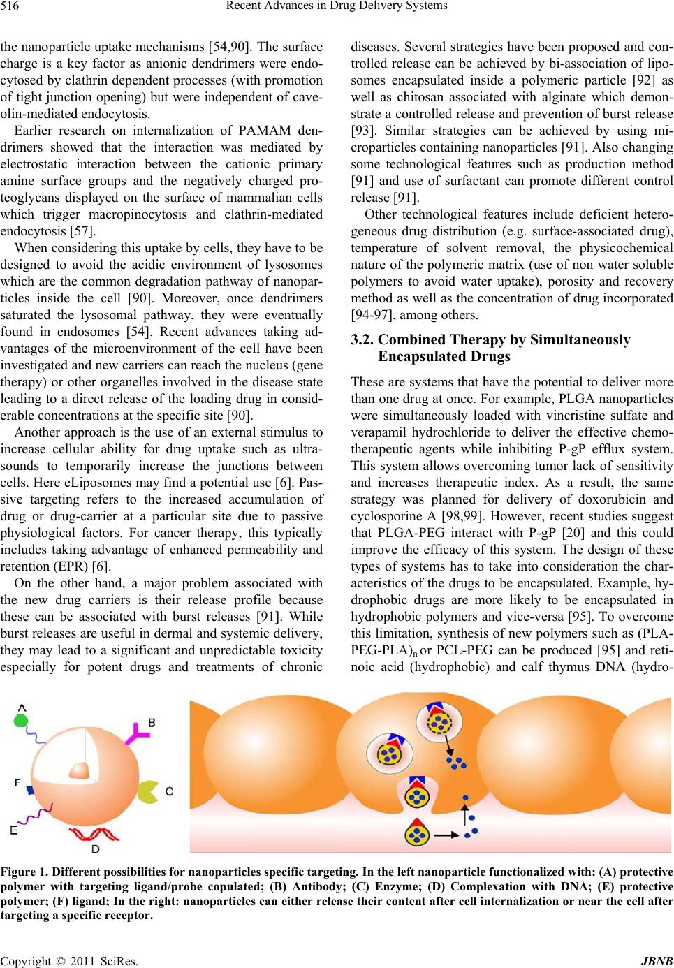 Recent Advances in Drug Delivery Systems Copyright © 2011 SciRes. JBNB 516 the nanoparticle uptake mechanisms [54,90]. The surface charge is a key factor as anionic dendrimers were endo- cytosed by clathrin dependent processes (with promotion of tight junction opening) but were independent of cave- olin-mediated endocytosis. Earlier research on internalization of PAMAM den- drimers showed that the interaction was mediated by electrostatic interaction between the cationic primary amine surface groups and the negatively charged pro- teoglycans displayed on the surface of mammalian cells which trigger macropinocytosis and clathrin-mediated endocytosis [57]. When considering this uptake by cells, they have to be designed to avoid the acidic environment of lysosomes which are the common degradation pathway of nanopar- ticles inside the cell [90]. Moreover, once dendrimers saturated the lysosomal pathway, they were eventually found in endosomes [54]. Recent advances taking ad- vantages of the microenvironment of the cell have been investigated and new carriers can reach the nucleus (gene therapy) or other organelles involved in the disease state leading to a direct release of the loading drug in consid- erable concentrations at the specific site [90]. Another approach is the use of an external stimulus to increase cellular ability for drug uptake such as ultra- sounds to temporarily increase the junctions between cells. Here eLiposomes may find a potential use [6]. Pas- sive targeting refers to the increased accumulation of drug or drug-carrier at a particular site due to passive physiological factors. For cancer therapy, this typically includes taking advantage of enhanced permeability and retention (EPR) [6]. On the other hand, a major problem associated with the new drug carriers is their release profile because these can be associated with burst releases [91]. While burst releases are useful in dermal and systemic delivery, they may lead to a significant and unpredictable toxicity especially for potent drugs and treatments of chronic diseases. Several strategies have been proposed and con- trolled release can be achieved by bi-association of lipo- somes encapsulated inside a polymeric particle [92] as well as chitosan associated with alginate which demon- strate a controlled release and prevention of burst release [93]. Similar strategies can be achieved by using mi- croparticles containing nanoparticles [91]. Also changing some technological features such as production method [91] and use of surfactant can promote different control release [91]. Other technological features include deficient hetero- geneous drug distribution (e.g. surface-associated drug), temperature of solvent removal, the physicochemical nature of the polymeric matrix (use of non water soluble polymers to avoid water uptake), porosity and recovery method as well as the concentration of drug incorporated [94-97], among others. 3.2. Combined Therapy by Simultaneously Encapsulated Drugs These are systems that have the potential to deliver more than one drug at once. For example, PLGA nanoparticles were simultaneously loaded with vincristine sulfate and verapamil hydrochloride to deliver the effective chemo- therapeutic agents while inhibiting P-gP efflux system. This system allows overcoming tumor lack of sensitivity and increases therapeutic index. As a result, the same strategy was planned for delivery of doxorubicin and cyclosporine A [98,99]. However, recent studies suggest that PLGA-PEG interact with P-gP [20] and this could improve the efficacy of this system. The design of these types of systems has to take into consideration the char- acteristics of the drugs to be encapsulated. Example, hy- drophobic drugs are more likely to be encapsulated in hydrophobic polymers and vice-versa [95]. To overcome this limitation, synthesis of new polymers such as (PLA- PEG-PLA)n or PCL-PEG can be produced [95] and reti- noic acid (hydrophobic) and calf thymus DNA (hydro- Figure 1. Different possibilities for nanoparticles specific targeting. In the left nanoparticle functionalized with: (A) protective polymer with targeting ligand/probe copulated; (B) Antibody; (C) Enzyme; (D) Complexation with DNA; (E) protective polymer; (F) ligand; In the right: nanoparticles can either release their content after cell internalization or near the cell after argeting a specific receptor. t
