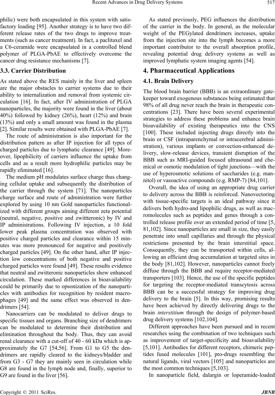 Recent Advances in Drug Delivery Systems517 philic) were both encapsulated in this system with satis- factory loading [95]. Another strategy is to have two dif- ferent release rates of the two drugs to improve treat- ments (such as cancer treatment). In fact, a paclitaxel and a C6-ceramide were encapsulated in a controlled blend polymer of PLGA-PbAE to effectively overcome the cancer drug resistance mechanisms [7]. 3.3. Carrier Distribution As stated above the RES mainly in the liver and spleen are the major obstacles to carrier systems due to their ability to internalization and removal from systemic cir- culation [16]. In fact, after IV administration of PLGA nanoparticles, the majority were found in the liv er (about 40%) followed by kidney (26%), heart (12%) and brain (13%) and only a small amount was found in the plasma [2]. Similar results were obtained with PLGA-PbAE [7]. The route of administration is also important for the distribution pattern as after IP injection for all types of charged particles due to lymphatic clearance [49]. More- over, lipophilicity of carriers influence the uptake from cells and as a result more hydrophilic particles may be rapidly eliminated [16]. The medium pH modulates surface charge thus chang- ing cellular uptake and subsequently the distribution of the carrier through the system [71]. The nanoparticles charge surface and route of administration were further explored by using 10 nm Gold nanoparticles functional- ized with different groups aiming different zeta potential (neutral, negative, positive and zwittteronic) by IV and IP administrations. Following IV injection, a 10 fold lower peak plasma concentration was observed with positive charged particles and clearance within 15 min- utes was more pronounced for negative and positively charged particles [49]. On the other hand, after IP injec- tion low concentrations of both negative and positive charged particles were found [49]. These results evidence that neutral and zwitteronic nanop articles show enhanced circulation. These marked differences in bioavailability could be primarily due to opsonization of the nanoparti- cles with antibodies for recognition by resident macro- phages [49] and the same effect was observed in den- drimers [54]. Nanocarriers can be modulated to deliver drugs to specific tissues and organs. Branching size of dendrimers can be modulated to determine their distribution and elimination throughout the body. Thus, they can avoid renal clearance with a cut-o ff of 40 - 60 kDa which is ap - proximately the G7 [54,56]. From G1 to G5 the den- drimers are rapidly cleared to the kidneys/bladder and from G3 - G7 they are mainly seen in circulation while G8 are found in the lymph node and, finally, superior to G9 are found in the liver [56]. As stated previously, PEG influences the distribution of the carrier in the body. In general, as the molecular weight of the PEGylated dendrimers increases, uptake from the injection site into the lymph becomes a more important contributor to the overall absorption profile, revealing potential drug delivery systems as well as improved lymphatic system imaging agents [54]. 4. Pharmaceutical Applications 4.1. Brain Delivery The blood brain barrier (BBB) is an extraordinary gate- keeper toward exogenou s substan ces be ing estimated that 98% of all drug never reach the brain in therapeutic con- centrations [23]. There have been several experimental strategies to address these problems and enhance brain bioavailability of existing therapeutics into the CNS [100]. These included injecting drugs directly into the brain or CSF (intraparenchymal or intracerebral admini- stration), various implants or convection-enhanced de- livery, slow-release devices, transient disruption of the BBB such as MRI-guided focused ultrasound and che- mical or osmotic modulation of tight junctions—with the use of hyperosmotic solutions of saccharides (e.g. man- nitol) or vasoactive compounds (e.g. RMP-7) [84,101]. Overall, the idea of using an appropriate drug carrier to delivery across the BBB is reinforced. Nanovectoring with tissue-specific targets is an ideal pathway since it delivers both hydro-and lipophilic drugs, as well as mac- romolecules such as peptides and genes through a con- trolled release profile over an extended period of time [5, 81,102]. Since nanoparticles are small in size, they easily penetrate into small capillaries and through the physical restrictions presented by the brain interstitial space. Consequently, they can be transported within cells, al- lowing an efficient drug accumulation at targeted sites in the body [81,102]. However, nanoparticles cannot freely diffuse through the BBB and require receptor-mediated transporters [103]. Hence, the use of the specific peptid es for targeting the receptor-mediated transcytosis across BBB can be a successful strategy for improving drug delivery to the brain [5]. In this way, promising results have been achieved by directly delivering drugs to the brain interstitium through the design of polymer-based drug delivery systems [102,104]. Different approaches have been pursued and in recent researches using the combination of two techniques such as improvement of target-specificity and bioavailability [5,101]. Antibodies for different receptors, chimeric pep- tides fused molecules [101], pro-drugs resembling the natural ligands, viral vectors [105] and nanoparticles are the most common techniques [5,103]. In nanoparticle field, dalargin or loperamide-loaded Copyright © 2011 SciRes. JBNB