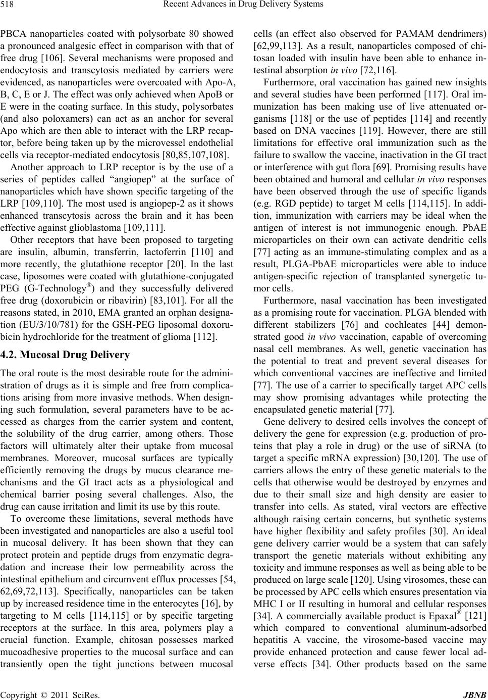 Recent Advances in Drug Delivery Systems 518 PBCA nanoparticles coated with polysorbate 80 showed a pronounced analgesic effect in comparison with that of free drug [106]. Several mechanisms were proposed and endocytosis and transcytosis mediated by carriers were evidenced, as nanoparticles were overcoated with Apo-A, B, C, E or J. The effect was only achieved when ApoB or E were in the coating surface. In this study, polysorbates (and also poloxamers) can act as an anchor for several Apo which are then able to interact with the LRP recap- tor, before being taken up by the microvessel endothelial cells via receptor-mediated endocytosis [80,85,107,108]. Another approach to LRP receptor is by the use of a series of peptides called “angiopep” at the surface of nanoparticles which have shown specific targeting of the LRP [109,110]. The most used is angiopep-2 as it shows enhanced transcytosis across the brain and it has been effective against glioblastoma [109,111]. Other receptors that have been proposed to targeting are insulin, albumin, transferrin, lactoferrin [110] and more recently, the glutathione receptor [20]. In the last case, liposomes were coated with glutathione-conjugated PEG (G-Technology®) and they successfully delivered free drug (doxorubicin or ribavirin) [83,101]. For all the reasons stated, in 2010, EMA granted an orphan designa- tion (EU/3/10/781) for the GSH-PEG liposomal doxoru- bicin hydrochloride for the treatment of glioma [112]. 4.2. Mucosal Drug Delivery The oral route is the most desirable route for the admini- stration of drugs as it is simple and free from complica- tions arising from more invasive methods. When design- ing such formulation, several parameters have to be ac- cessed as charges from the carrier system and content, the solubility of the drug carrier, among others. Those factors will ultimately alter their uptake from mucosal membranes. Moreover, mucosal surfaces are typically efficiently removing the drugs by mucus clearance me- chanisms and the GI tract acts as a physiological and chemical barrier posing several challenges. Also, the drug can cause irritatio n and limit its use by this route. To overcome these limitations, several methods have been investigated and nanoparticles are also a useful tool in mucosal delivery. It has been shown that they can protect protein and peptide drugs from enzymatic degra- dation and increase their low permeability across the intestinal epithelium and circumvent efflux processes [54, 62,69,72,113]. Specifically, nanoparticles can be taken up by increased residence time in the enterocytes [16], by targeting to M cells [114,115] or by specific targeting receptors at the surface. In this area, polymers play a crucial function. Example, chitosan possesses marked mucoadhesive properties to the mucosal surface and can transiently open the tight junctions between mucosal cells (an effect also observed for PAMAM dendrimers) [62,99,113]. As a result, nanoparticles composed of chi- tosan loaded with insulin have been able to enhance in- testinal absorptio n in vivo [72,116]. Furthermore, oral vaccination has gained new insights and several studies have been performed [117]. Oral im- munization has been making use of live attenuated or- ganisms [118] or the use of peptides [114] and recently based on DNA vaccines [119]. However, there are still limitations for effective oral immunization such as the failure to swallow the vaccine, inactivation in the GI tract or interference with gut flora [69]. Promising results have been obtained and humoral and cellular in vivo respon ses have been observed through the use of specific ligands (e.g. RGD peptide) to target M cells [114,115]. In addi- tion, immunization with carriers may be ideal when the antigen of interest is not immunogenic enough. PbAE microparticles on their own can activate dendritic cells [77] acting as an immune-stimulating complex and as a result, PLGA-PbAE microparticles were able to induce antigen-specific rejection of transplanted synergetic tu- mor cells. Furthermore, nasal vaccination has been investigated as a promising route for vaccination. PLGA blended with different stabilizers [76] and cochleates [44] demon- strated good in vivo vaccination, capable of overcoming nasal cell membranes. As well, genetic vaccination has the potential to treat and prevent several diseases for which conventional vaccines are ineffective and limited [77]. The use of a carrier to specifically target APC cells may show promising advantages while protecting the encapsulated genetic material [77]. Gene delivery to desired cells involves the concept of delivery the gene for expression (e.g. production of pro- teins that play a role in drug) or the use of siRNA (to target a specific mRNA expression) [30,120]. The use of carriers allows the entry of these genetic materials to the cells that otherwise would be destroyed by enzymes and due to their small size and high density are easier to transfer into cells. As stated, viral vectors are effective although raising certain concerns, but synthetic systems have higher flexibility and safety profiles [30]. An ideal gene delivery carrier would be a system that can safely transport the genetic materials without exhibiting any toxicity and immune responses as well as being able to be produced on large scale [120]. Using virosomes, these can be processed b y APC cel ls whic h ensure s present ation via MHC I or II resulting in humoral and cellular responses [34]. A commercially available product is Epaxal® [121] which compared to conventional aluminum-adsorbed hepatitis A vaccine, the virosome-based vaccine may provide enhanced protection and cause fewer local ad- verse effects [34]. Other products based on the same Copyright © 2011 SciRes. JBNB
